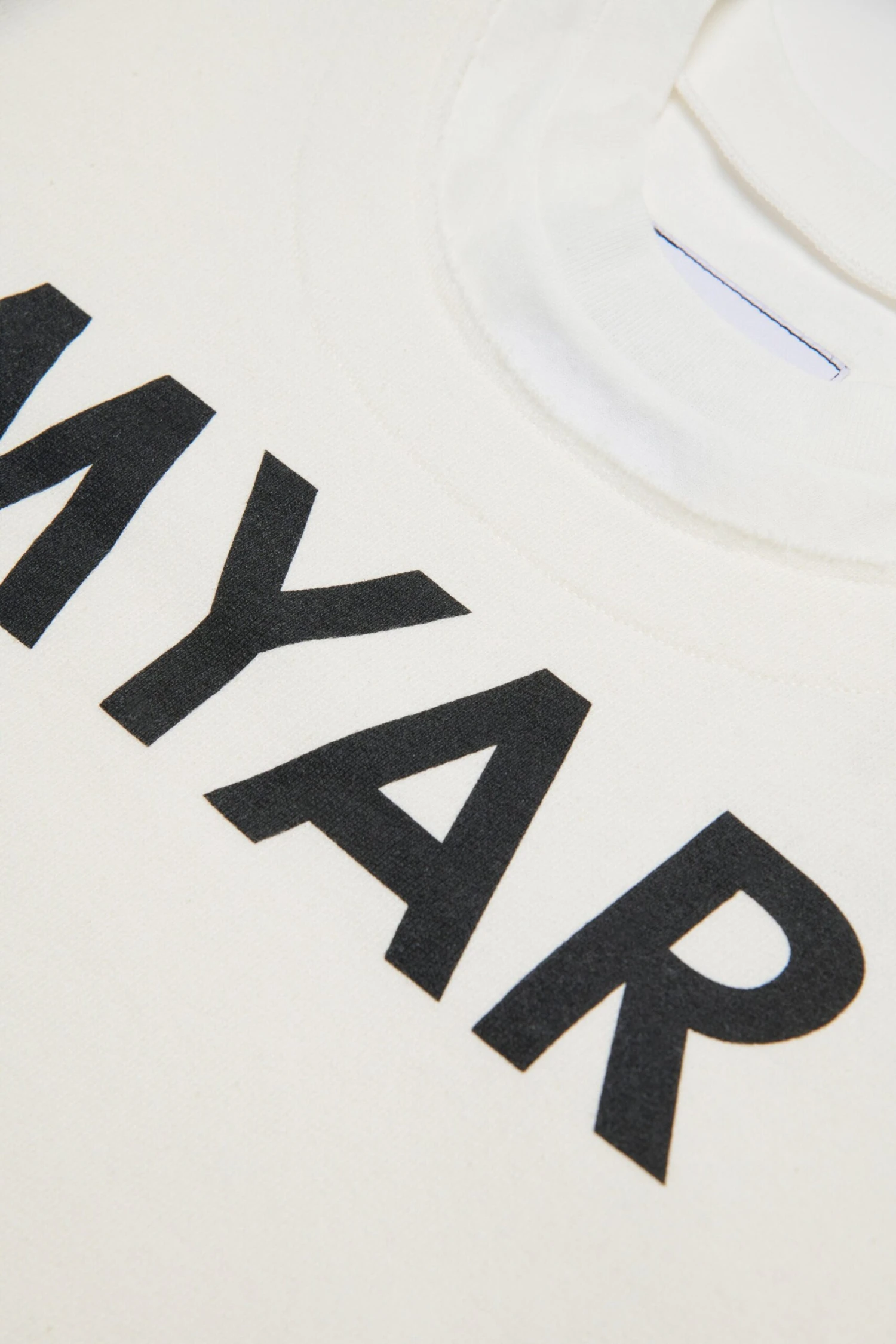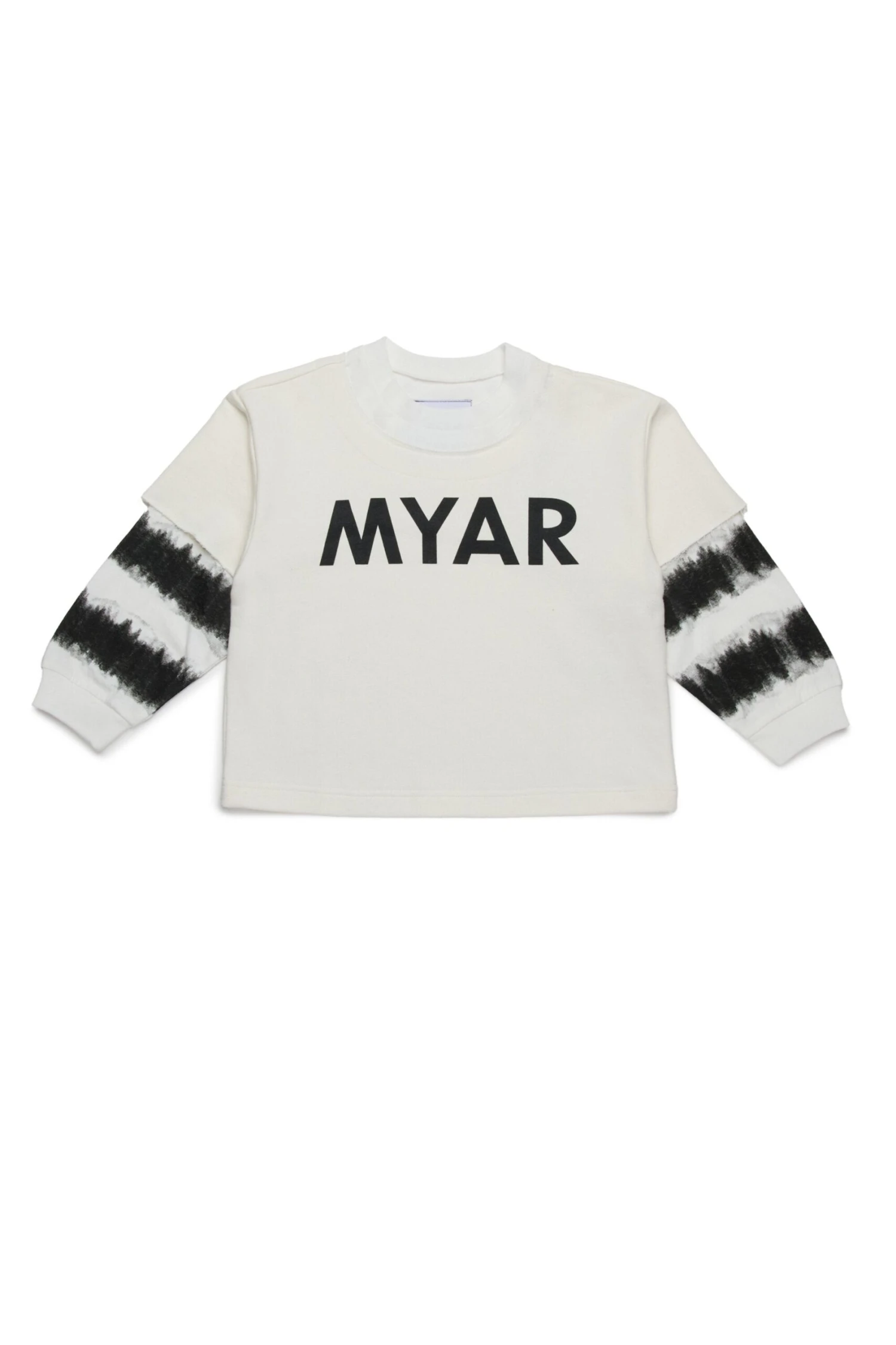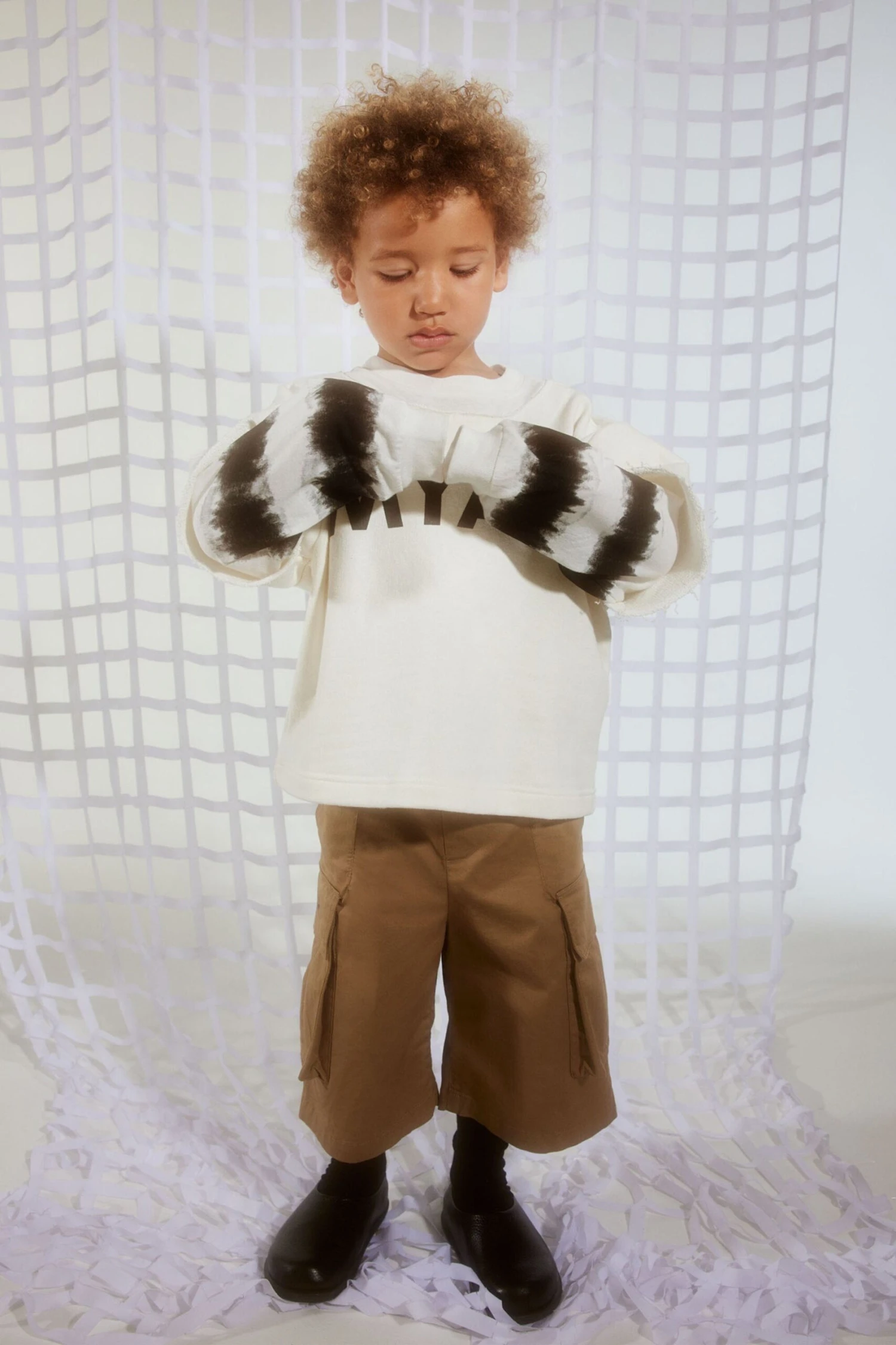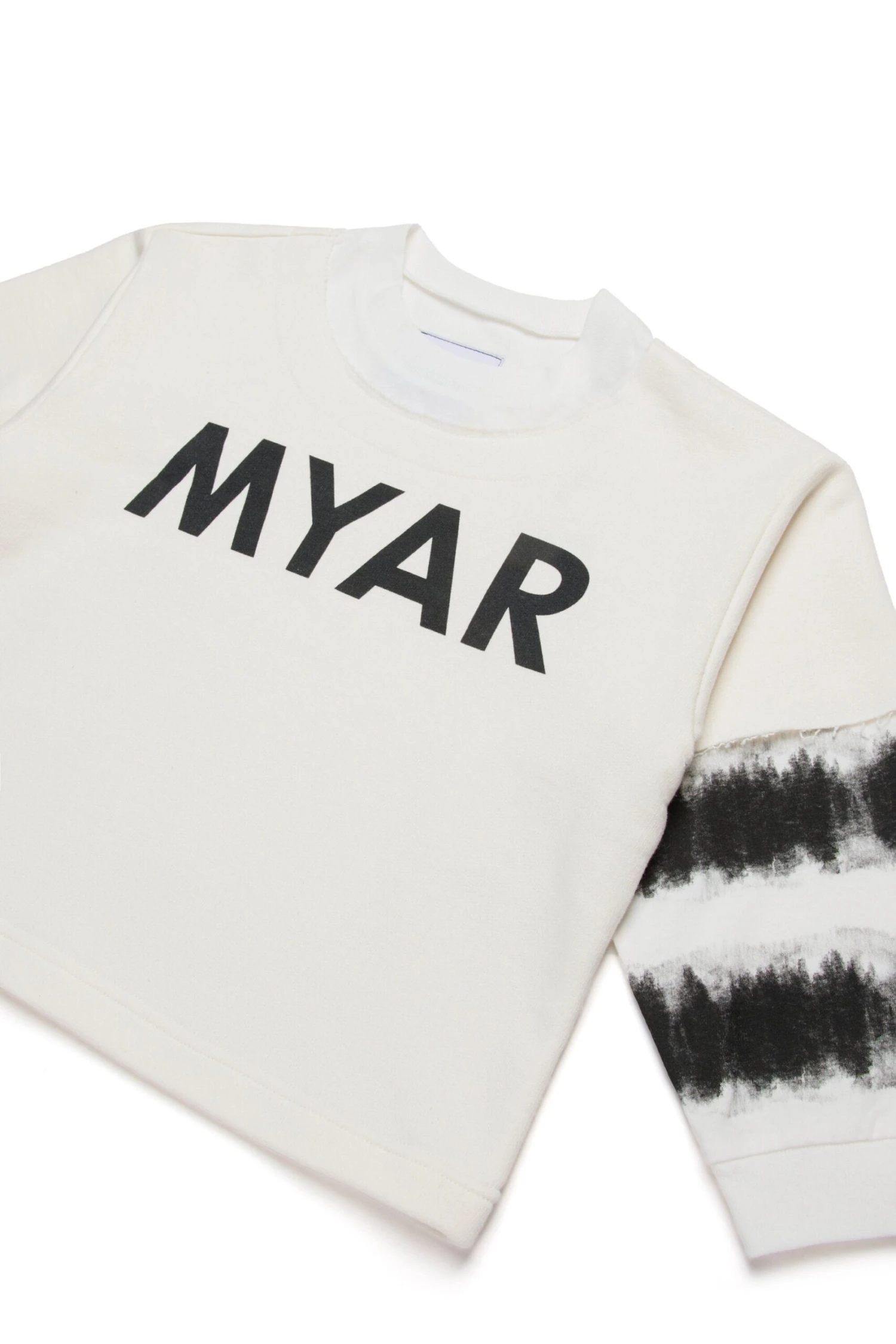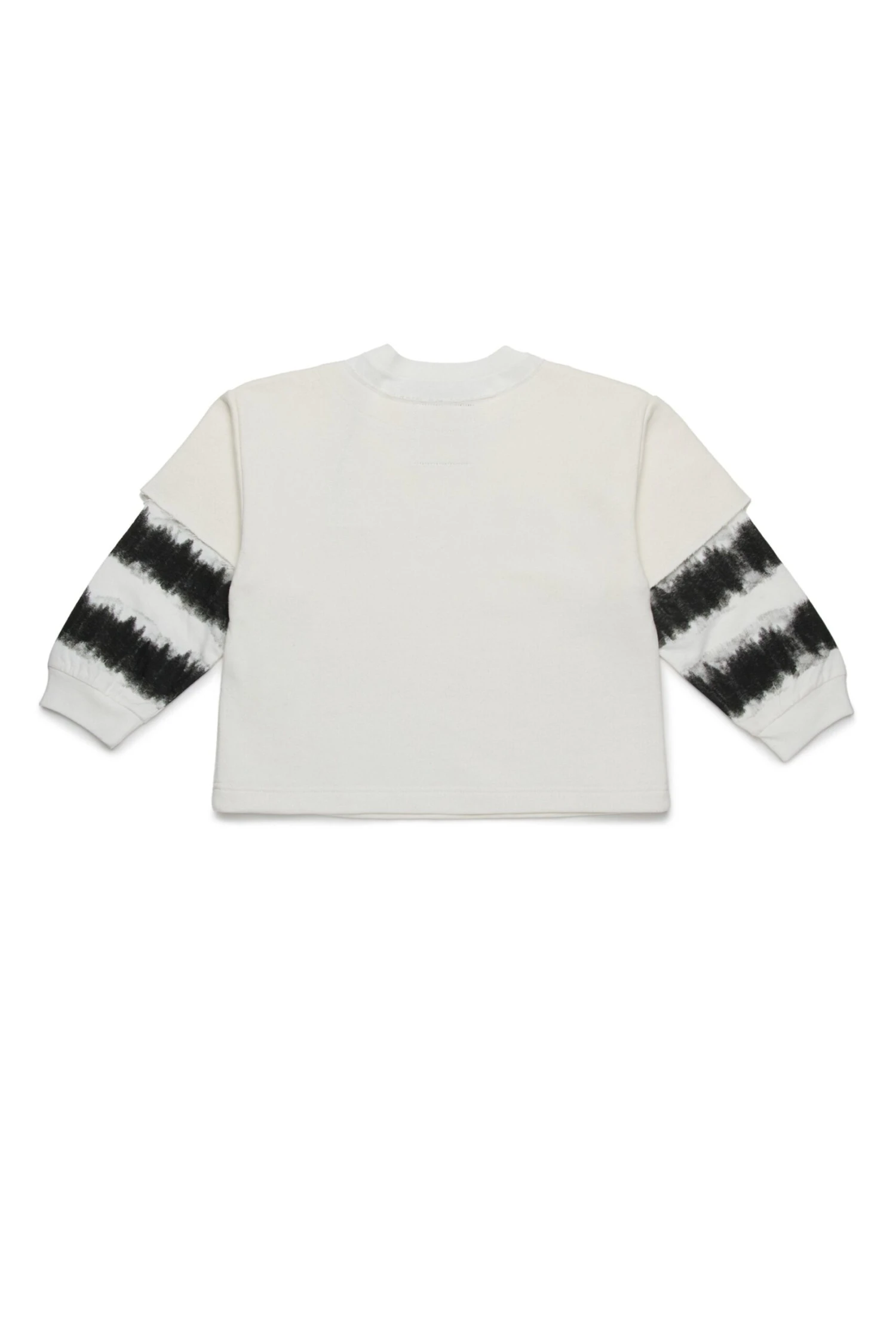 Crewneck sweatshirt made with double-layer deadstock fabric to simulate a sleeveless sweatshirt with a long-sleeved cotton shirt underneath. Silk-screen print with tye-die effect on the sleeves representing the residual oil moving in the sea.