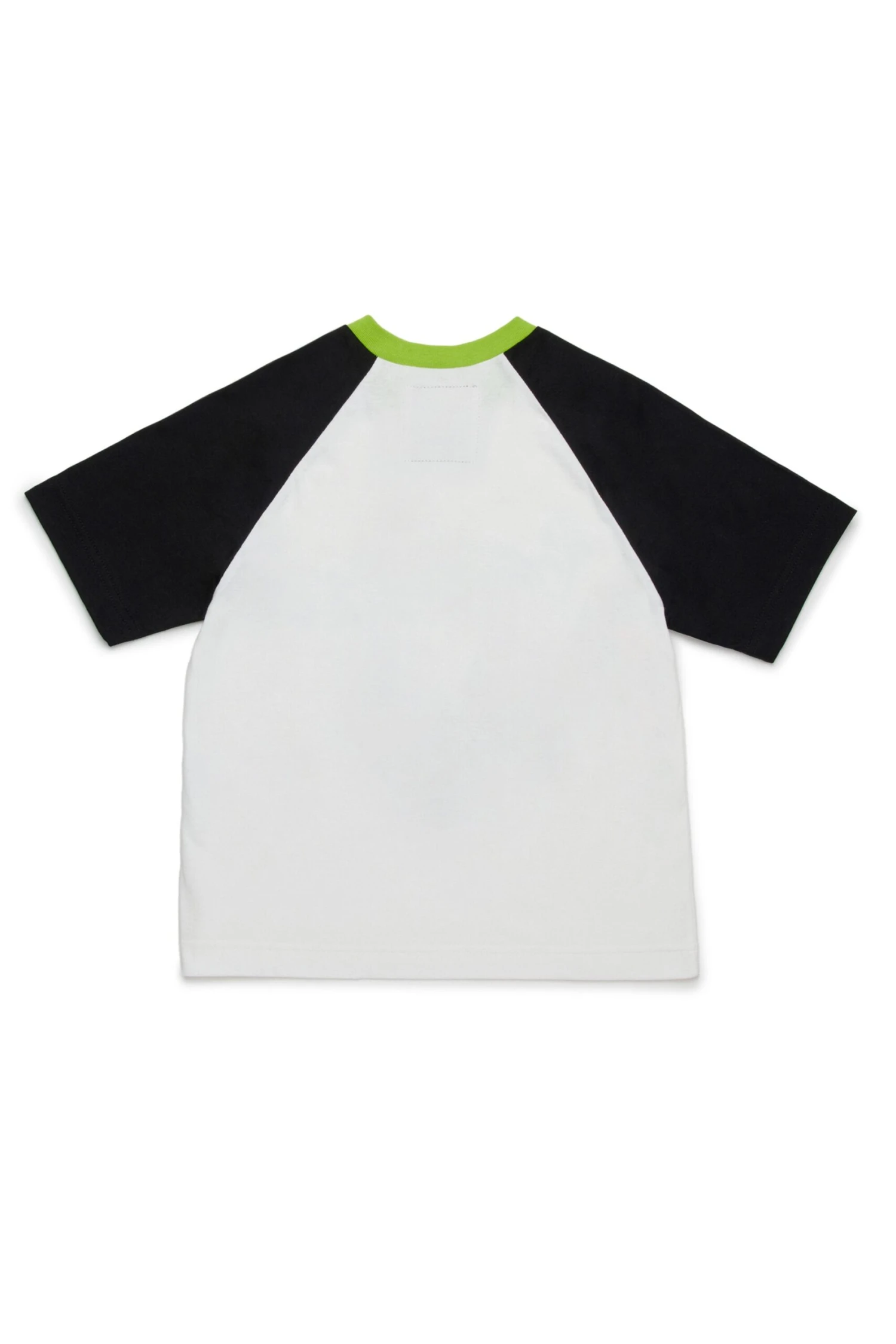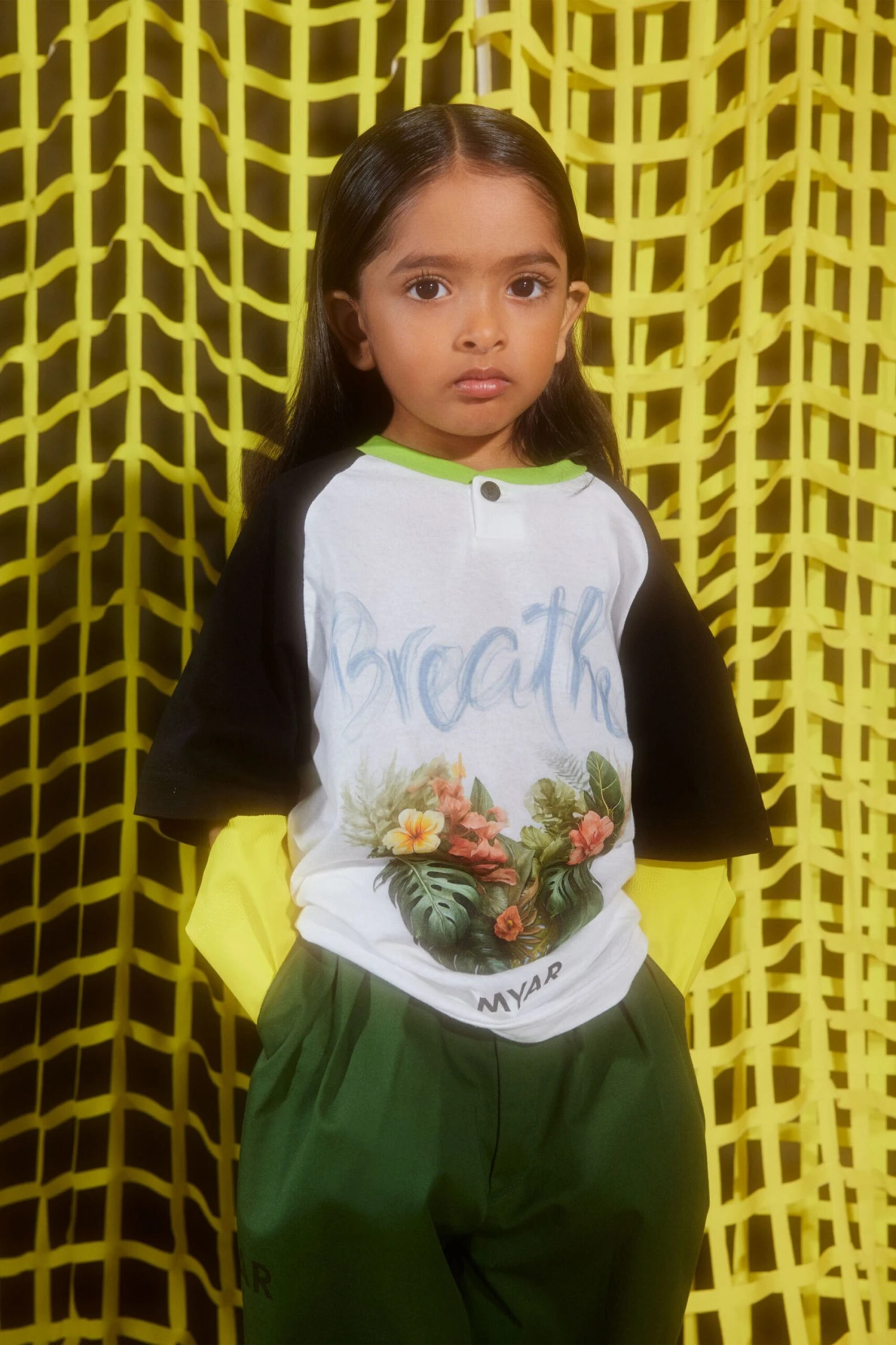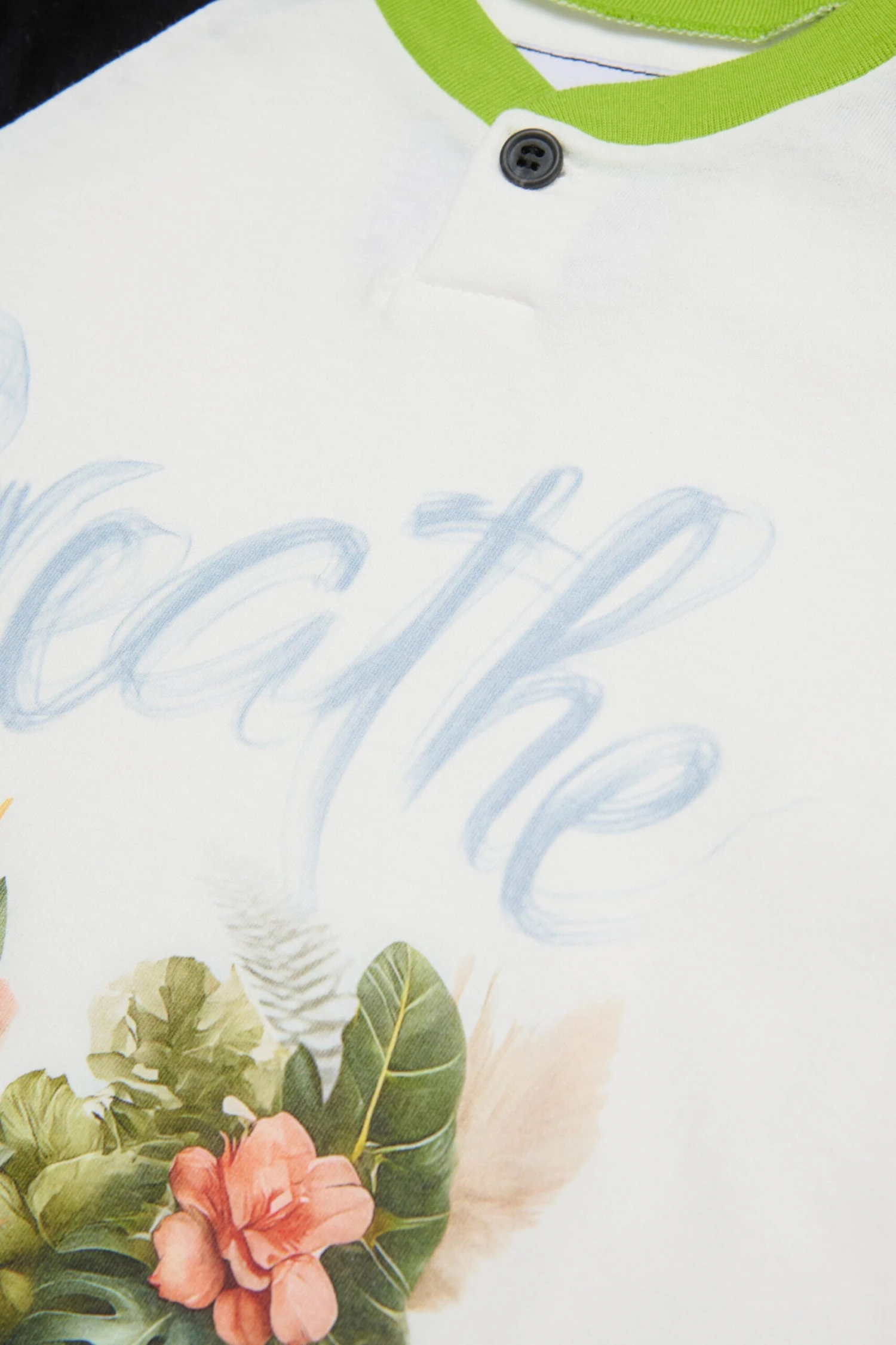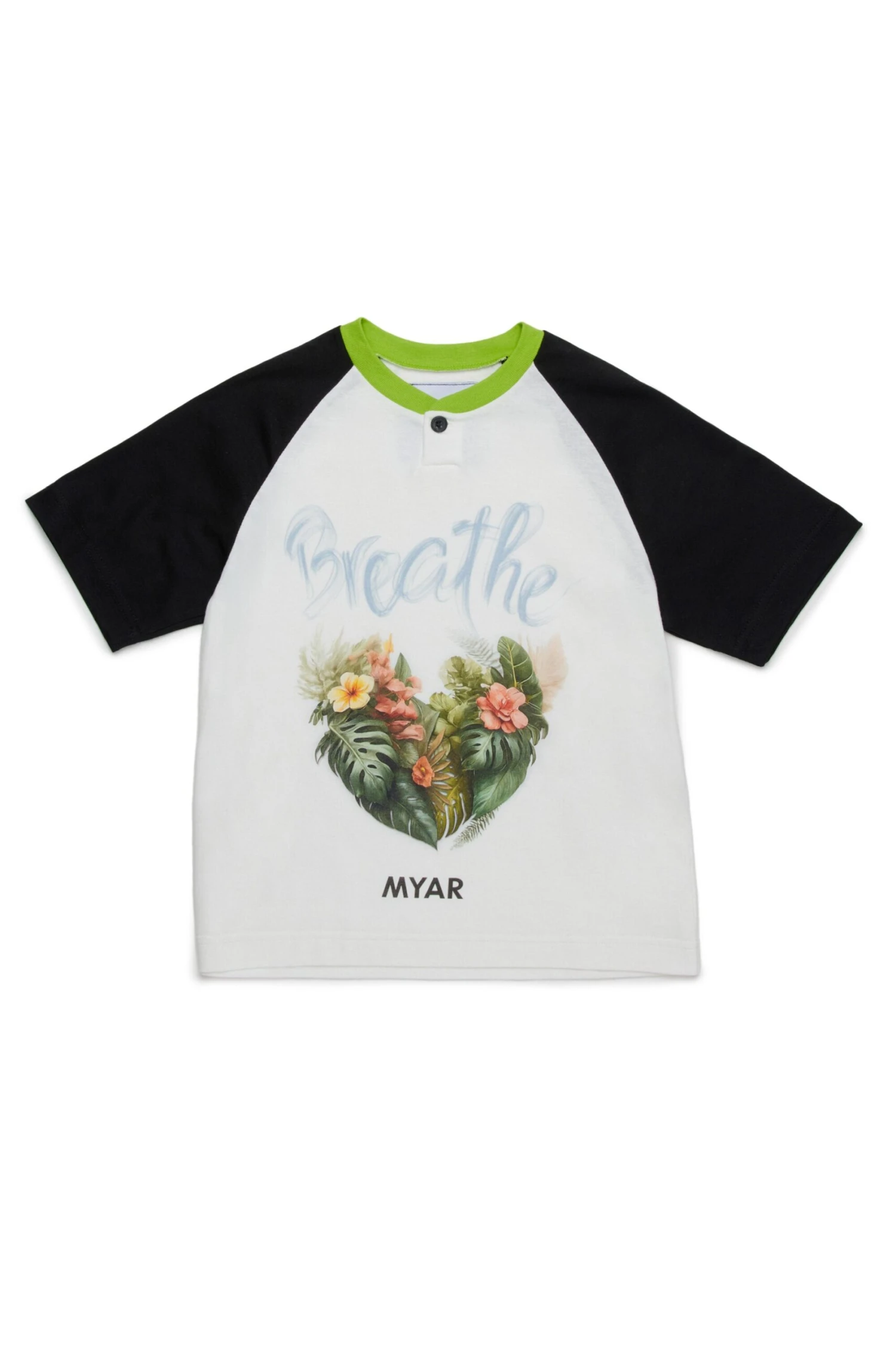 T-shirt with henley collar made with deadstock fabric and raglan sleeves with contrasting fabric. Digital print of Breathe graphics on the front.