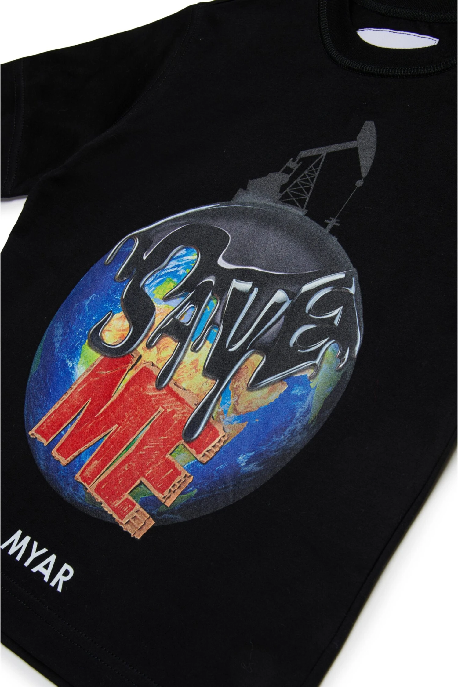 Crew-neck T-shirt made with deadstock fabric and rib on the neck. Digital print of the Save me graphics on the front.