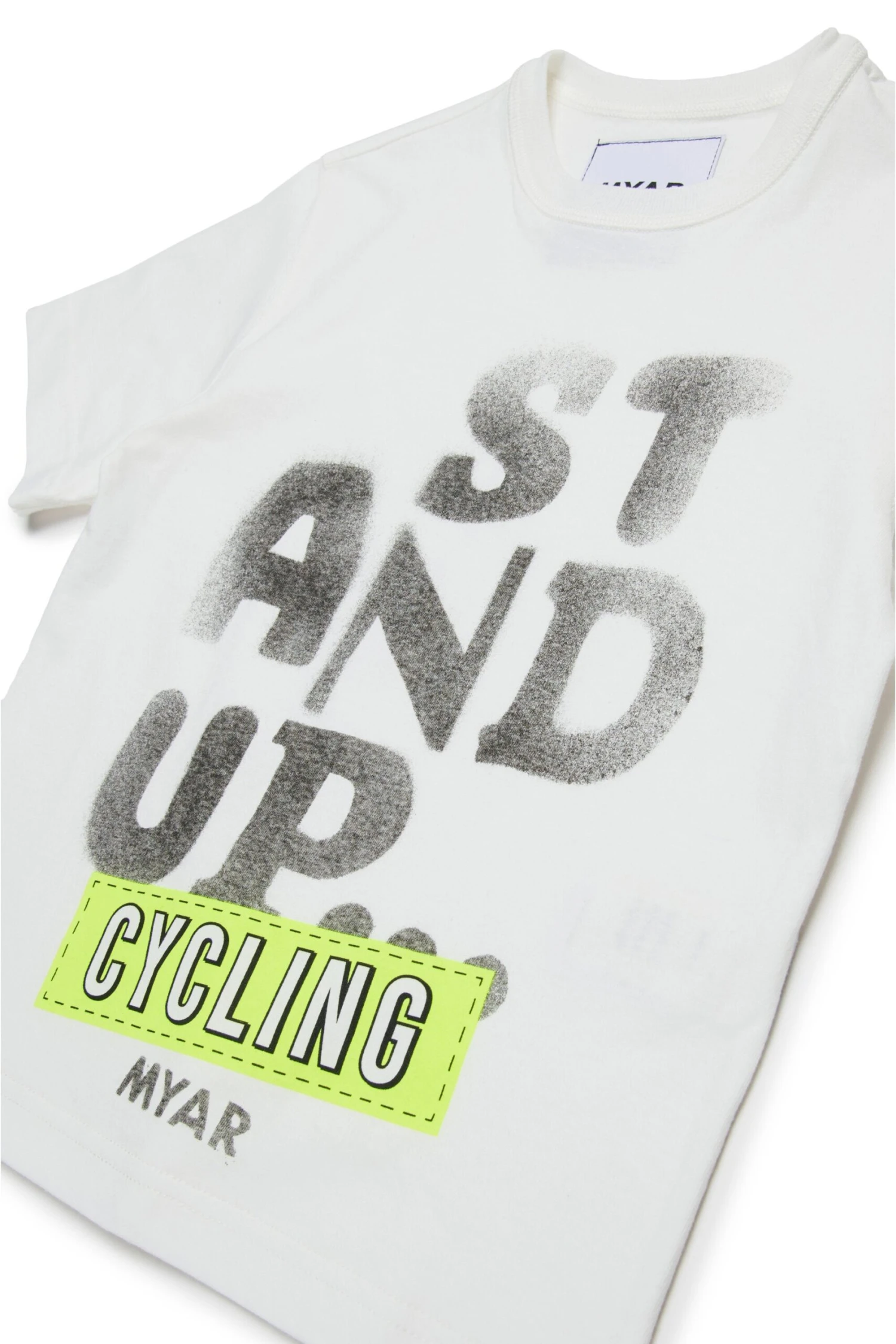Crew-neck T shirt made with deadstock fabric and rib on the neck. Silk-screen print of the Stand up graphics on the front.