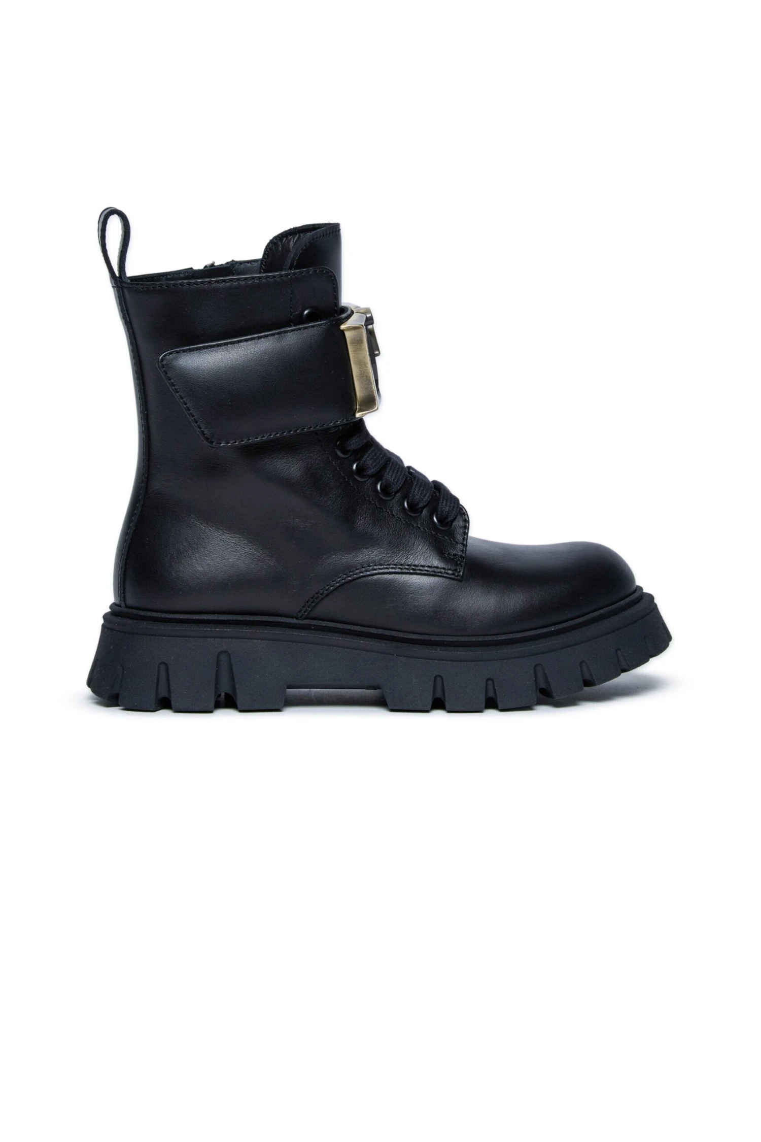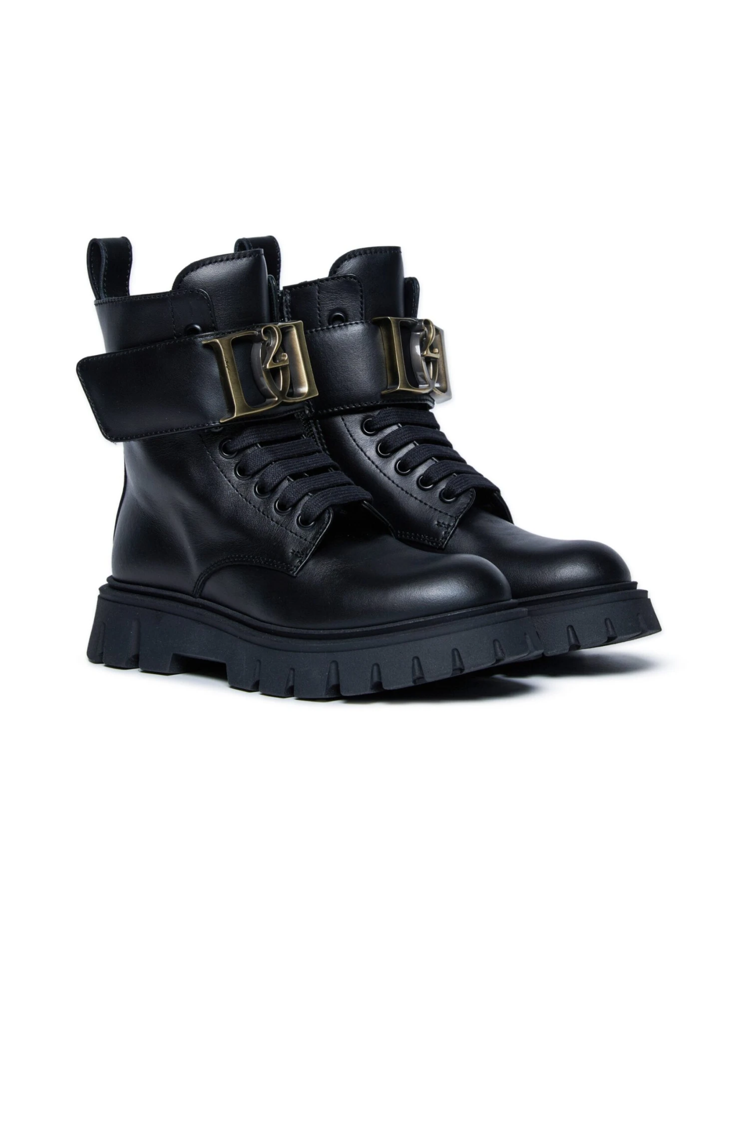 Lace-up boots with strap. Featuring a metal D2 logo on the strap. Calfskin upper and lining. Thermoplastic track sole. A distinctive design, suitable for various occasions. Made in Italy.