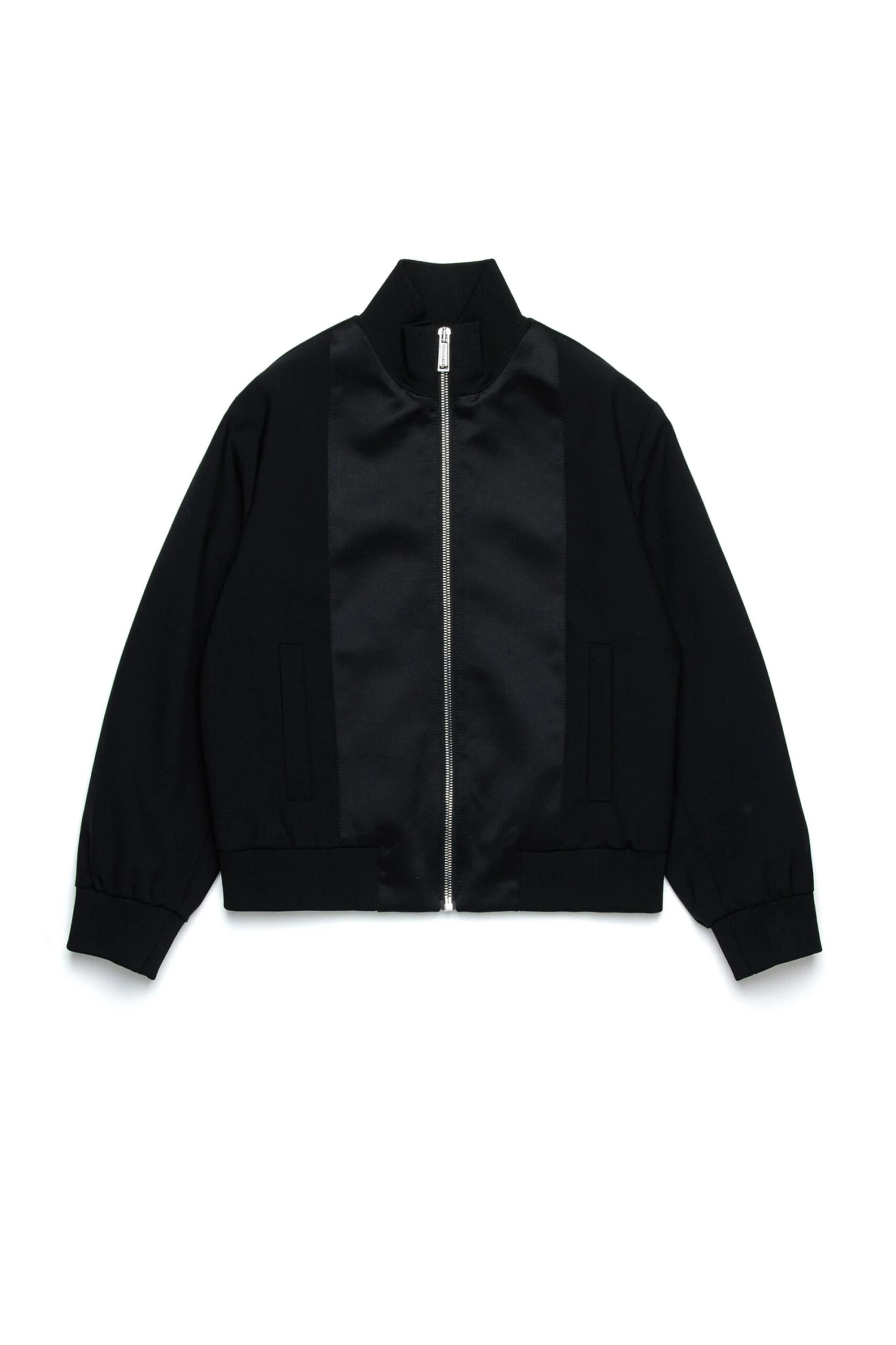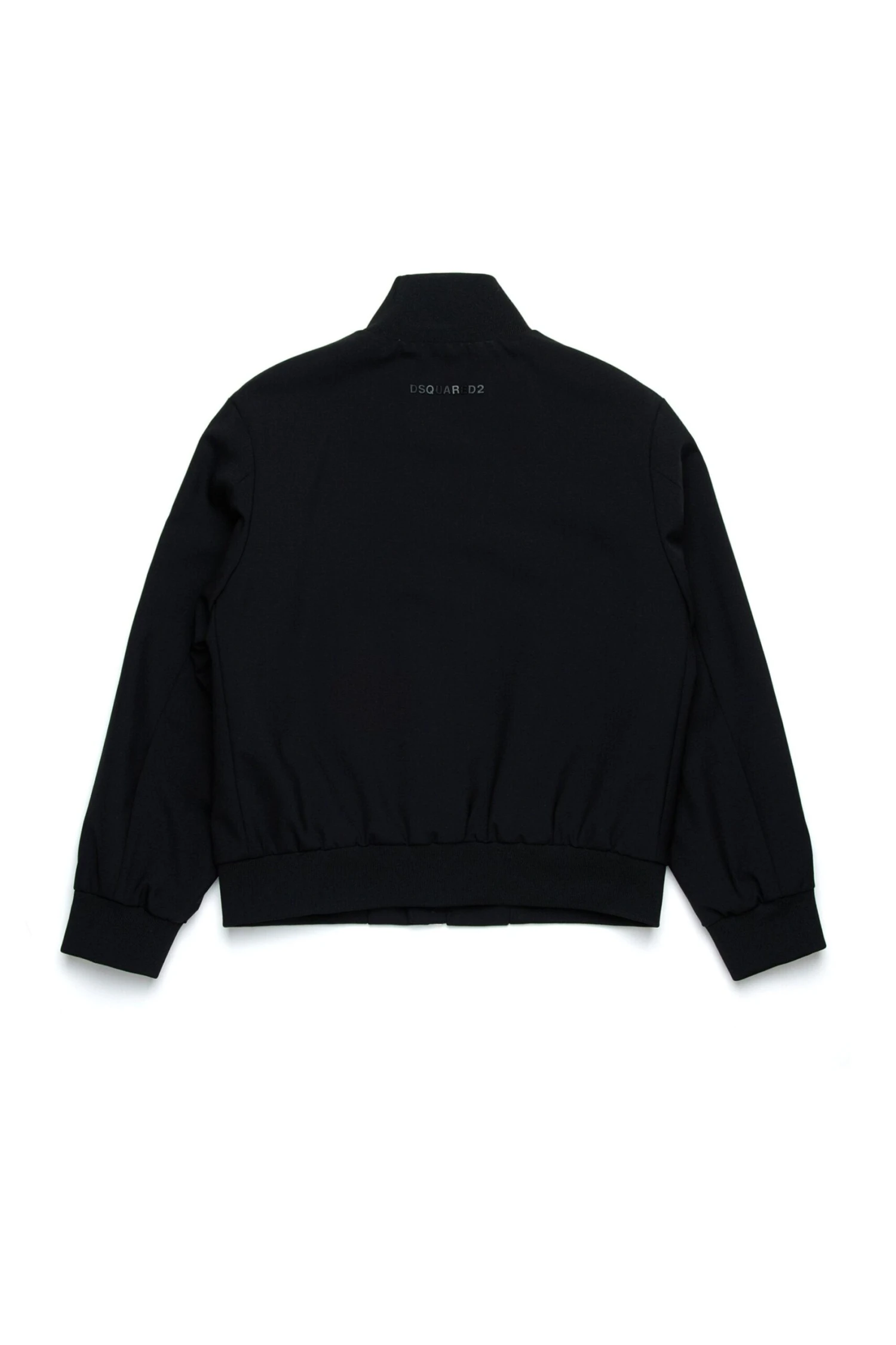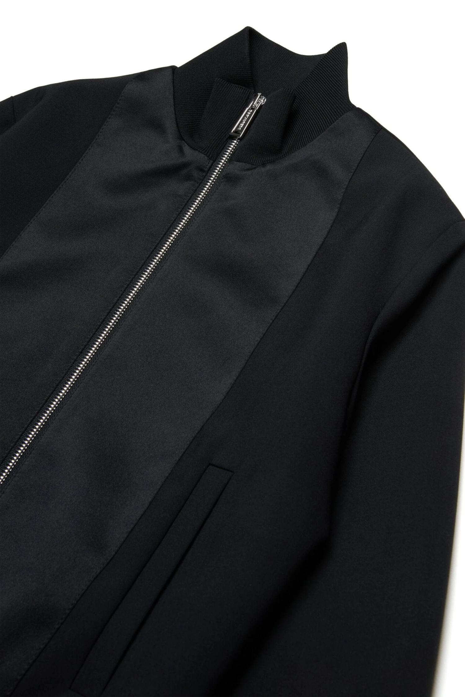 Long-sleeved evening jacket in cool wool stretch. Shiny satin inserts on the front. Front zip closure. Dsquared2 logo branded with metal lettering on the back. Ribbed construction on collar, cuffs and hem. Lined inside. Perfect for evening parties and special occasions.