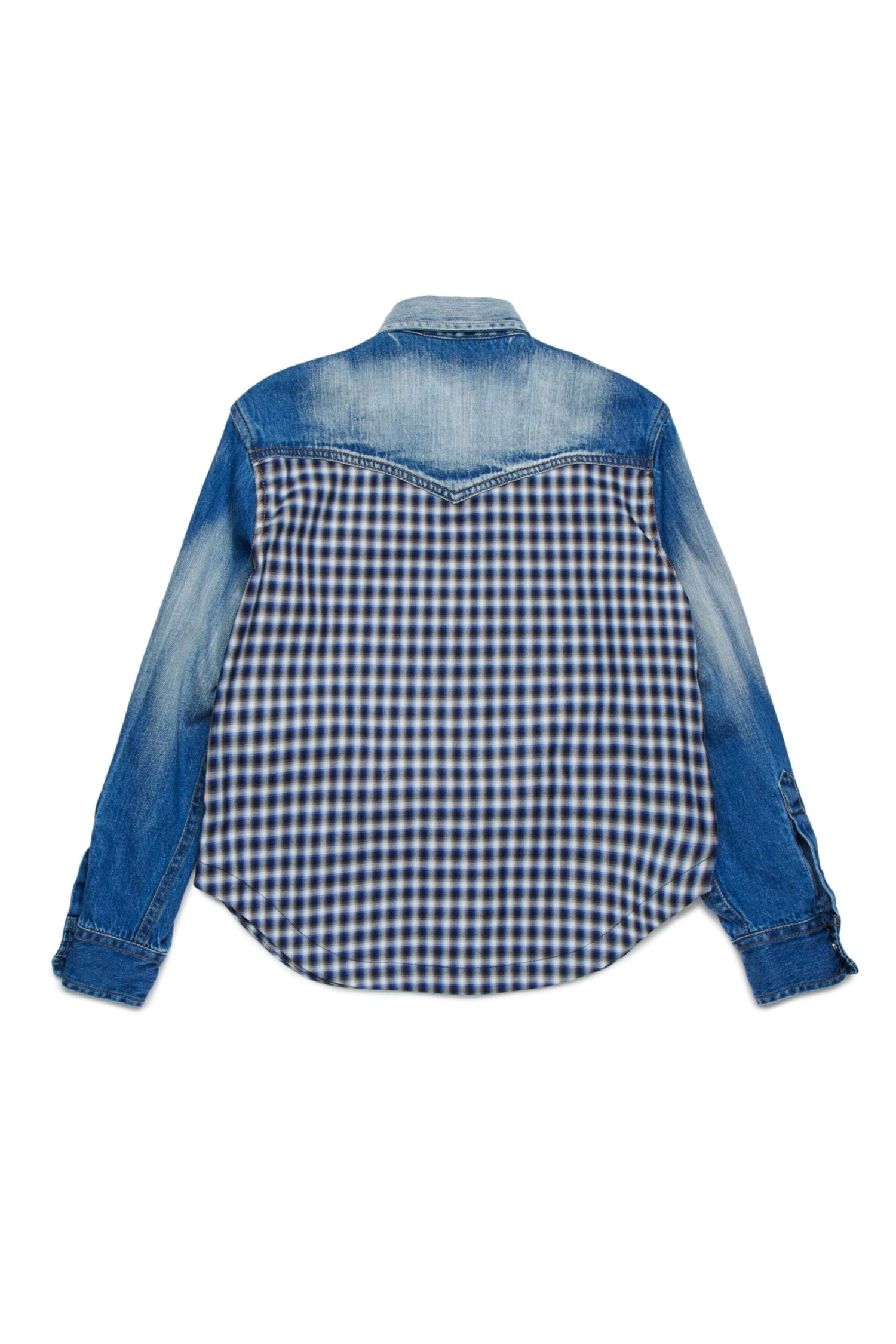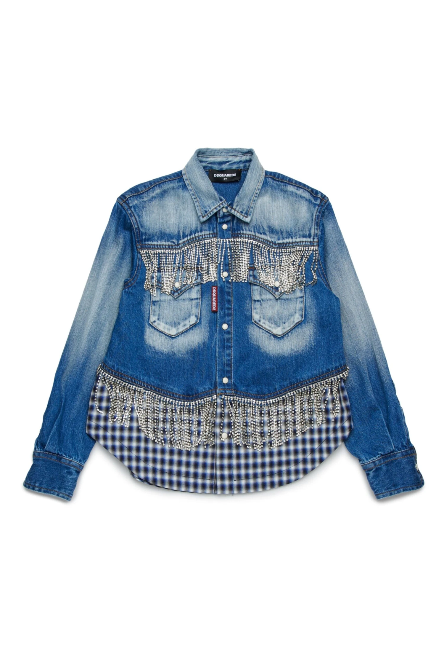 Long-sleeved shirt in medium blue denim with contrasting colour gradients. checked pattern insert on the bottom and back. Crystal fringing on the front. Front snap button closure and Dsquared2 label applied (flag logo). Made of 100% cotton.