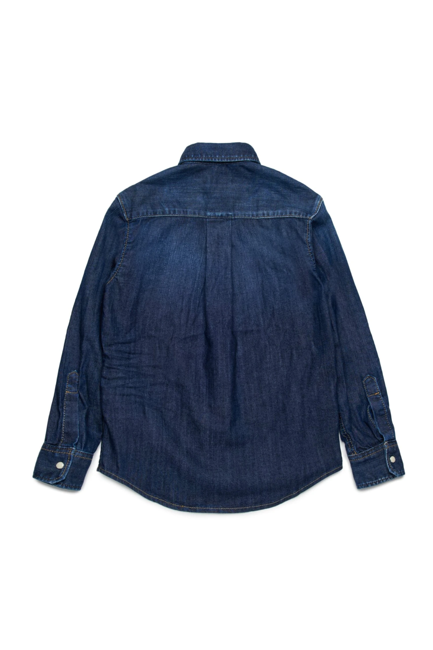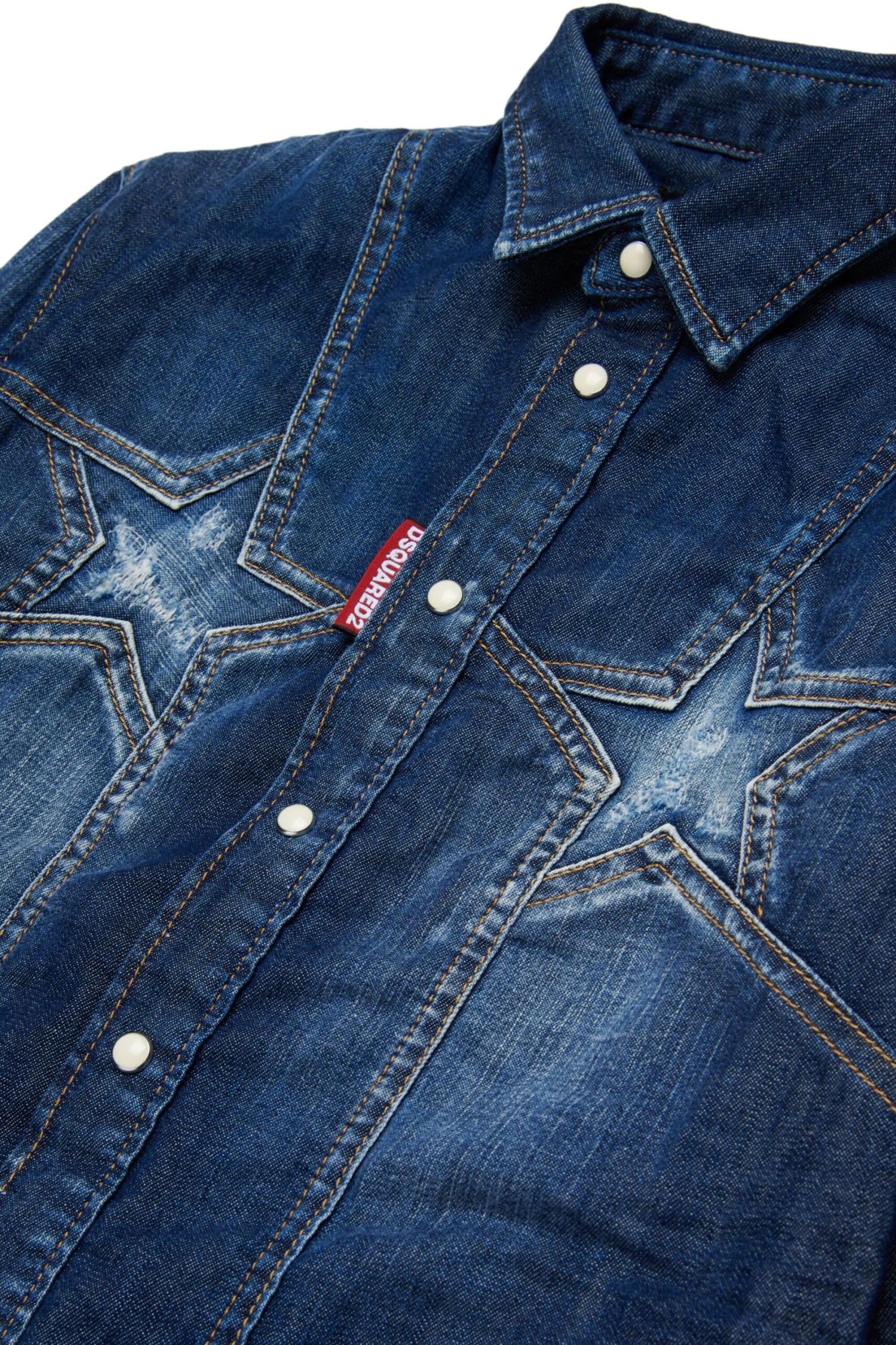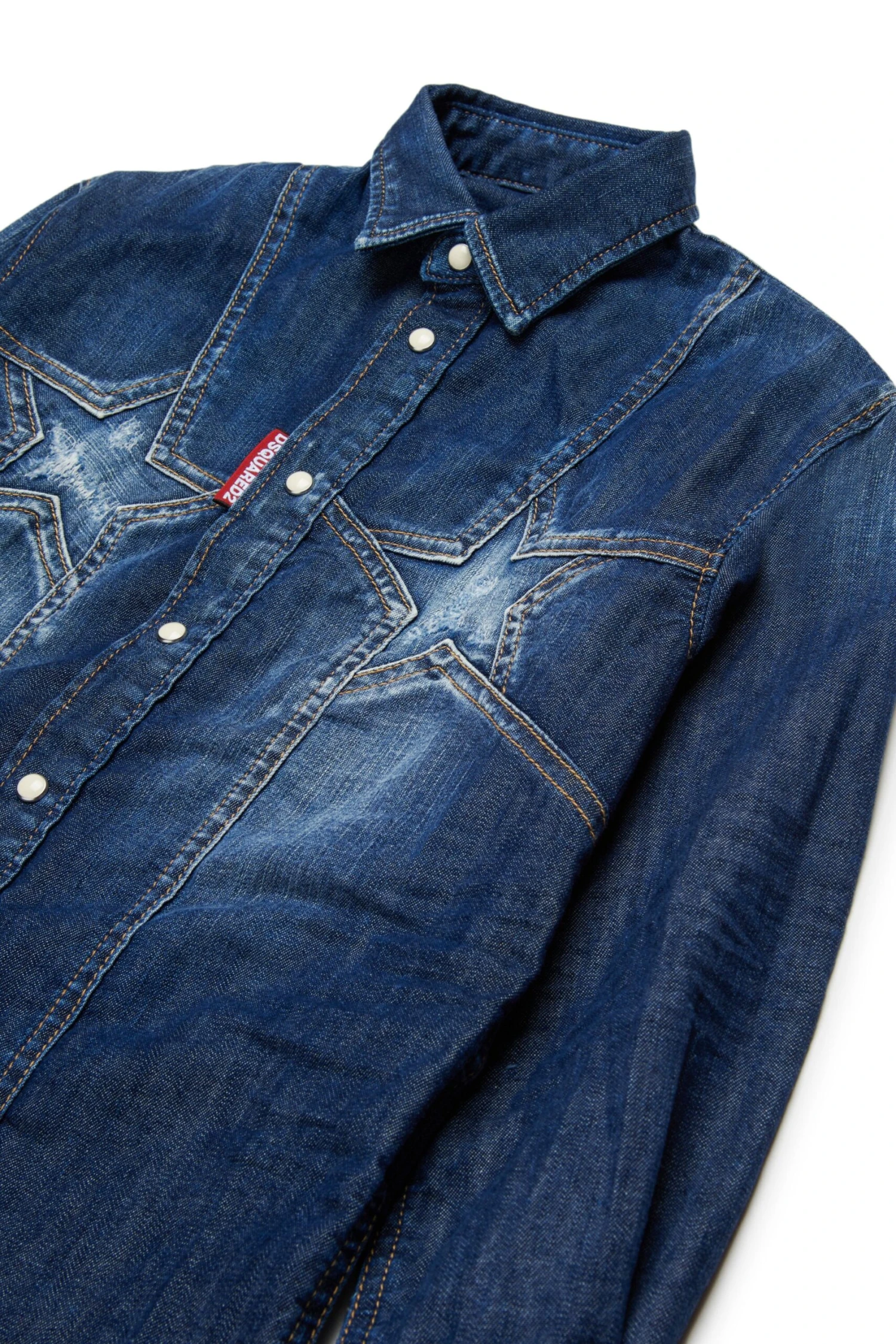 Long-sleeved jeans shirt. Made of dark blue denim, distinguished by gradients, whiskers and colour contrasting seams. Super Star with frayed breaks at the front. Dsquared2 label applied to the closure (flag logo).