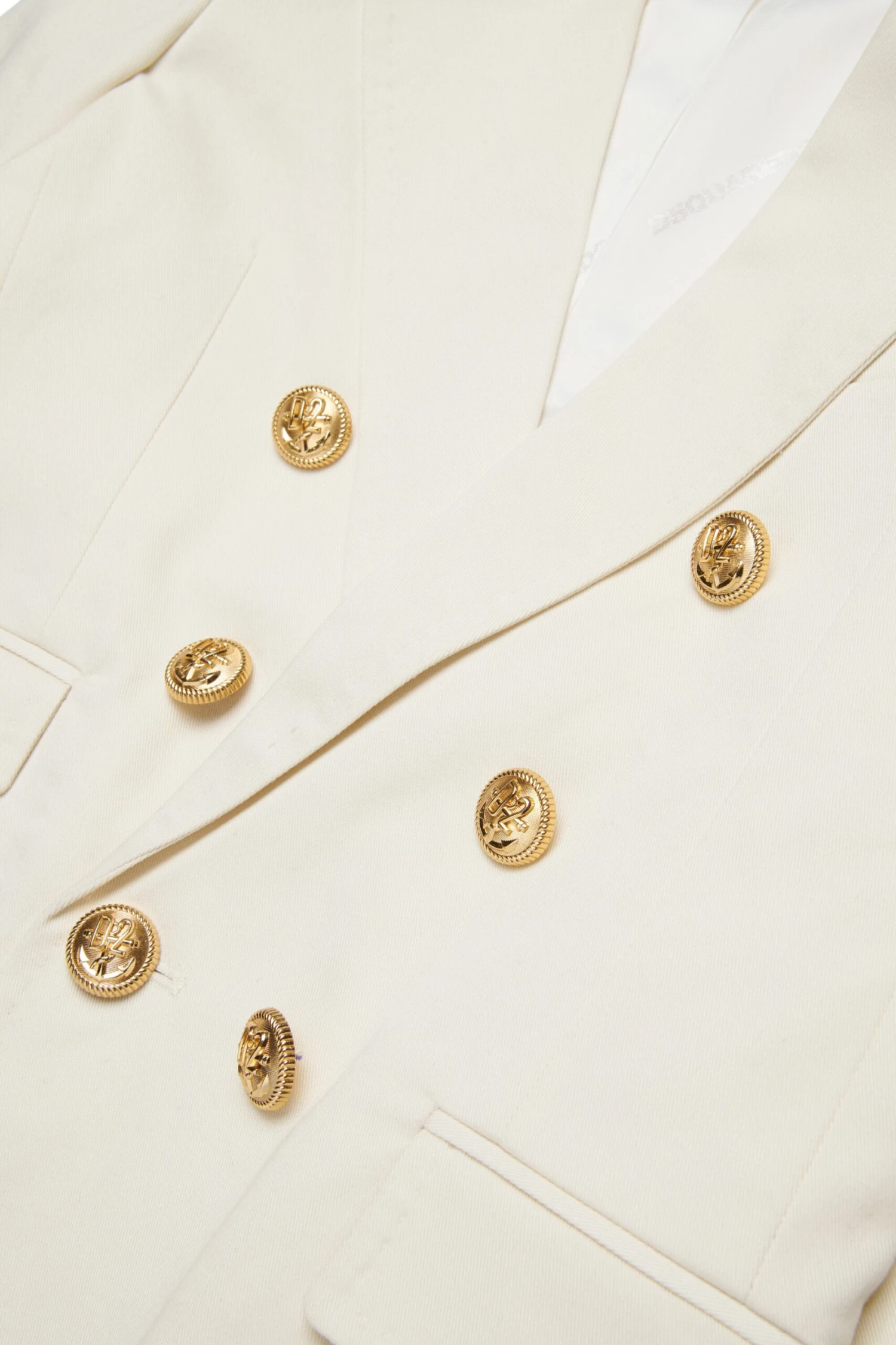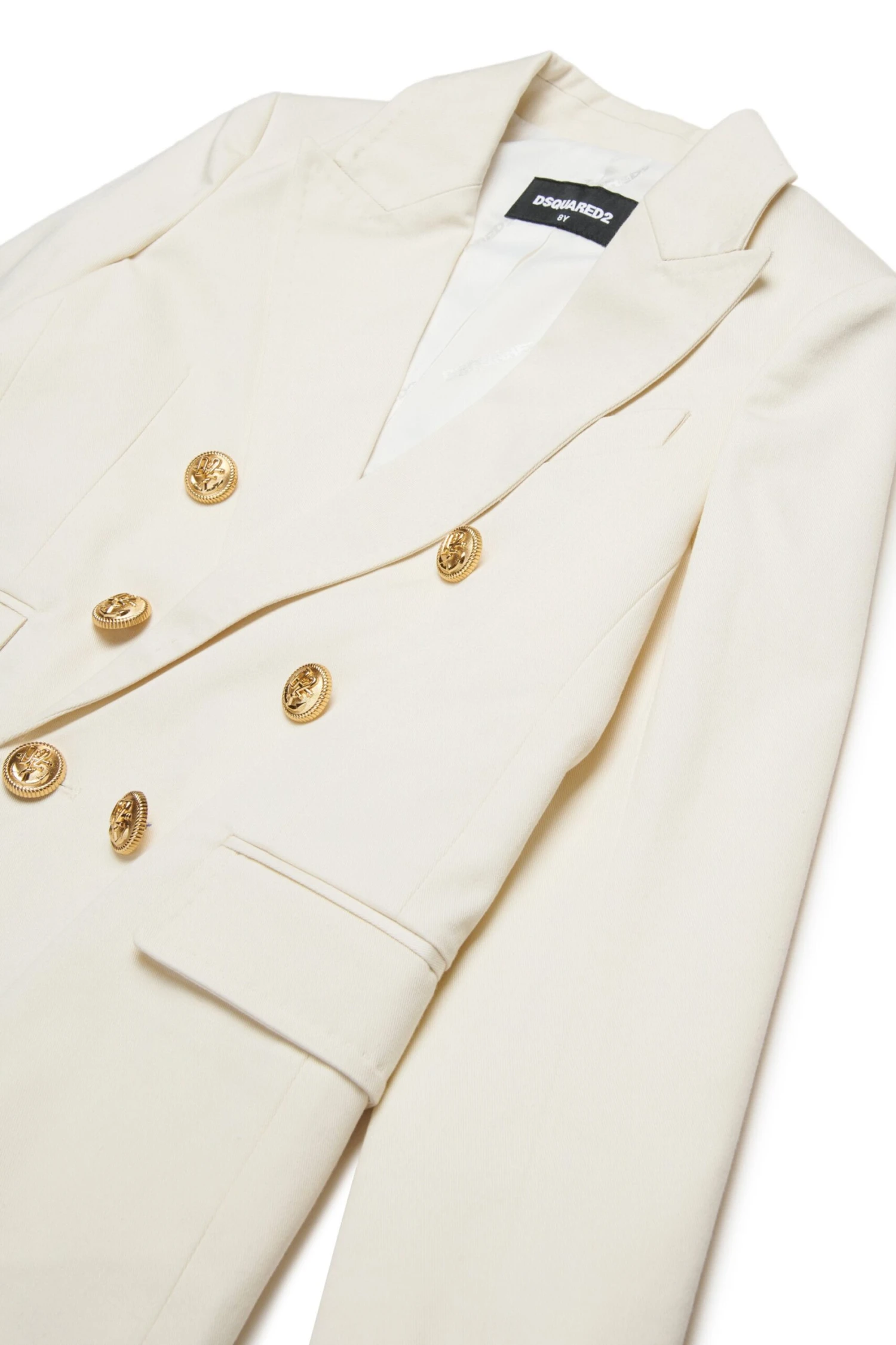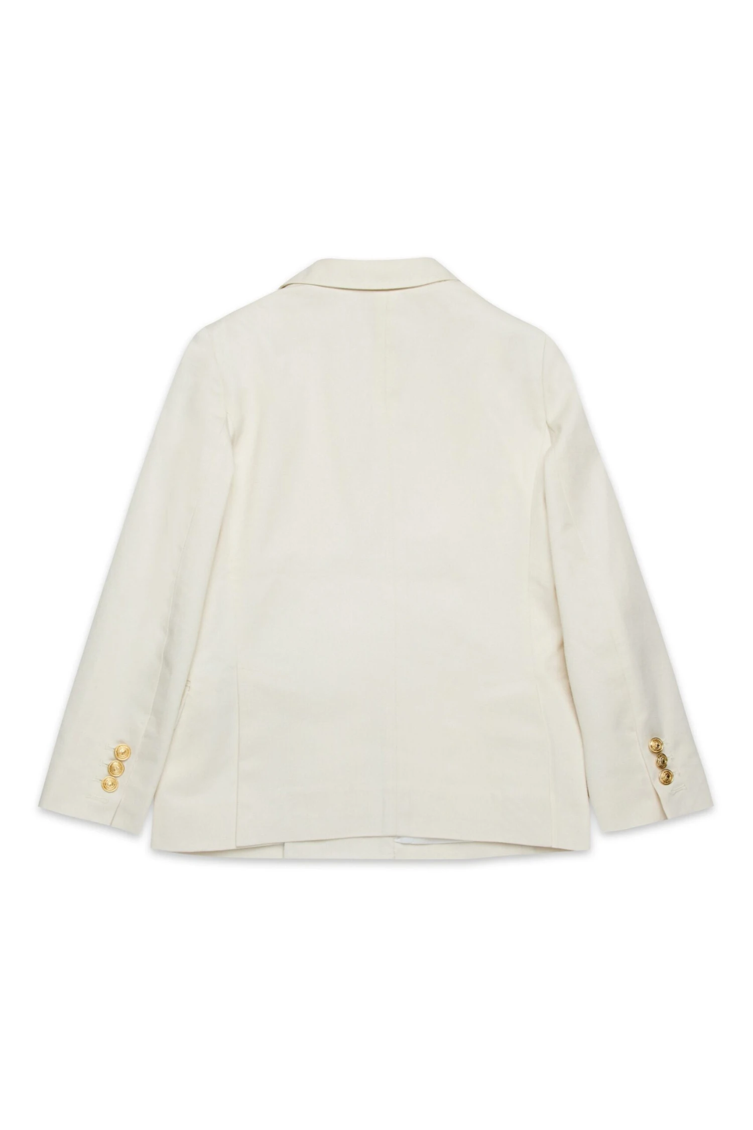 Long-sleeved jacket in cotton blend twill. Double-breasted button closure with jewelled logo buttons. Front flap pockets. Lined inside. A perfect garment for ceremonies and special occasions.