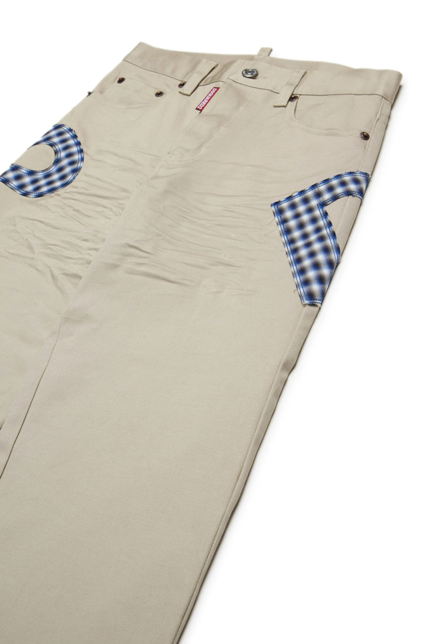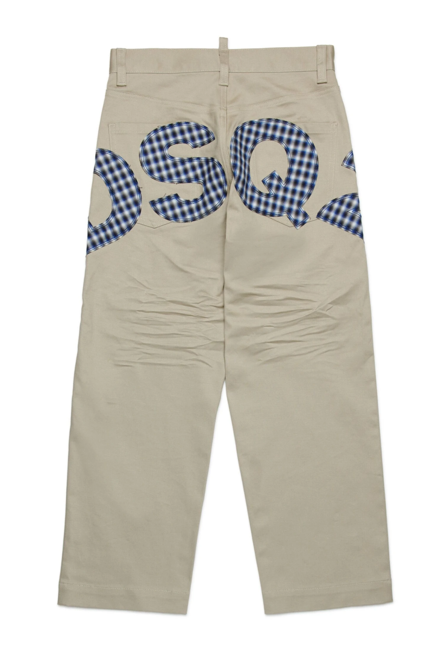 Stretch cotton gabardine pants. DSQ2 maxi logo in checked pattern with raw cut hem applied on the back. Wrinkles on the front and back. Dsquared2 label applied to the flap (flag logo).