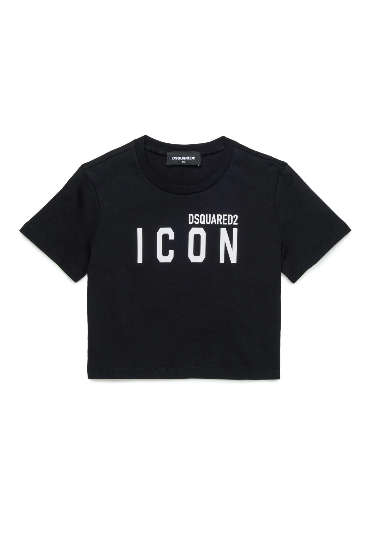 Cropped crew-neck T-shirt in short-sleeved jersey. It features a Dsquared2 ICON logo in contrasting colour on the front. Made of 100% cotton.