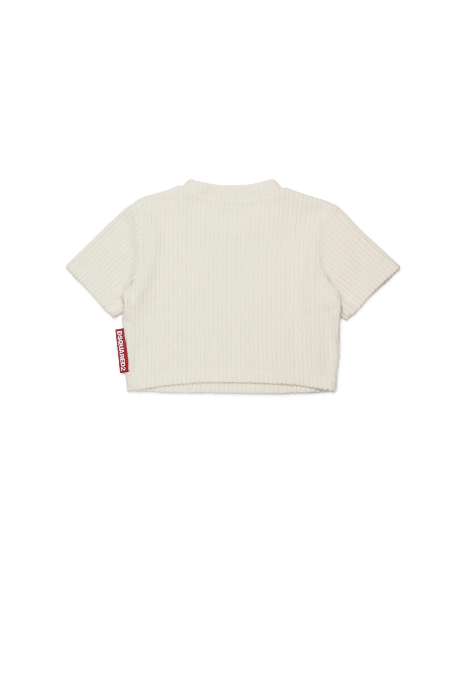 Cropped corduroy T-shirt with short-sleeved sleeves. Modern cut meets soft, refined texture, enhanced by Dsquared2’s maxi-flag applique logo on the side.