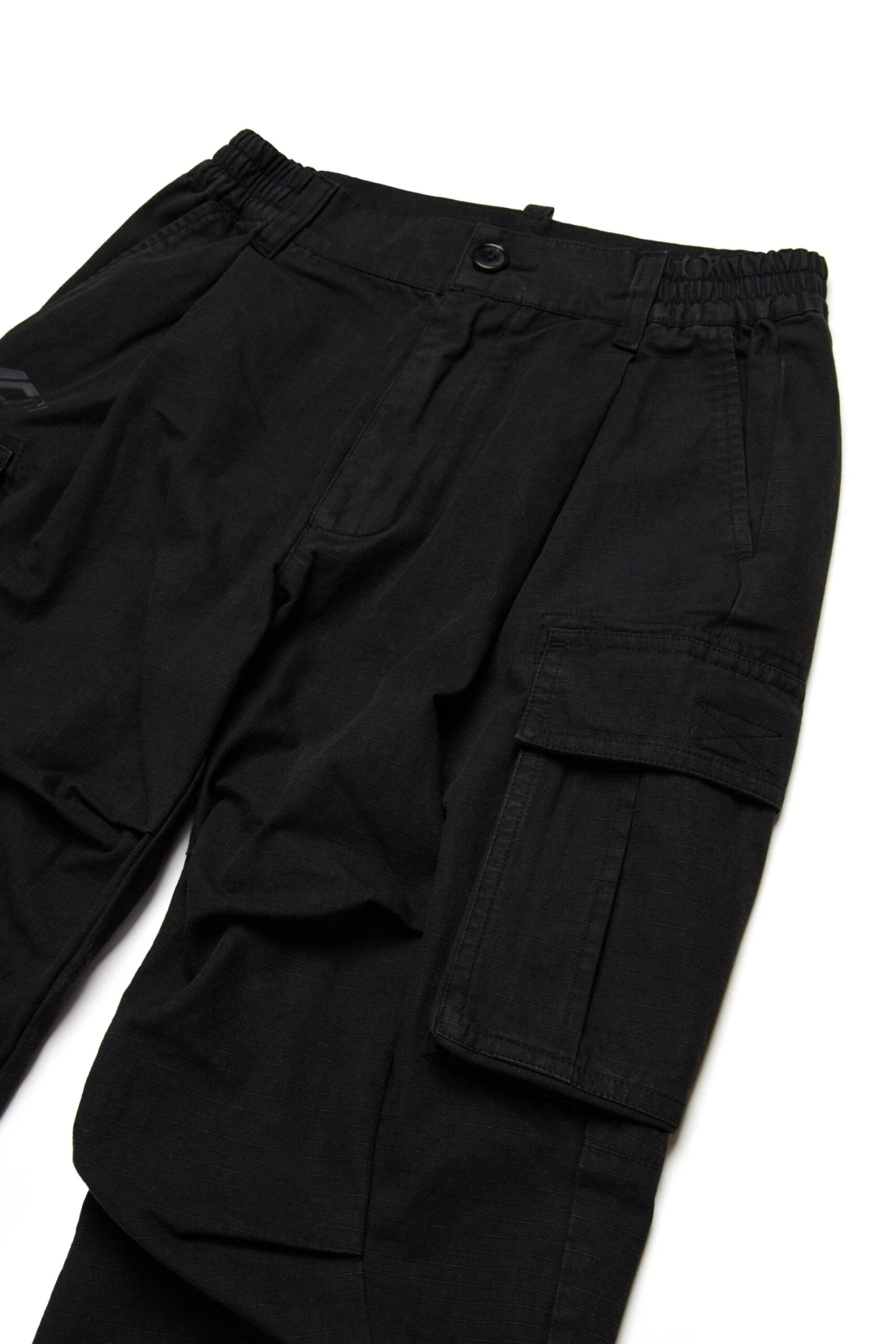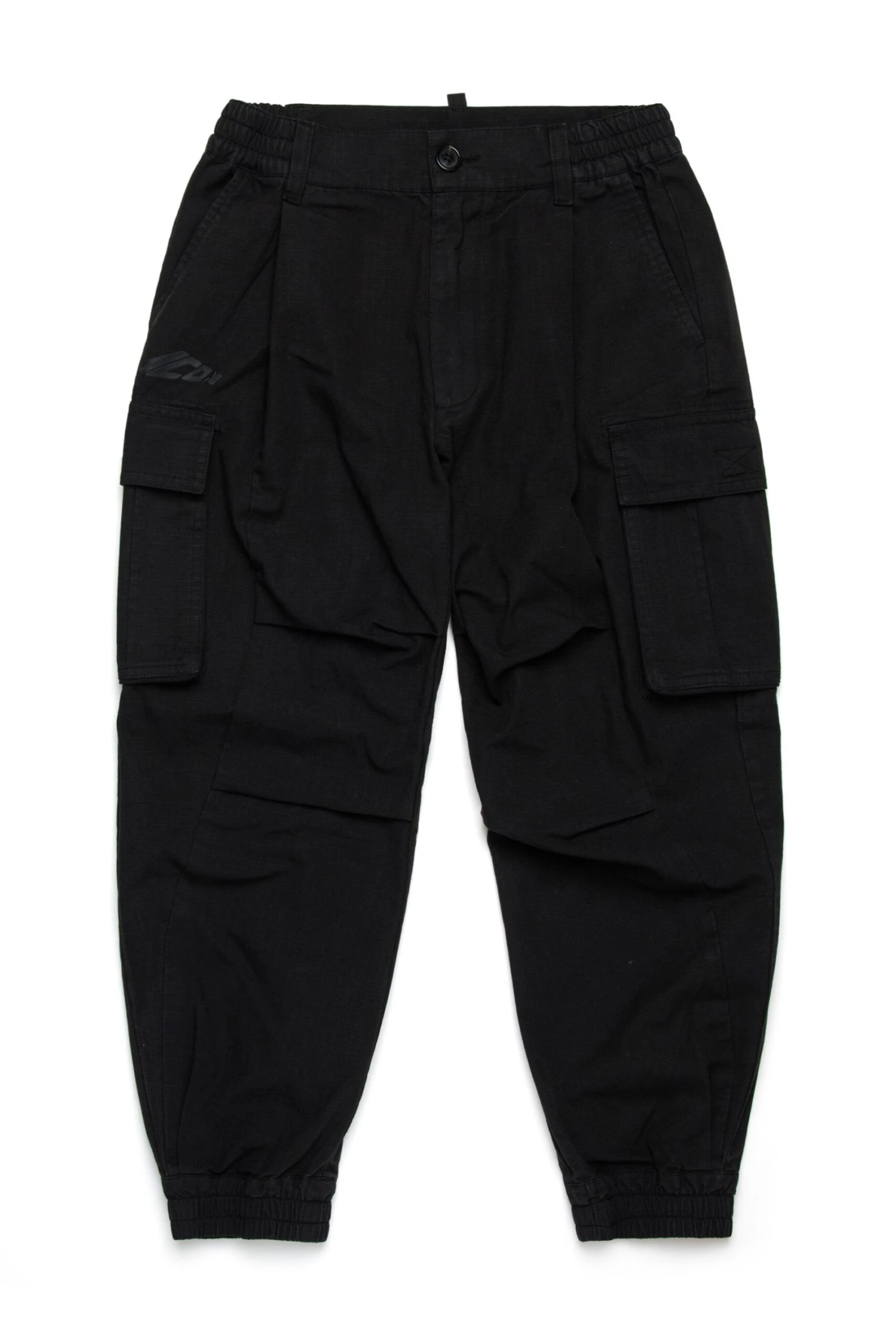 100% cotton ripstop cargo pants. Elastic at waist and ankle. Icon New Generation logo in contrasting colour on front. Ergonomic seams at knees. Front slash pockets. Velcro closure pockets at back and along legs. Made of 100% cotton.
