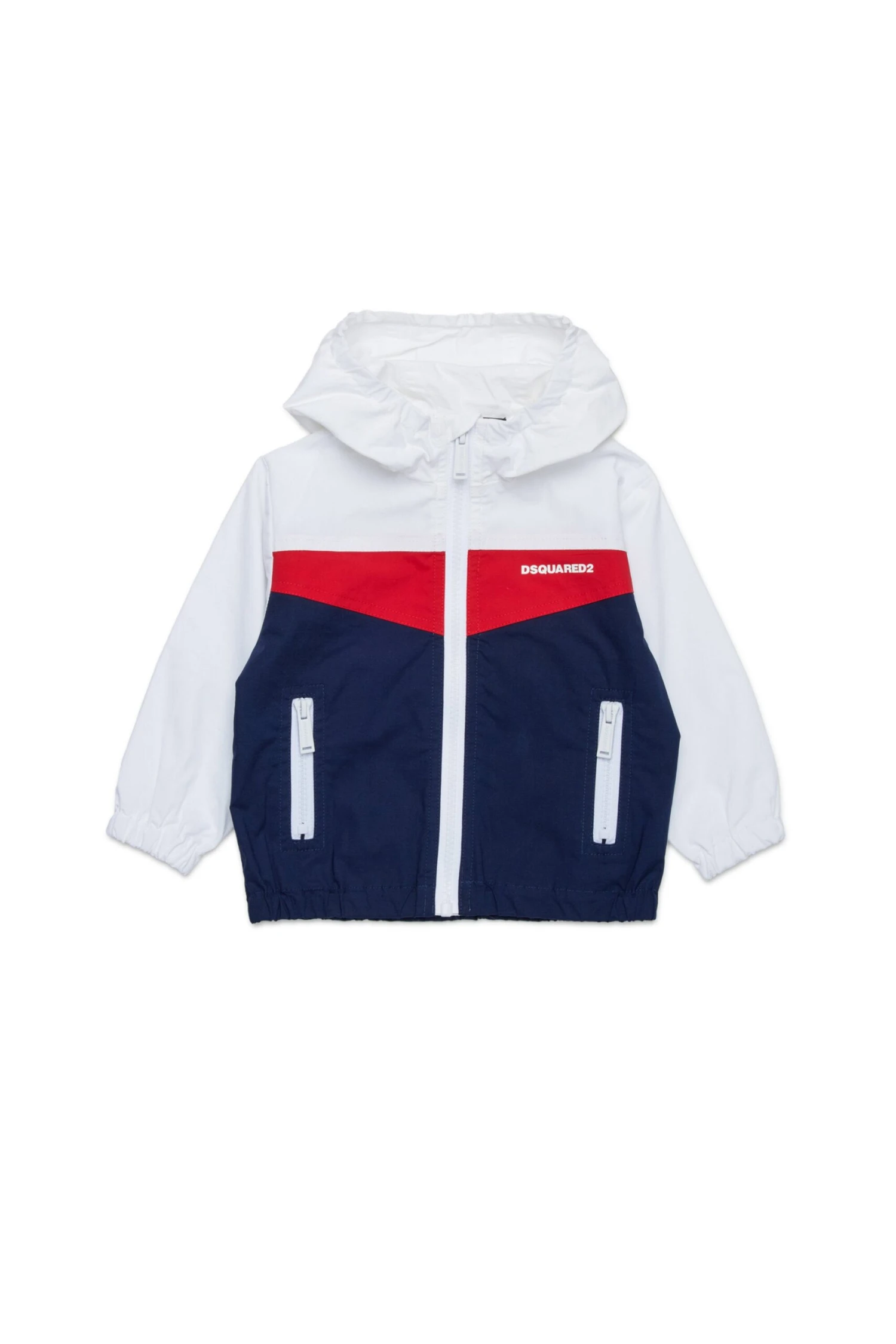 Tennis-inspired long-sleeved windbreaker jacket. Made of technical cotton with colourblock details. Dsquared2 logo on the front on the heart side. Fixed hood. Pockets and front zip closure. Elastic on hood, cuffs and hem. Lined inside.