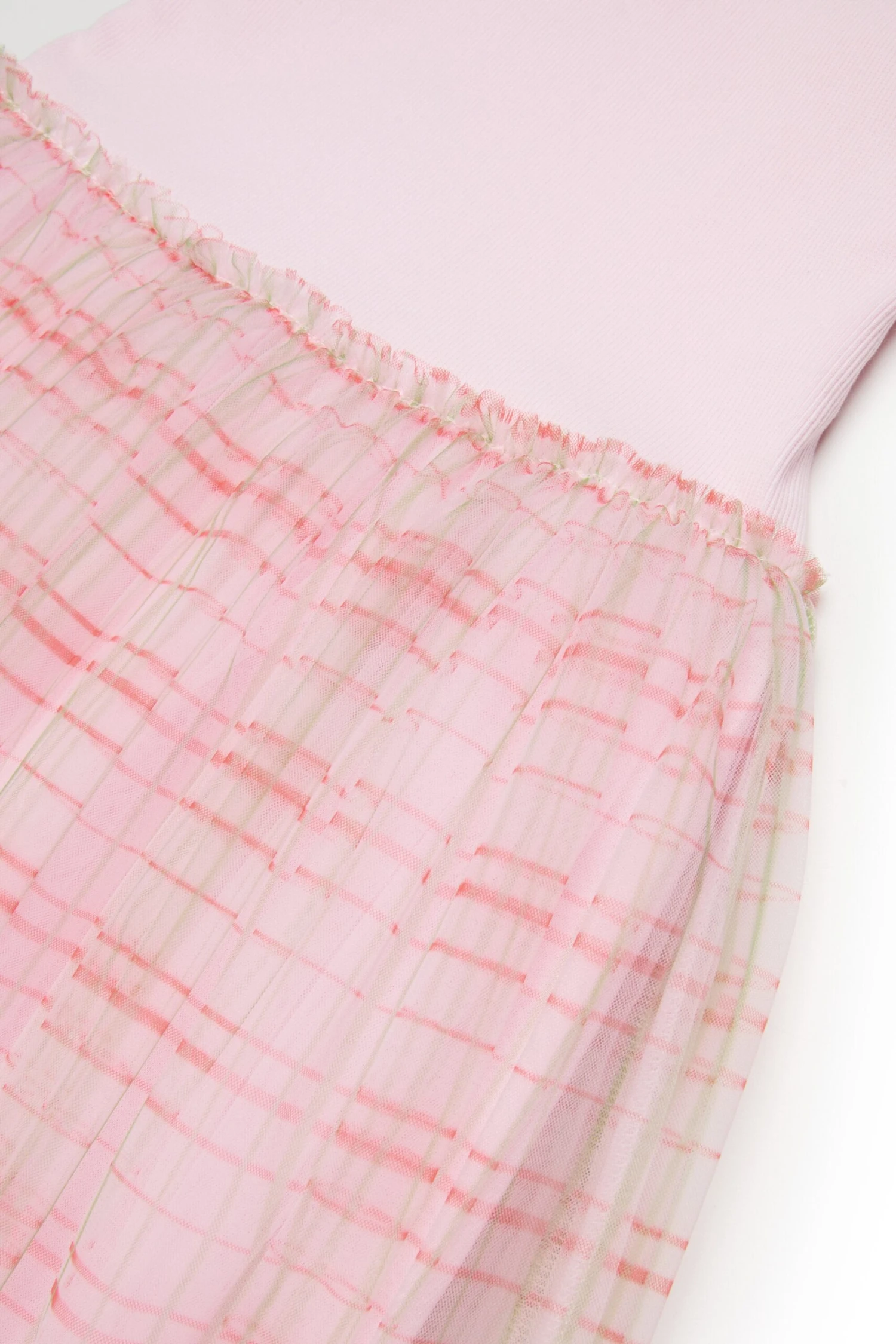 Short-sleeved crew-neck dress in ribbed knit. Features an institutional logo embroidered in contrasting color on the front on the heart side. Skirt covered in tulle with an allover Check pattern. A perfect garment for ceremonies and special occasions.