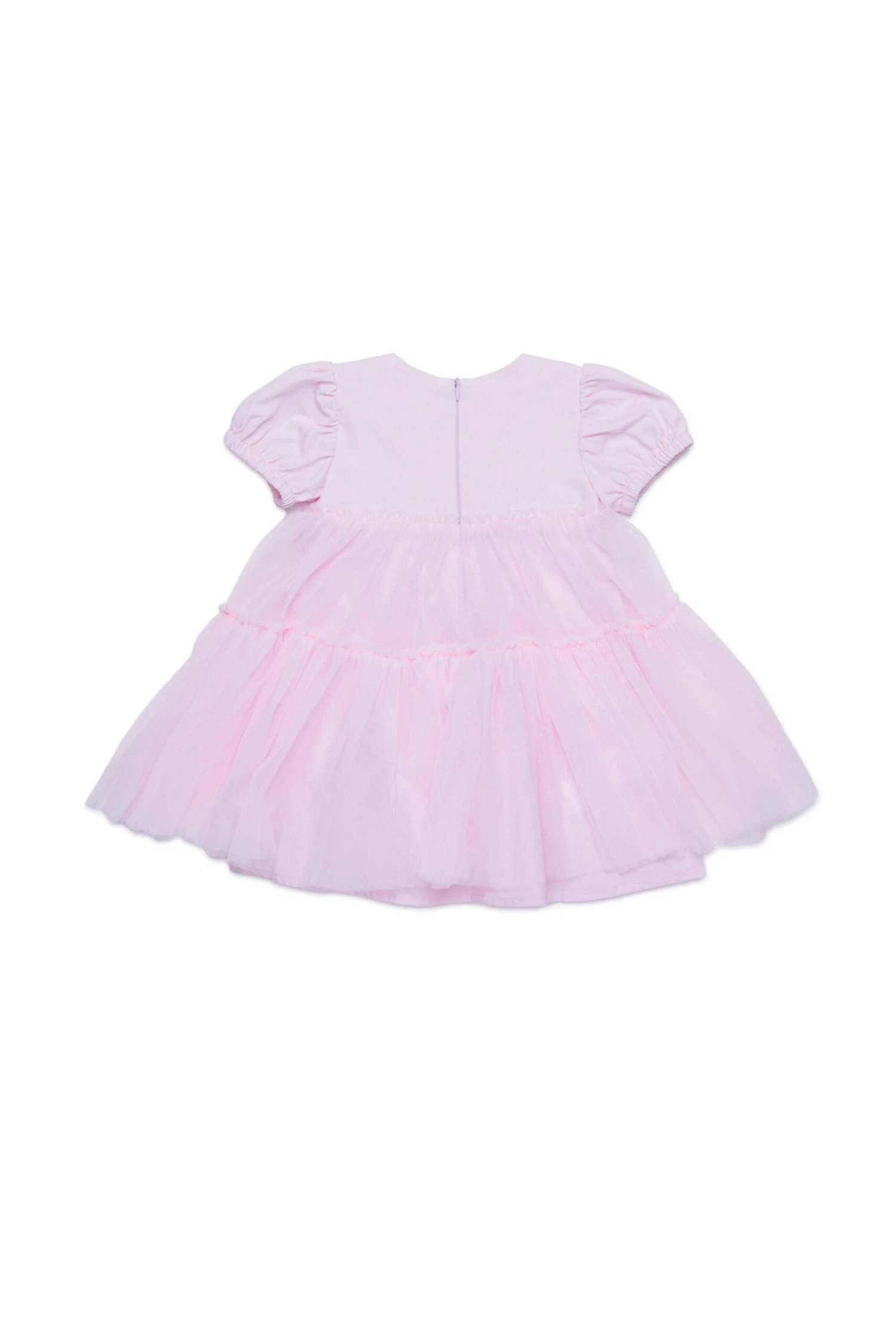 Crew-neck dress with balloon sleeves. Features an institutional logo embroidered in contrasting color on the front on the heart side. Tulle bottom with cotton underskirt. Back zip closure. Perfect for ceremonies and special occasions.