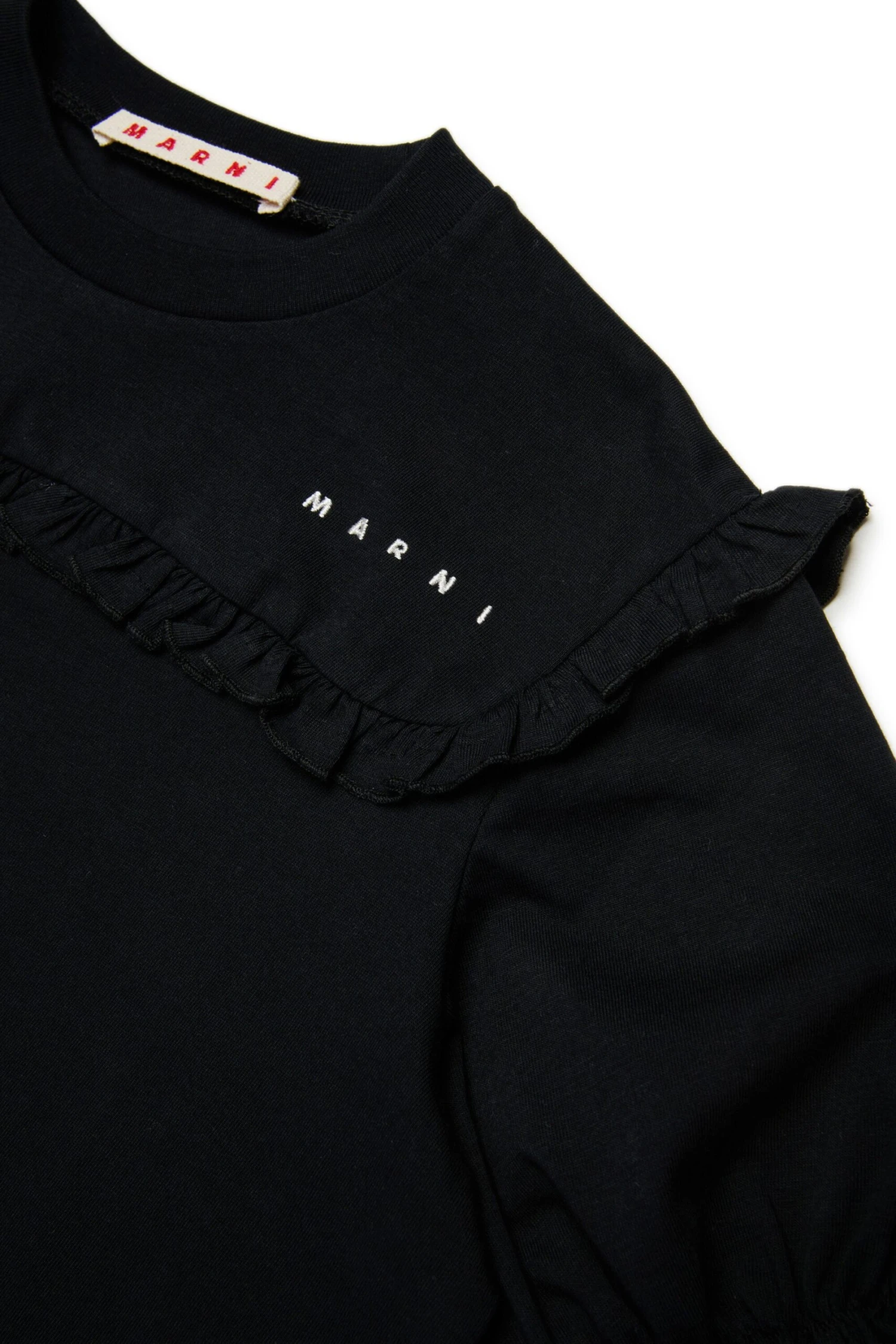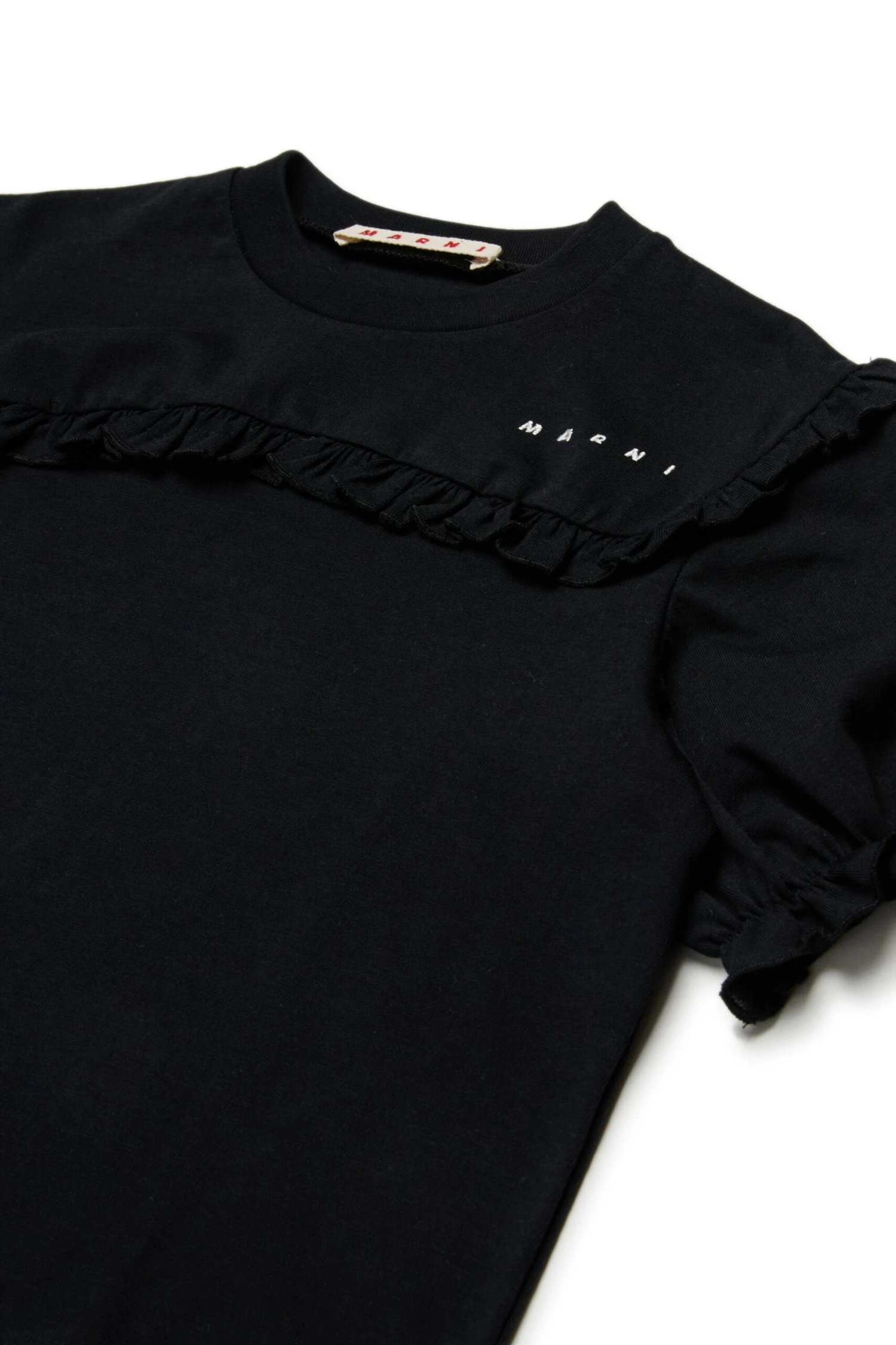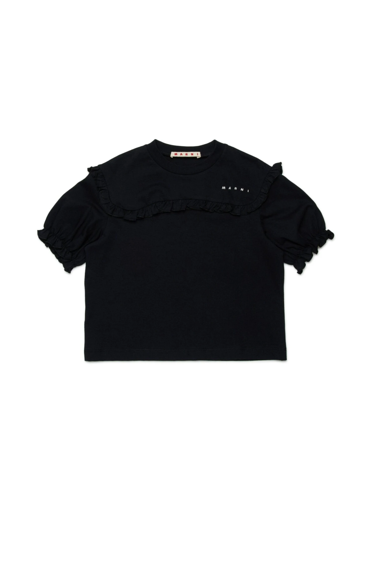 Soft cotton jersey short-sleeved T-shirt embellished with ruffles on the front and armhole. The institutional logo embroidered heart side color contrasting adds a refined touch to a garment perfect for a variety of occasions.