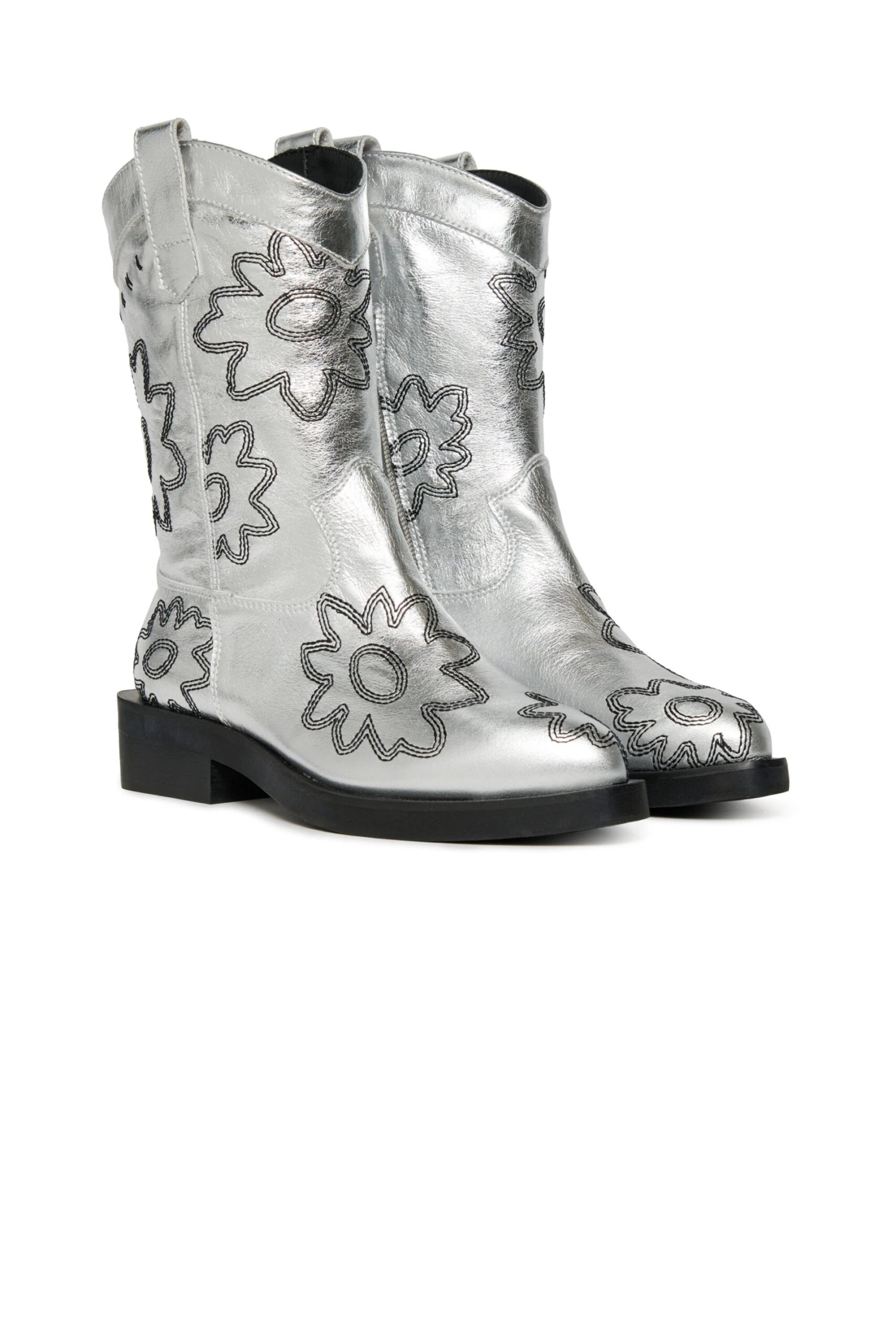 Personalised cowboy boots with contrasting embroidered flowers and official logo. Topstitching. Calfskin upper and lining. Rubber sole with masonite heel. On trend cowboy-style model. Made in Italy.