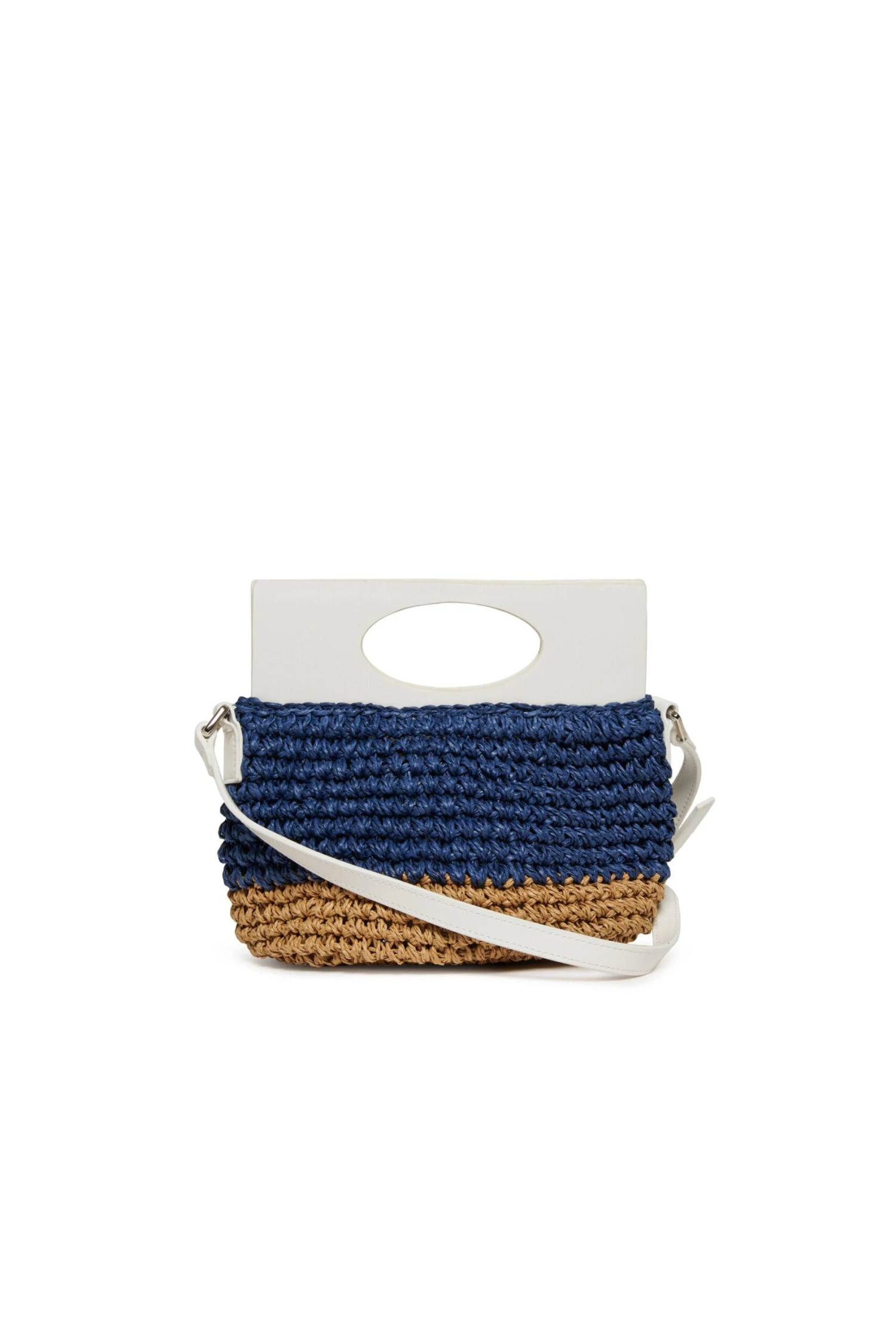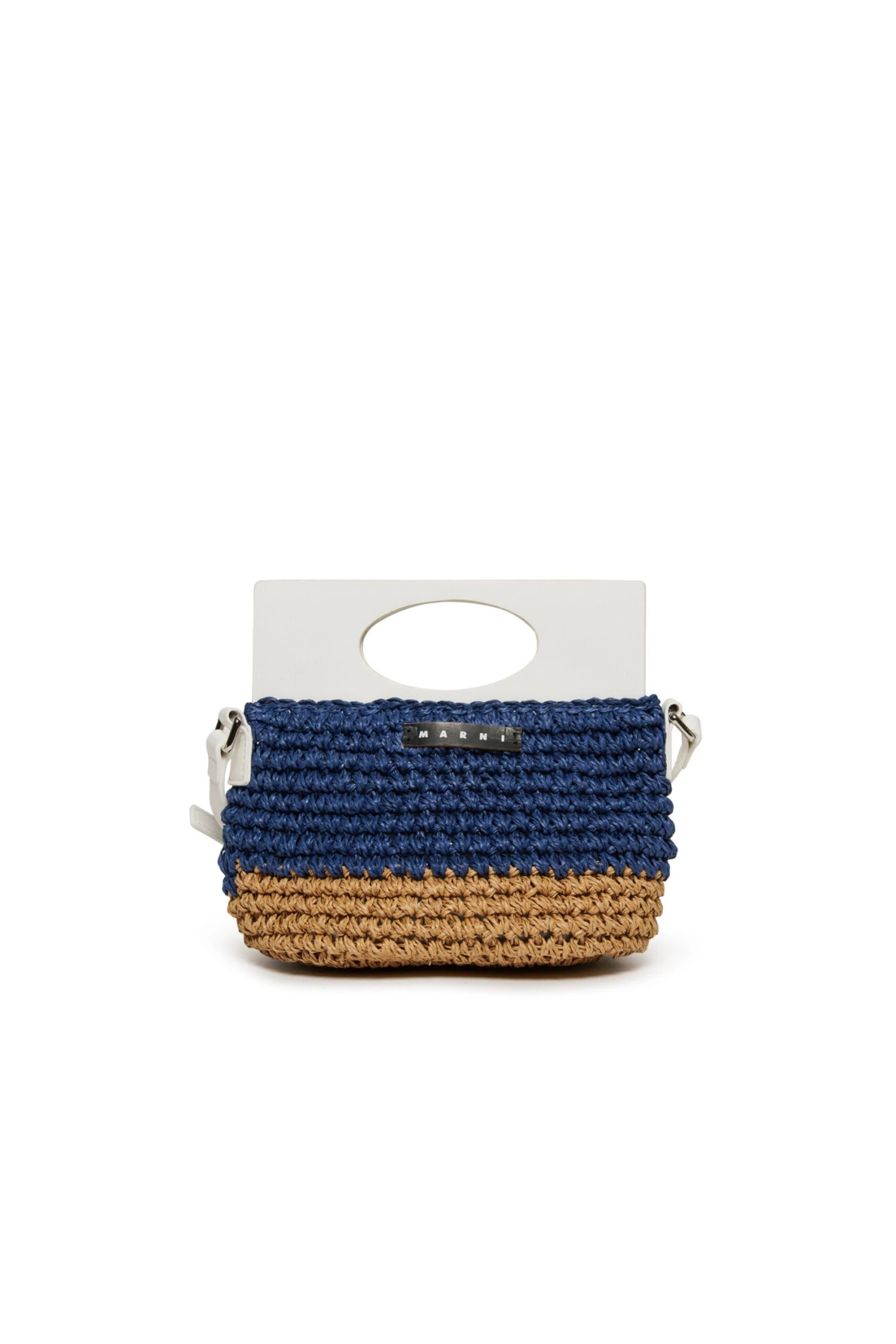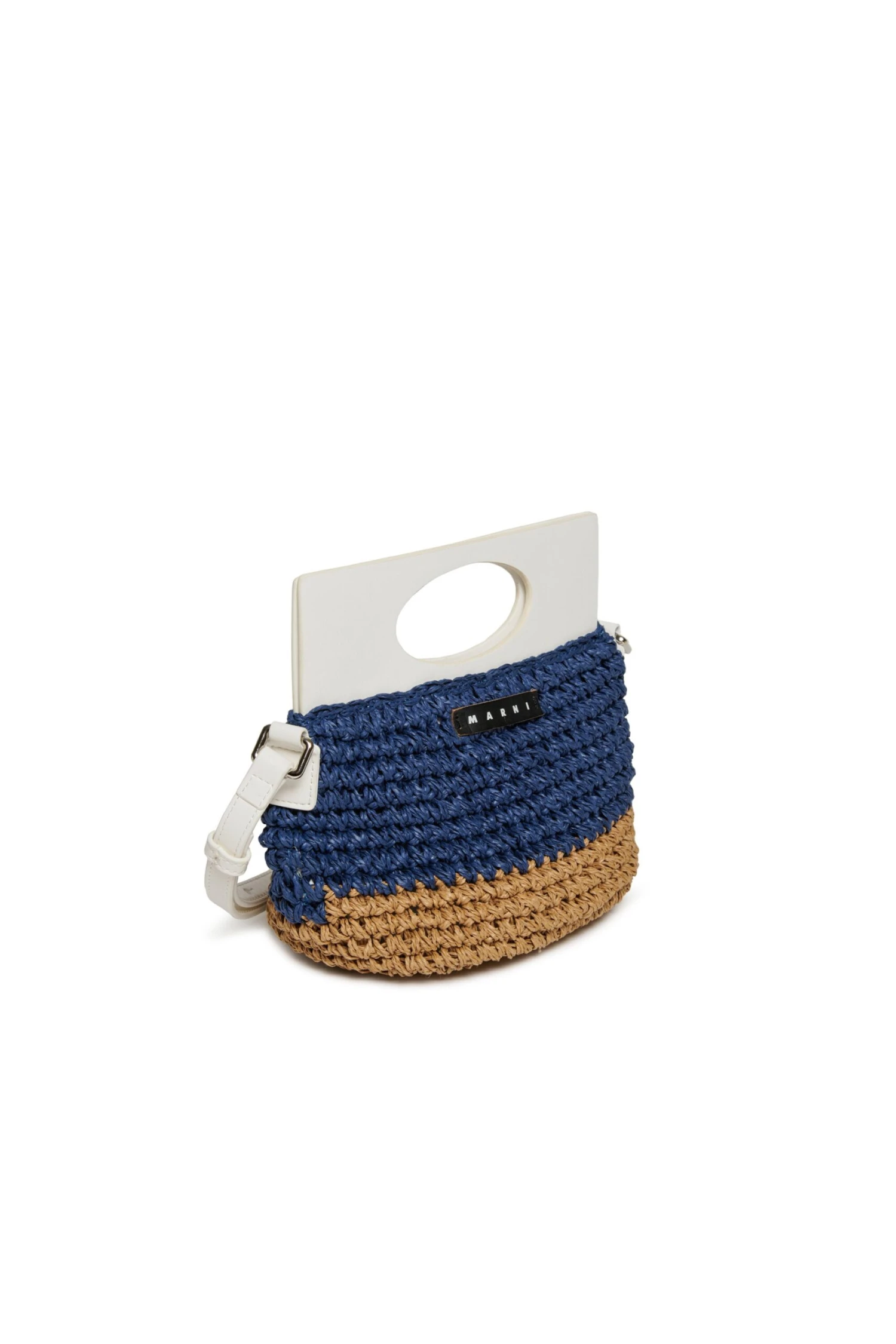 Light bag with magnet closure. The item features a woven raffia-effect body with imitation leather inserts. Marni institutional logo. Rigid bottom. Hand-held and cross-body. Adjustable (fixed) imitation leather shoulder strap. Measurements: 20.5 cm high, 22 cm wide, 12 cm deep. Handle drop: 40 cm.