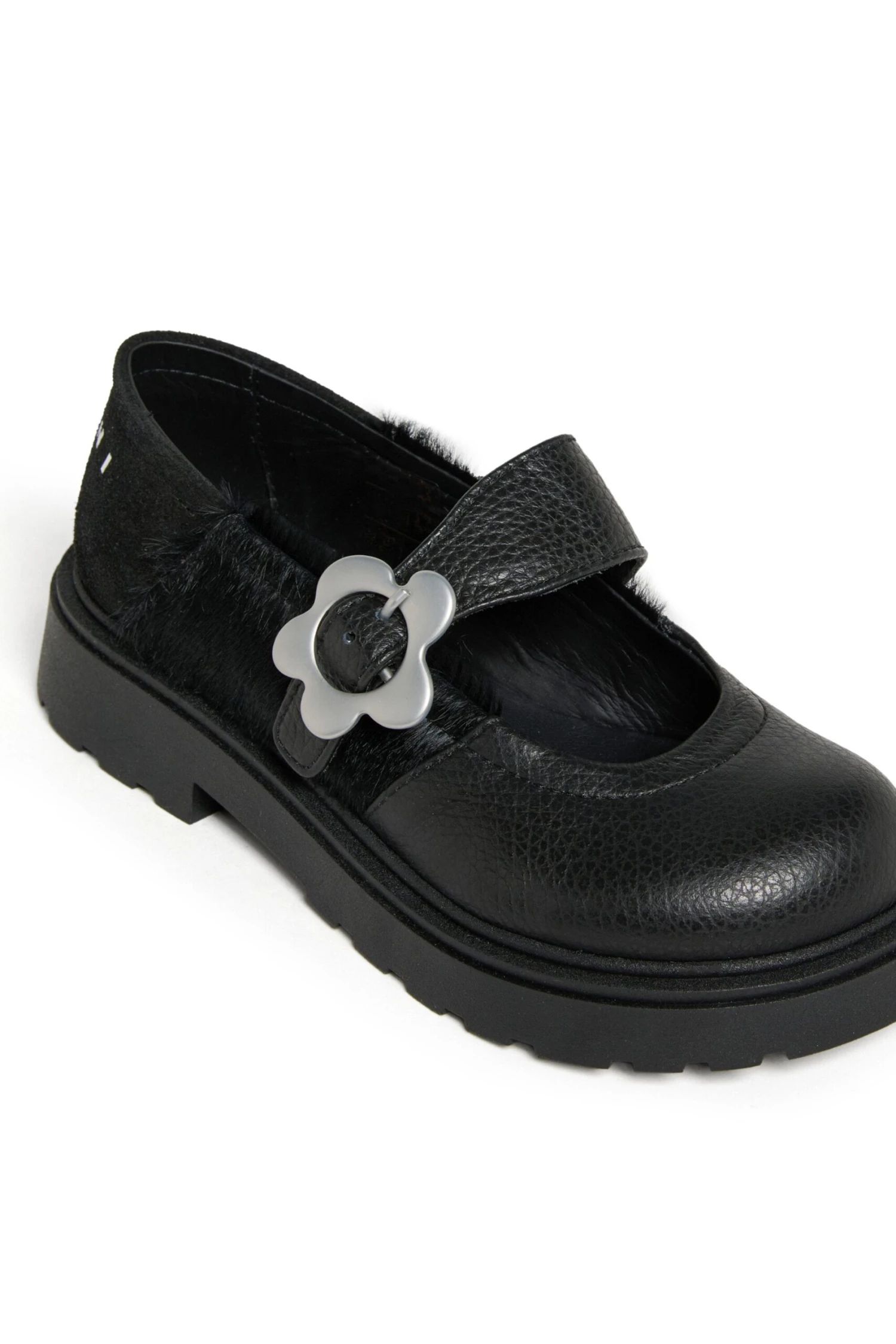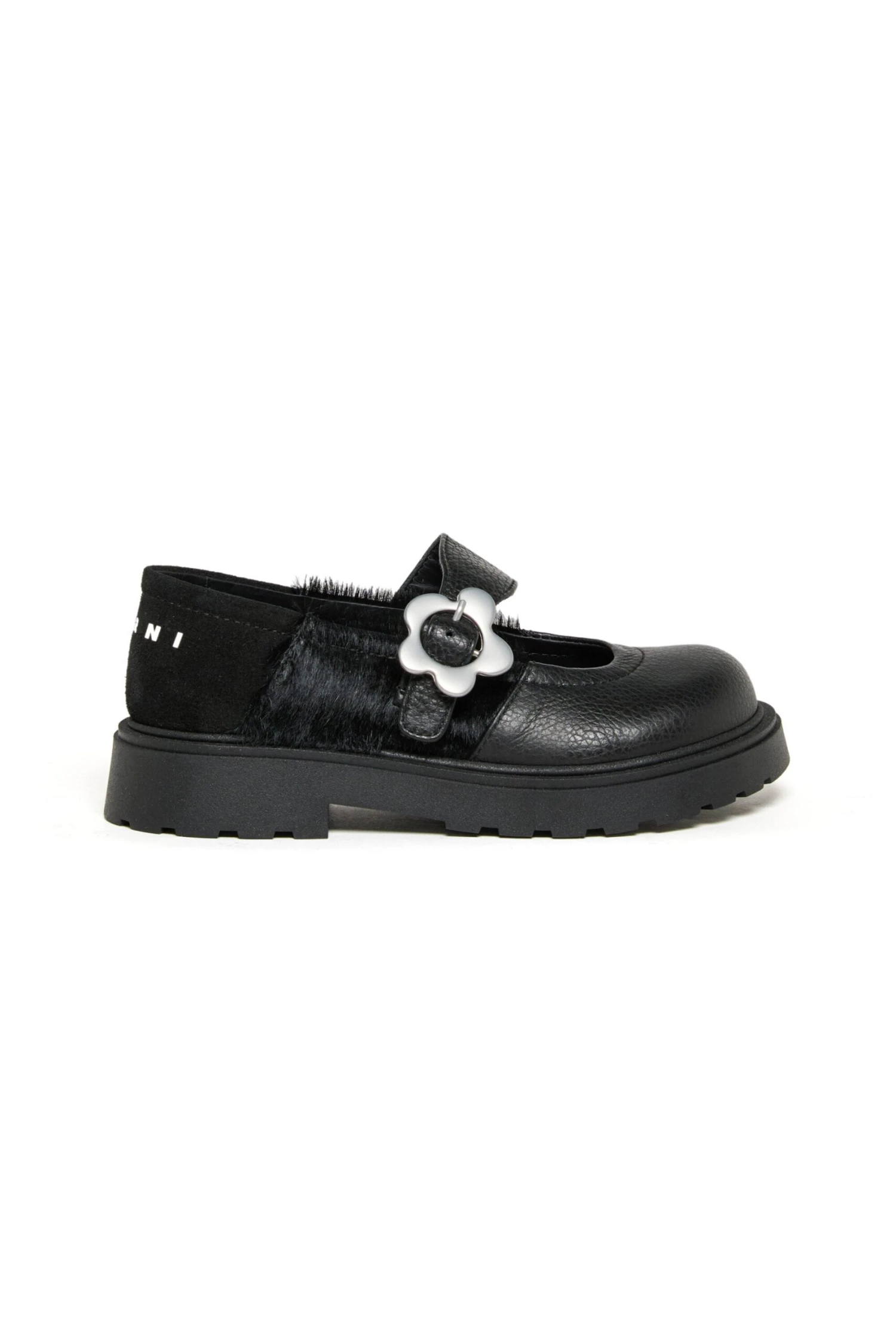 Mary Jane shoes with a flower-shaped buckle and logo on the heel, made of a refined mix of grained leather, suede and pony skin. An elegant and original design for a comfortable and versatile shoe.