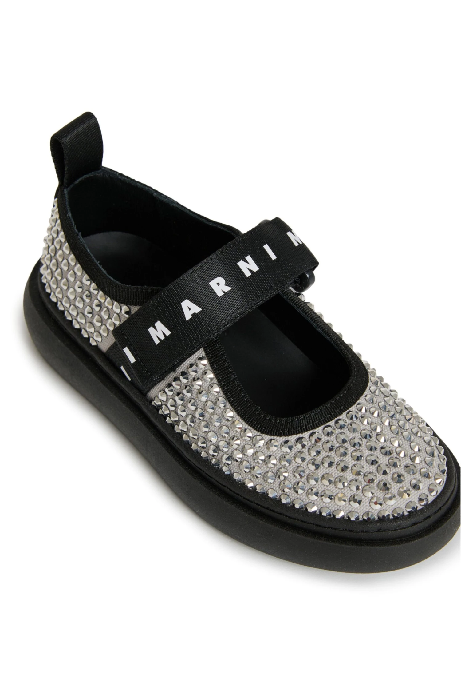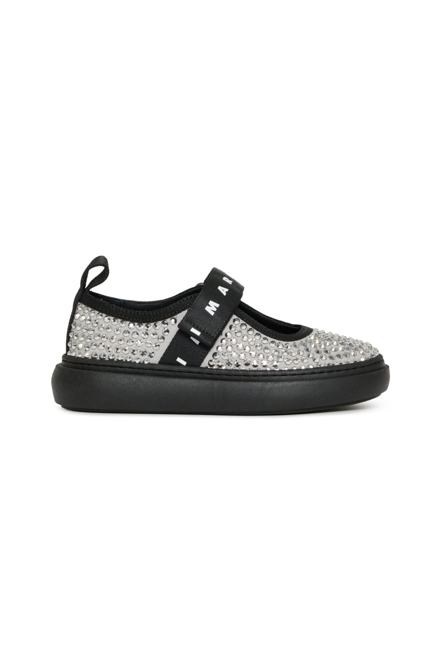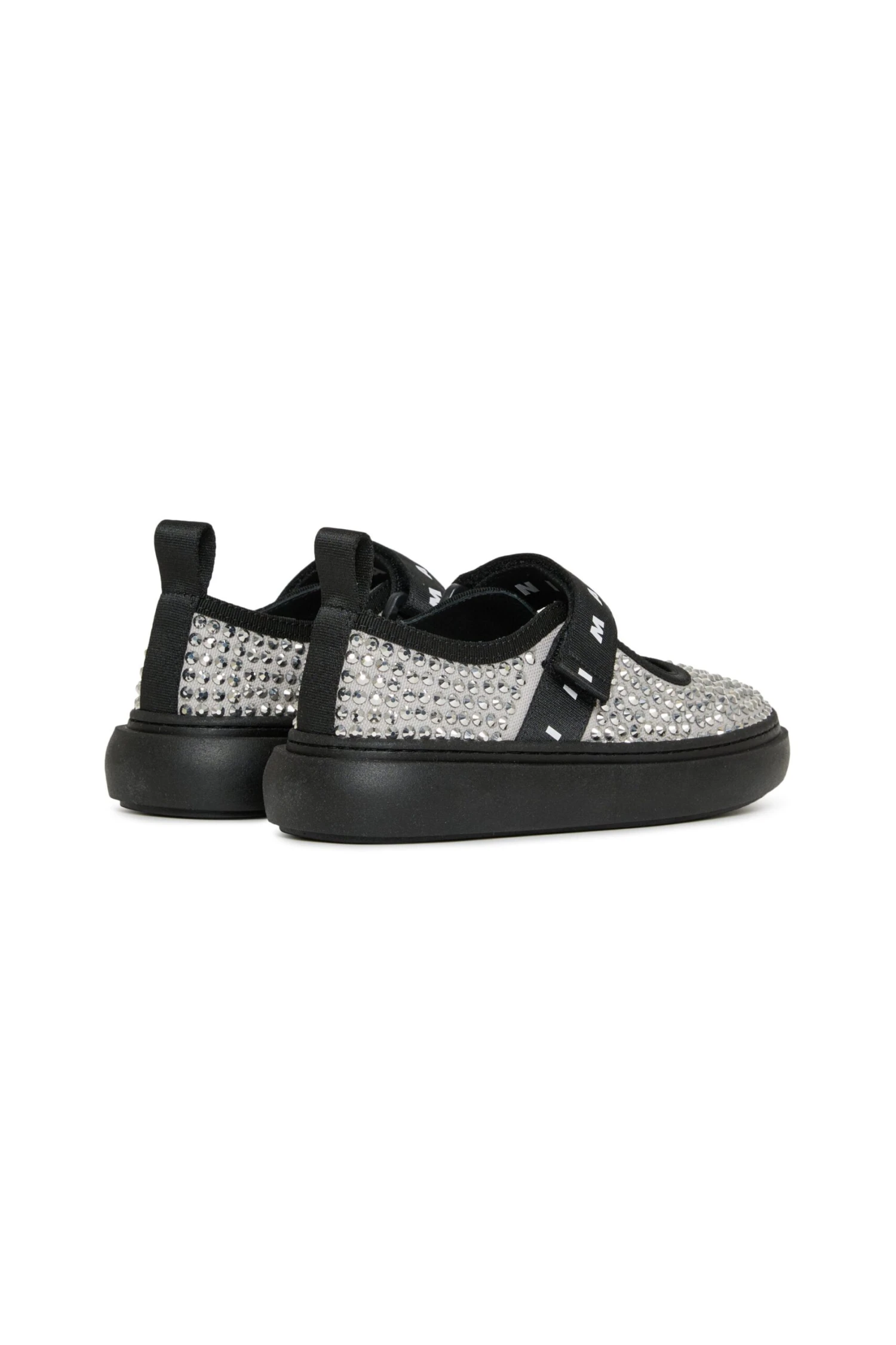Low Mary Jane trainers with logoed strap at the top. Canvas upper entirely covered in rhinestones. Calf leather inner lining. Thermoplastic rubber sole. Made in Italy.
