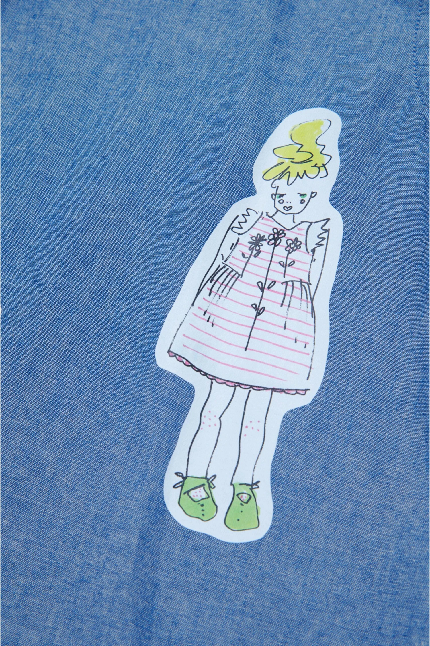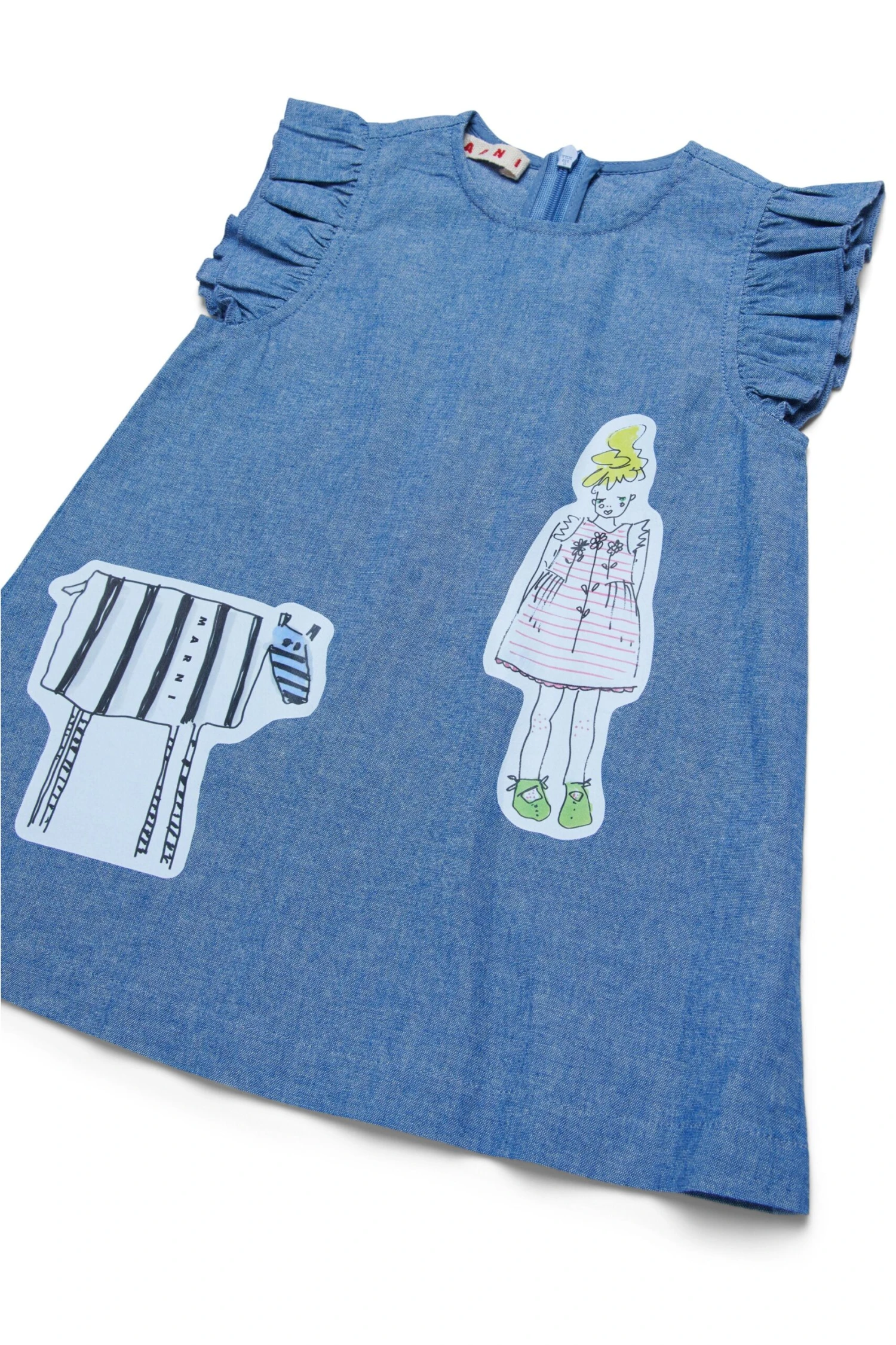Chambray dress with ruffles on the sleeves. Features contrasting color printed designs on the front. Back zip closure. Made of 100% cotton.