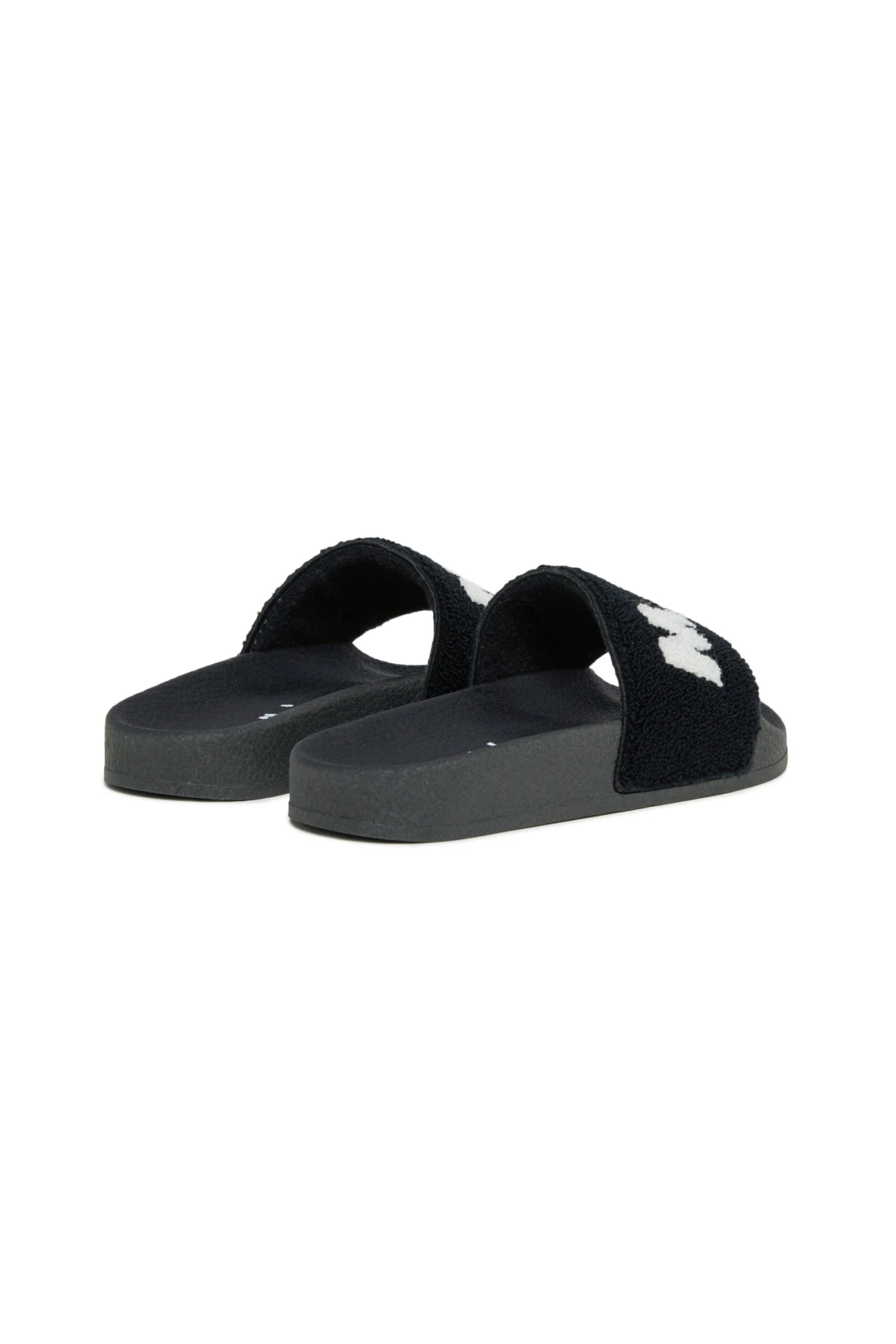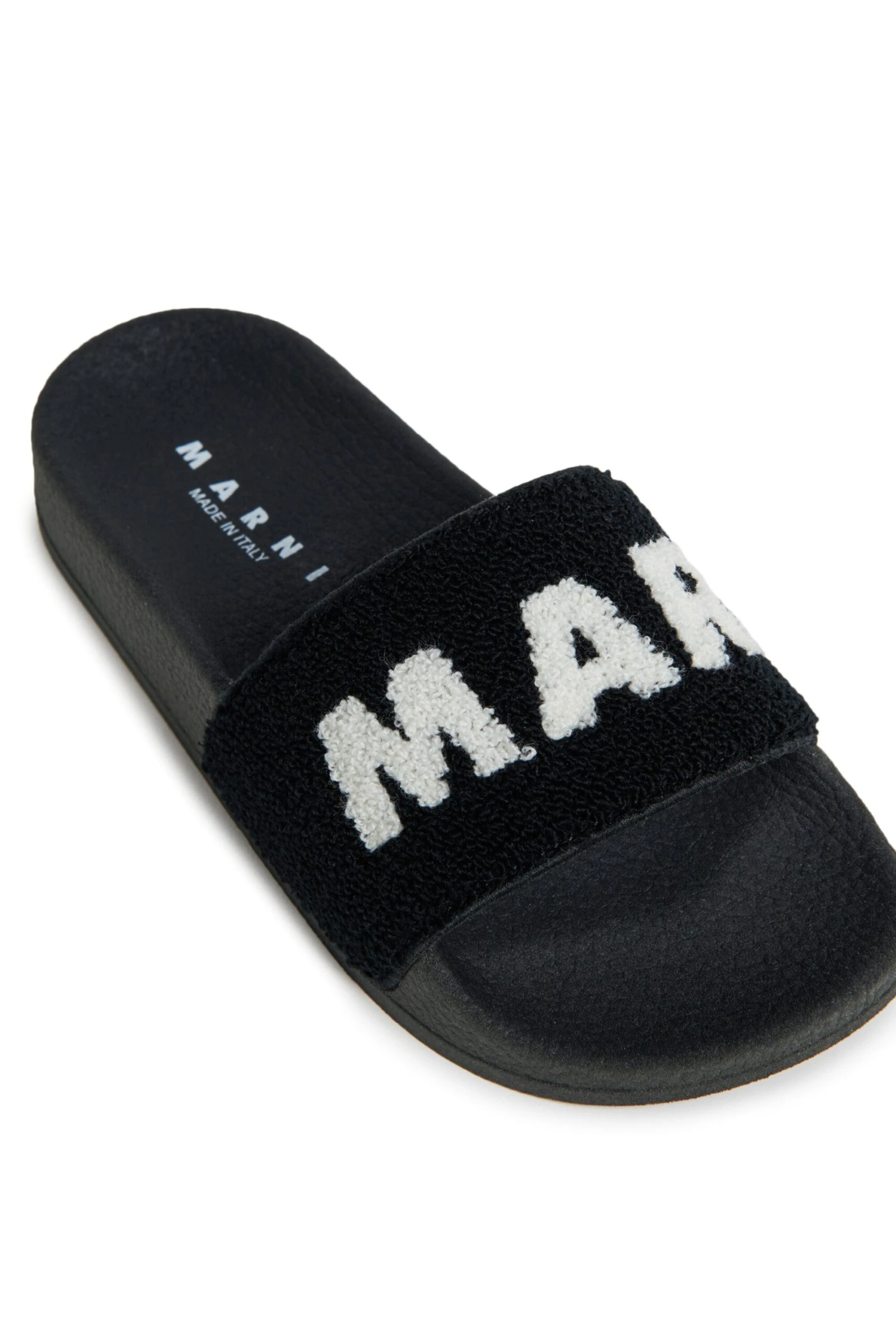 Modern design slide slippers. Terrycloth upper with maxi Marni! logo embroidered in contrasting colour. Polyurethane sole. Made in Italy.