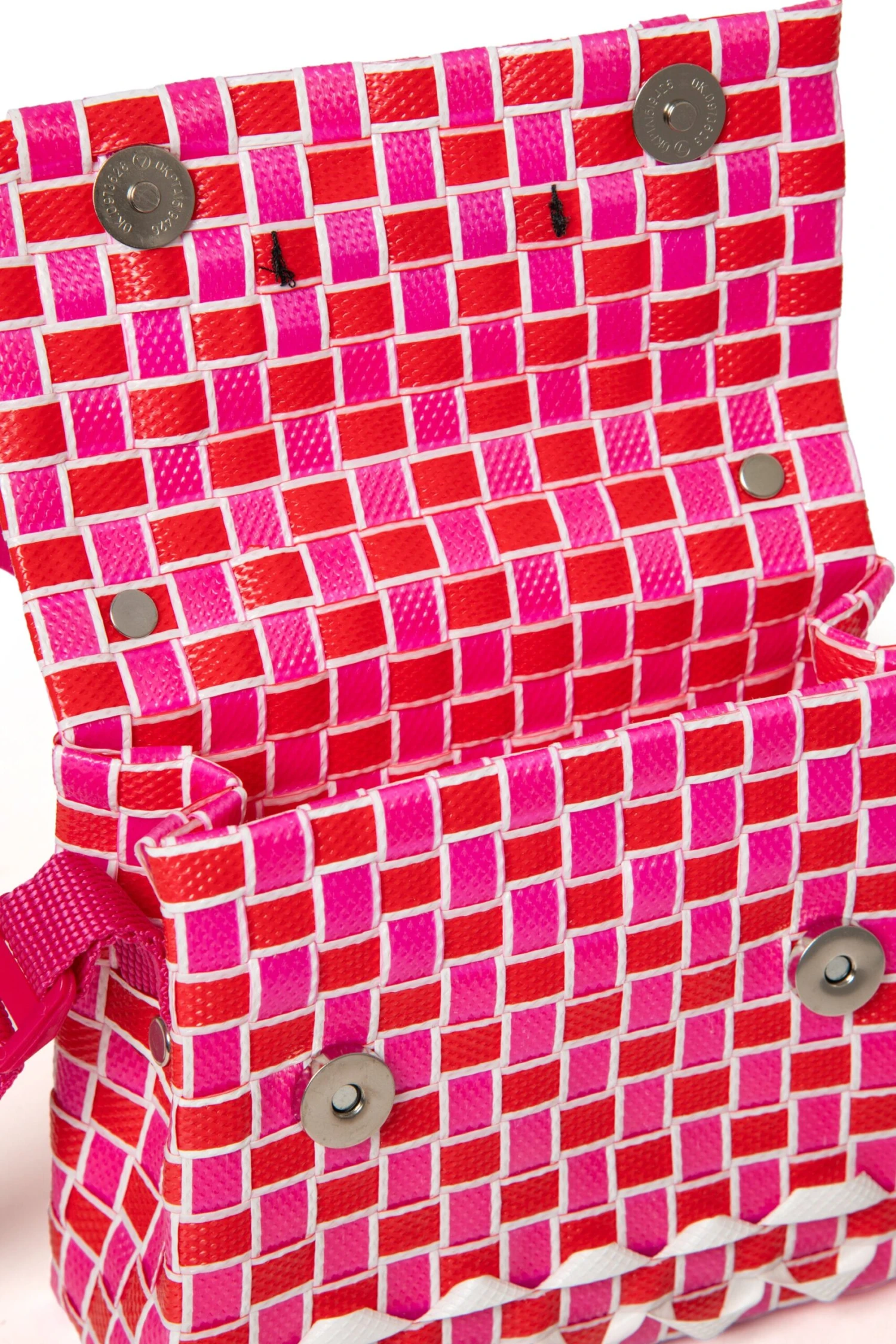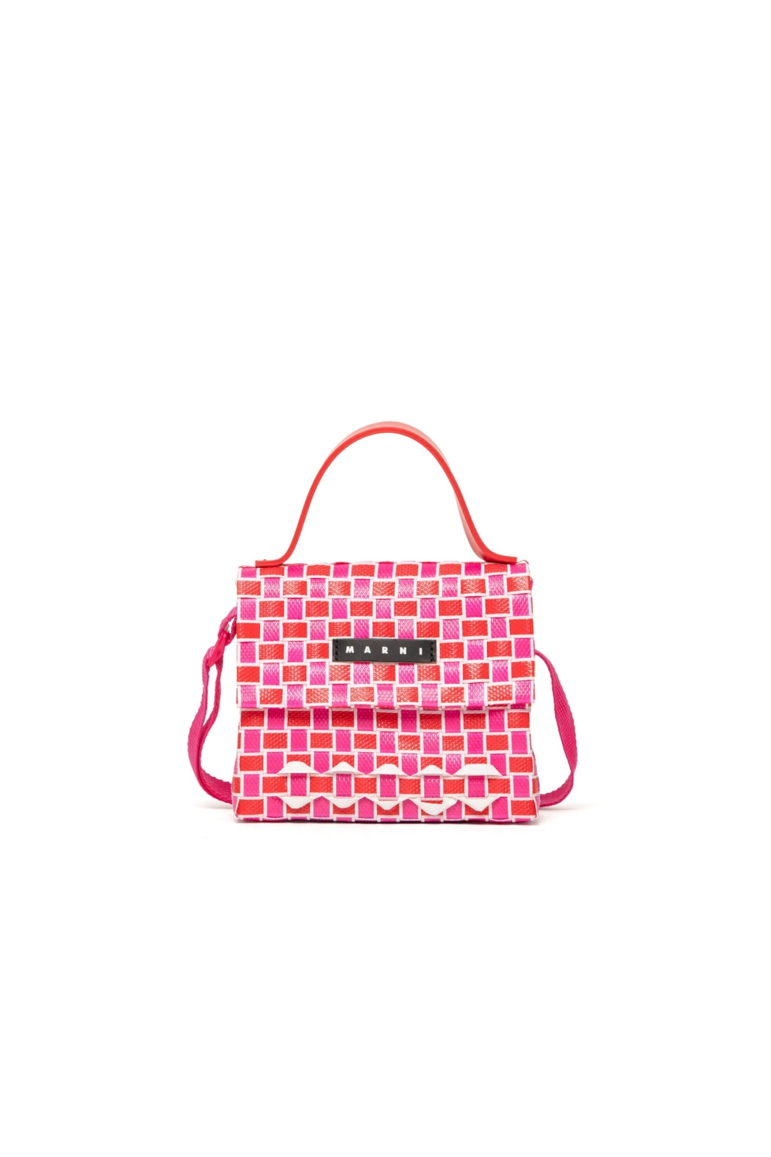 Joy Macro bag with magnet closure. The item features a woven body with a geometric pattern on which the Marni institutional logo is applied. Rubber handle. Carried by hand and cross-body. Ribbon adjustable (fixed) shoulder strap. Measurements: 15 cm high, 17 cm wide, 6.5 cm deep. Handle drop: 45 cm.