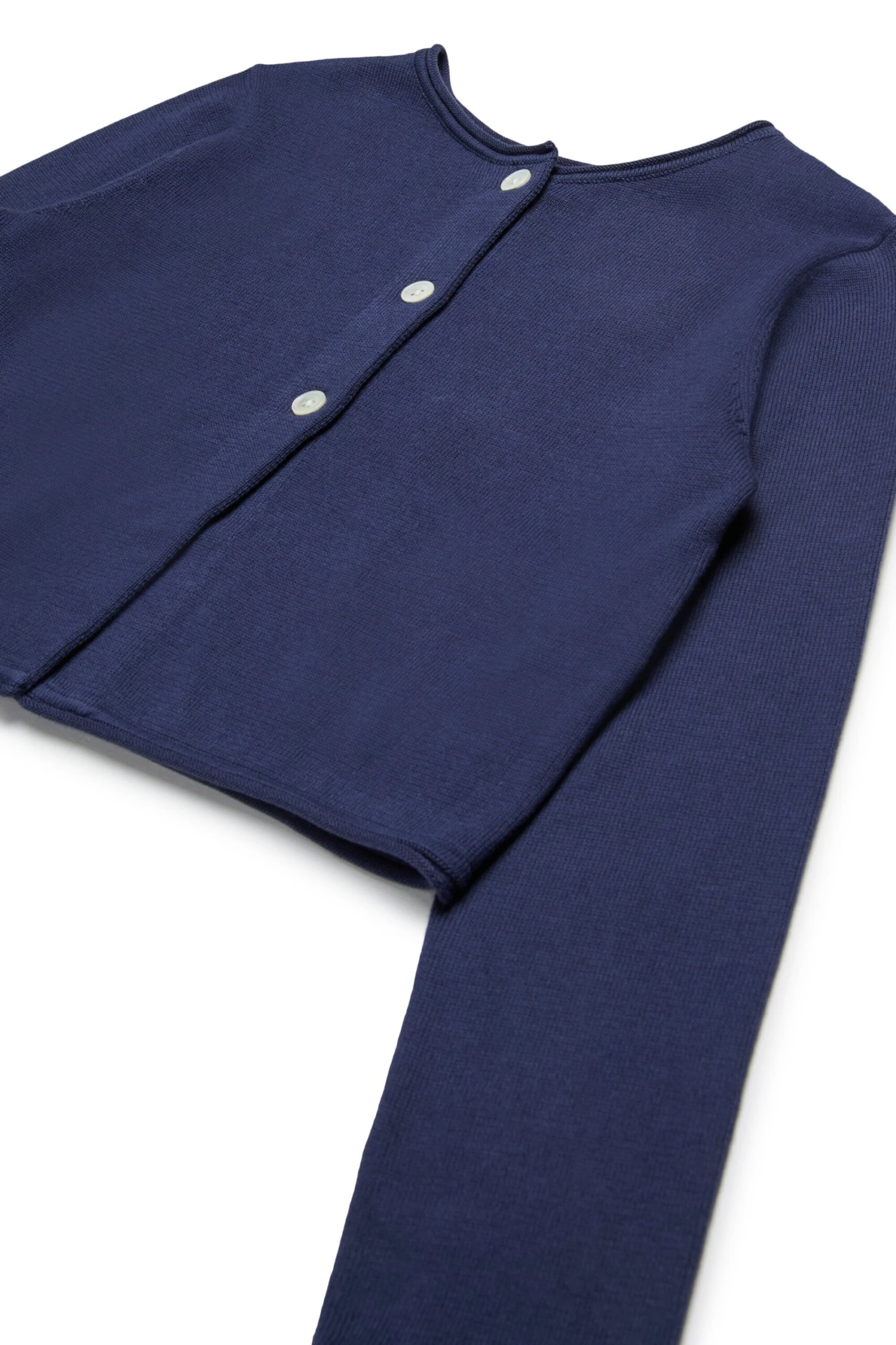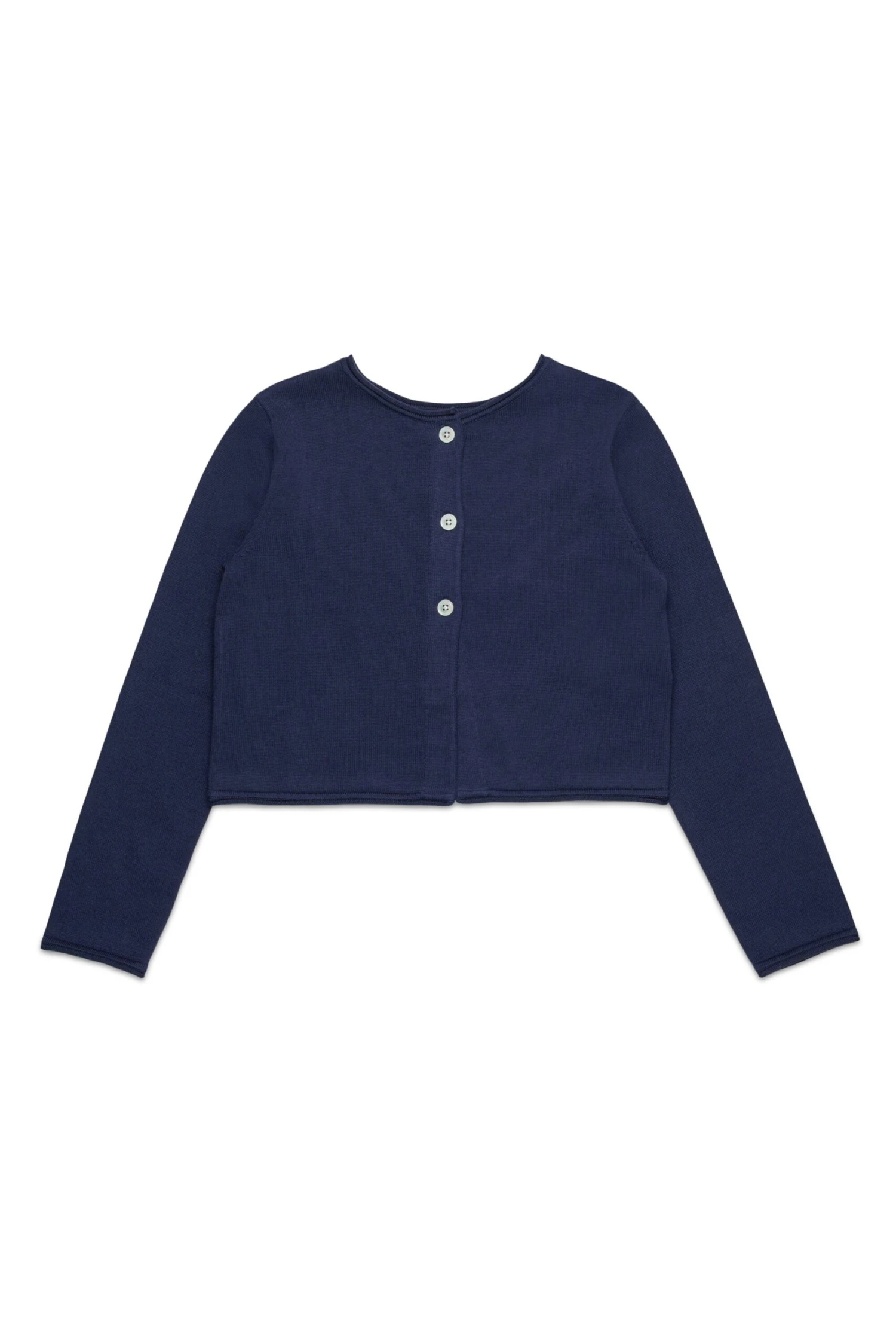 100% cotton long-sleeved cardigan. Can also be worn as a crew-neck pullover. Embroidery in contrasting colour on the back. Raw-cut hems. Button closure.