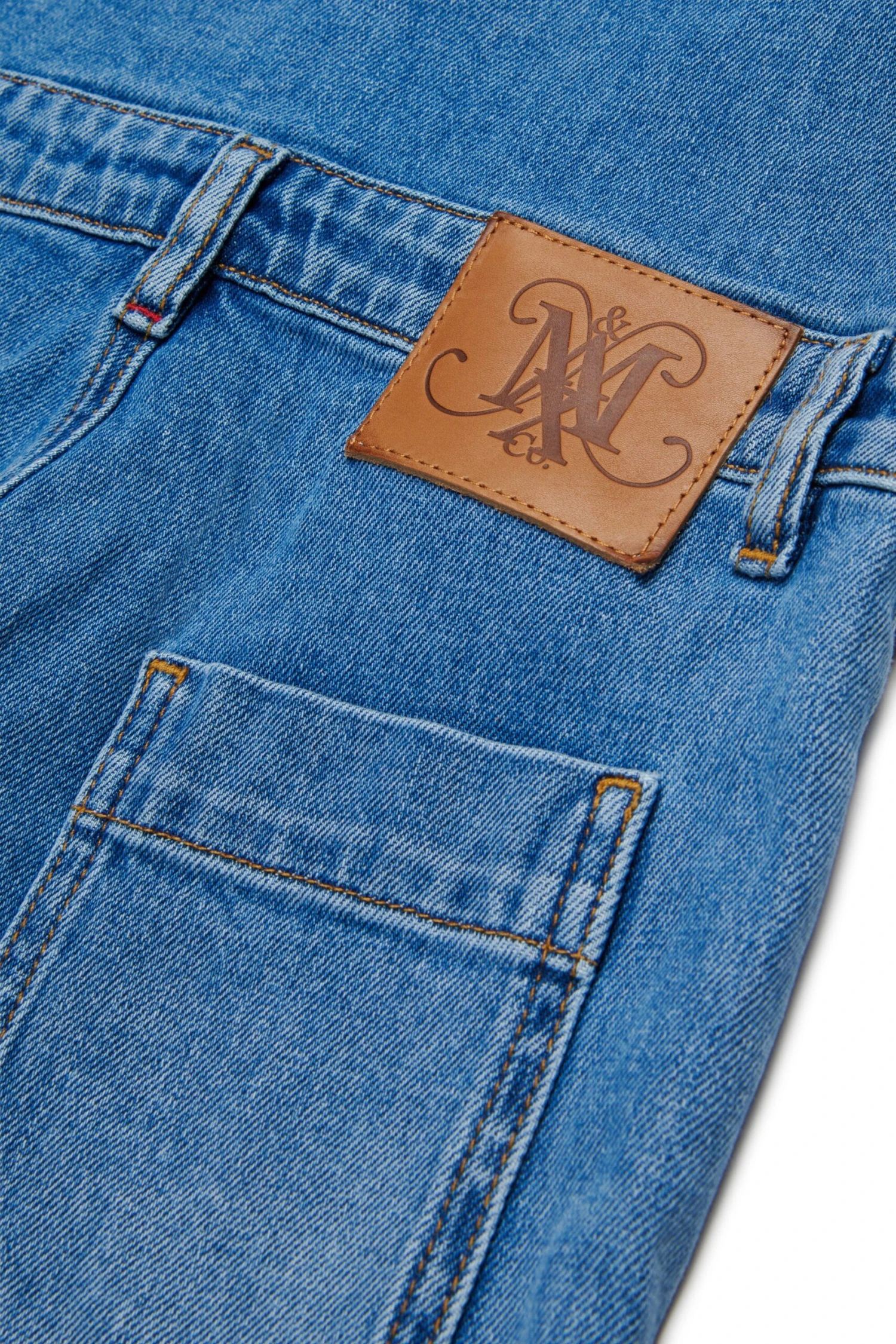 Wide fit one-piece jumpsuit with short sleeves and long pants. Made of medium blue denim characterised by colour contrasting gradients. Front button closure with logoed buttons. Features two front pockets and one back pocket. Leather flap with monogram badge on the back.