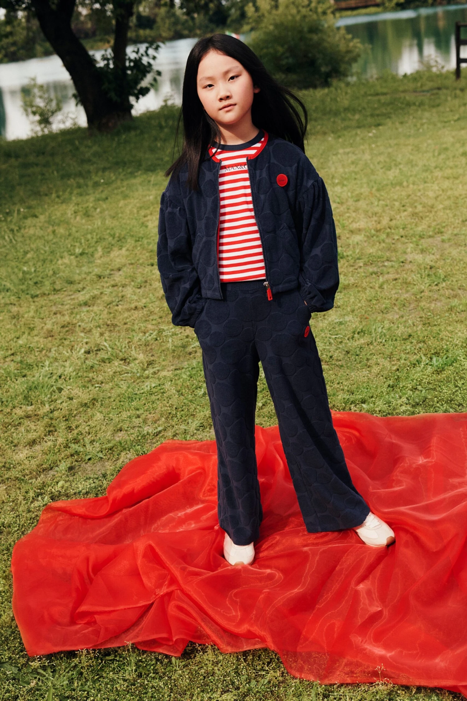 Wide-leg pants in cotton blend terry. Elasticated waistband. Characterised by an all-over print with embossed polka dots in two different sizes. Red Dot patch branded with MAX&Co. logo applied to the front. Contrasting colour piping along the front pockets. Comfortable and ideal for everyday occasions and sport.