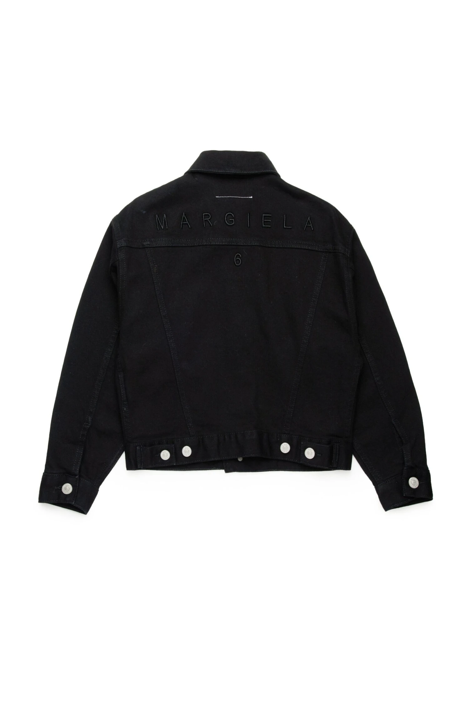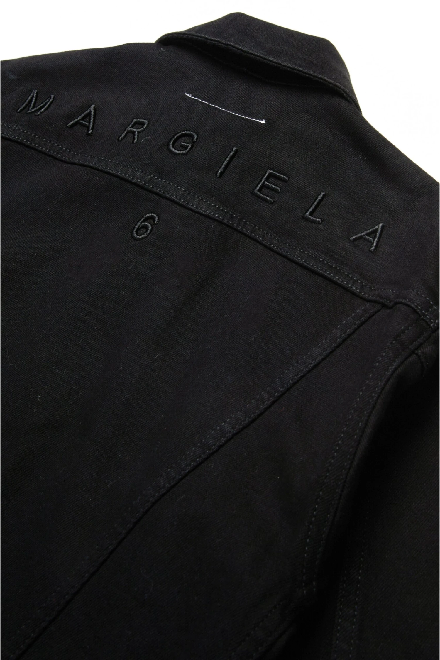 Long-sleeved jeans jacket. Black denim with a clean look. Margiela 6 logo embroidered in tone on the back. Welt pockets and small pockets on the front. Front button closure. Iconic seam at back.