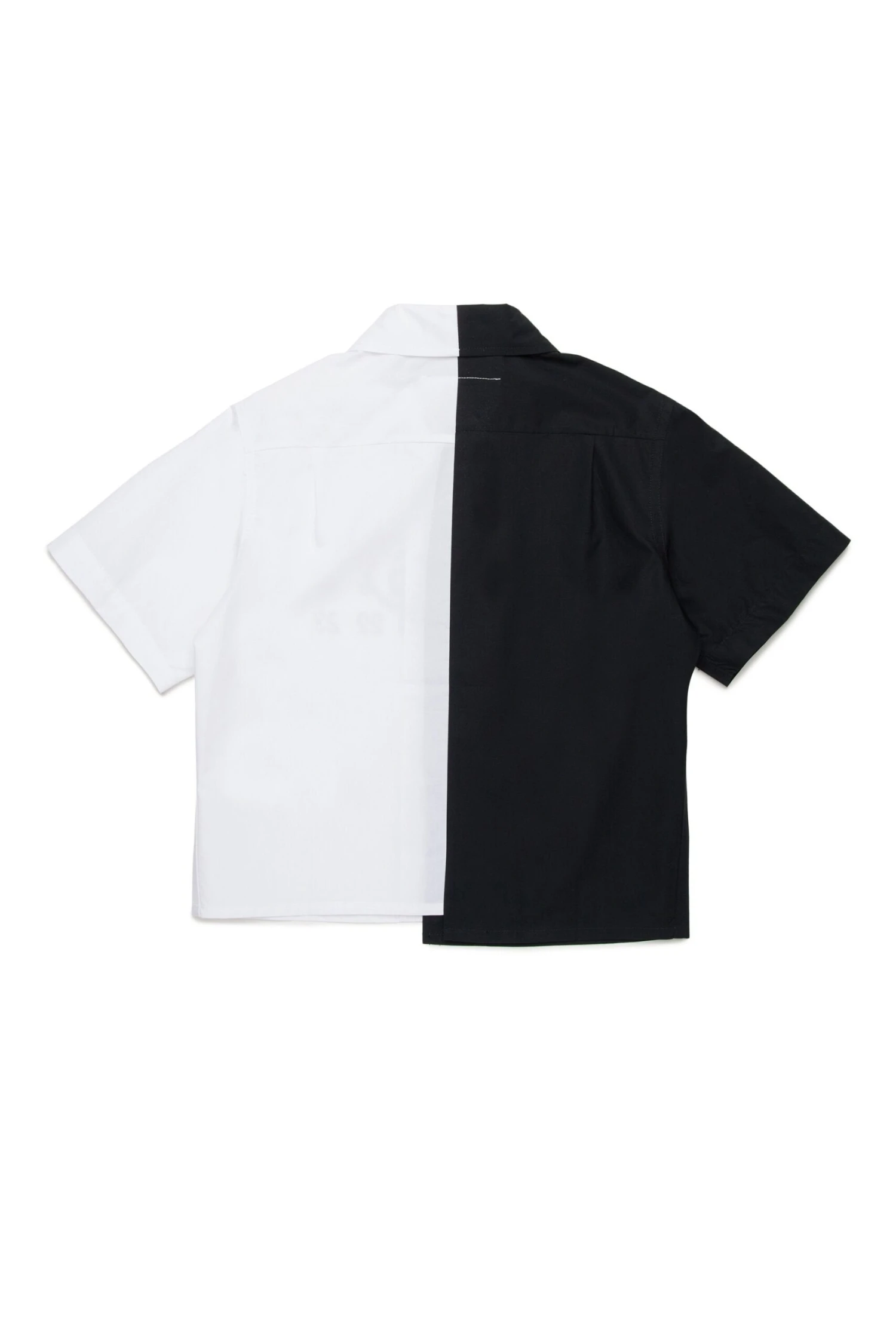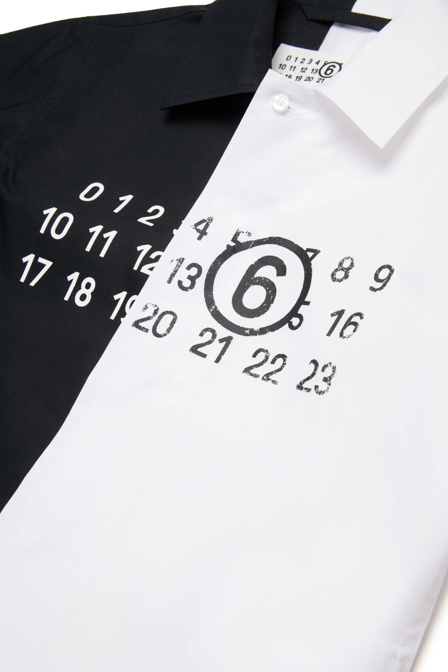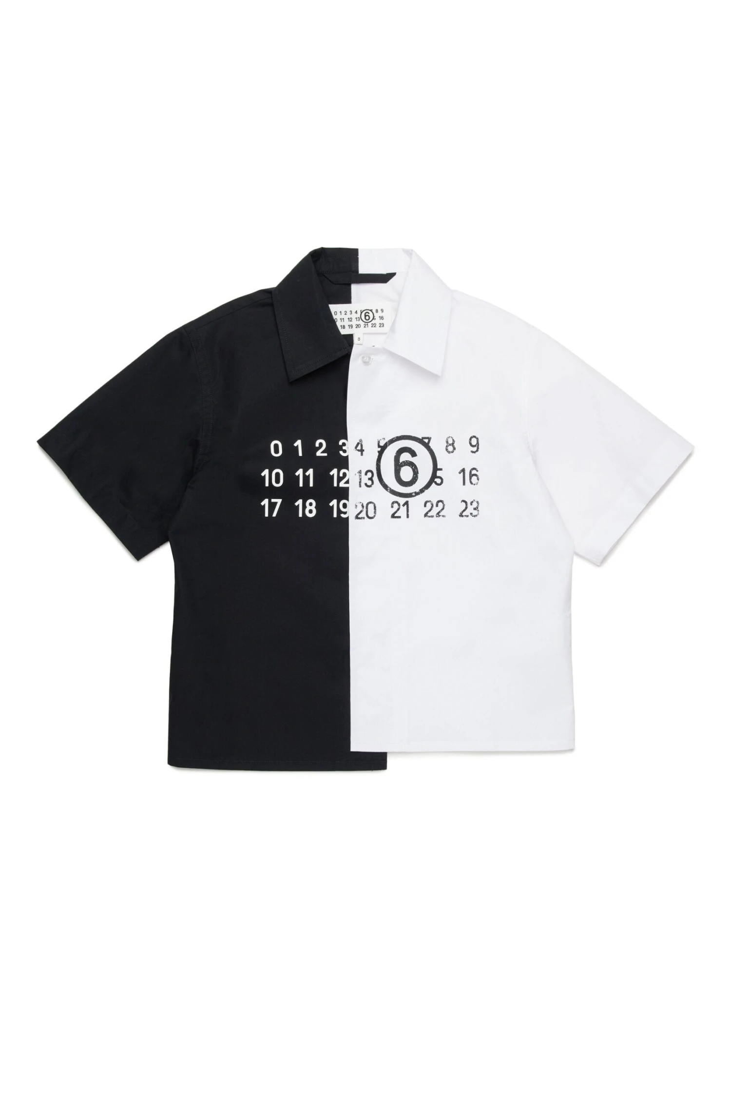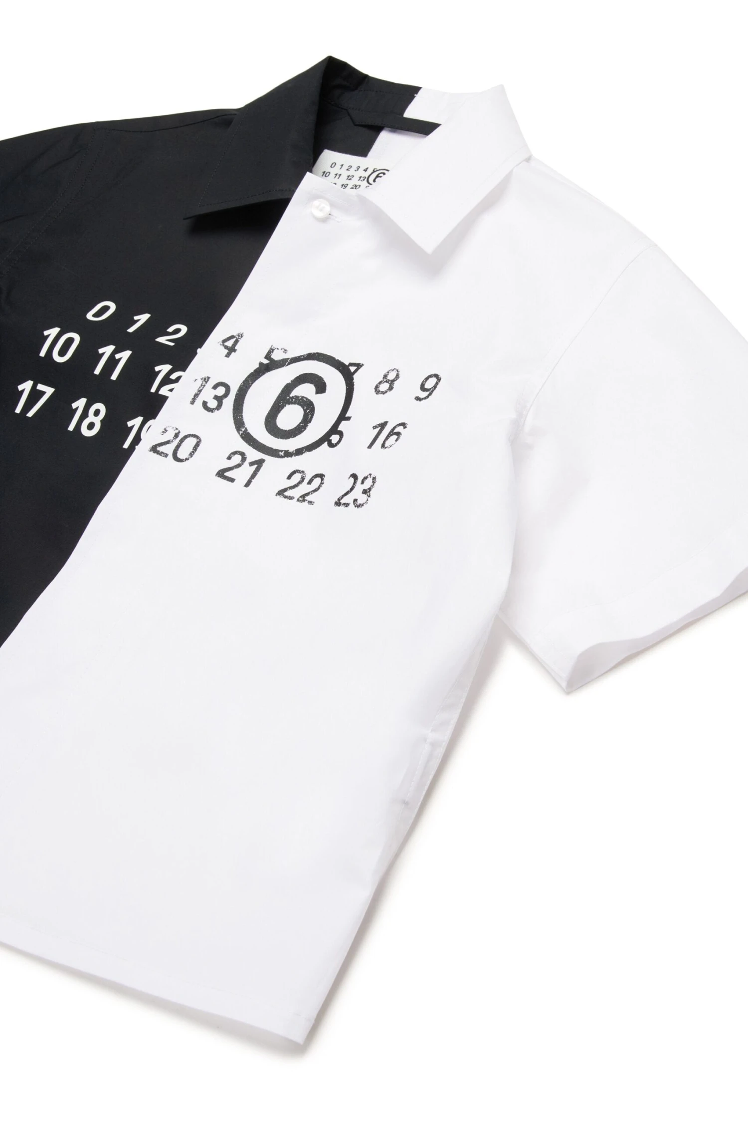 Short-sleeved shirt in poplin with colorblock effect. Re-cut construction that simulates the assembly of two previously unstructured garments. Stamp Numbers graphic on the front. Iconic seam on the back. Made of 100% cotton.