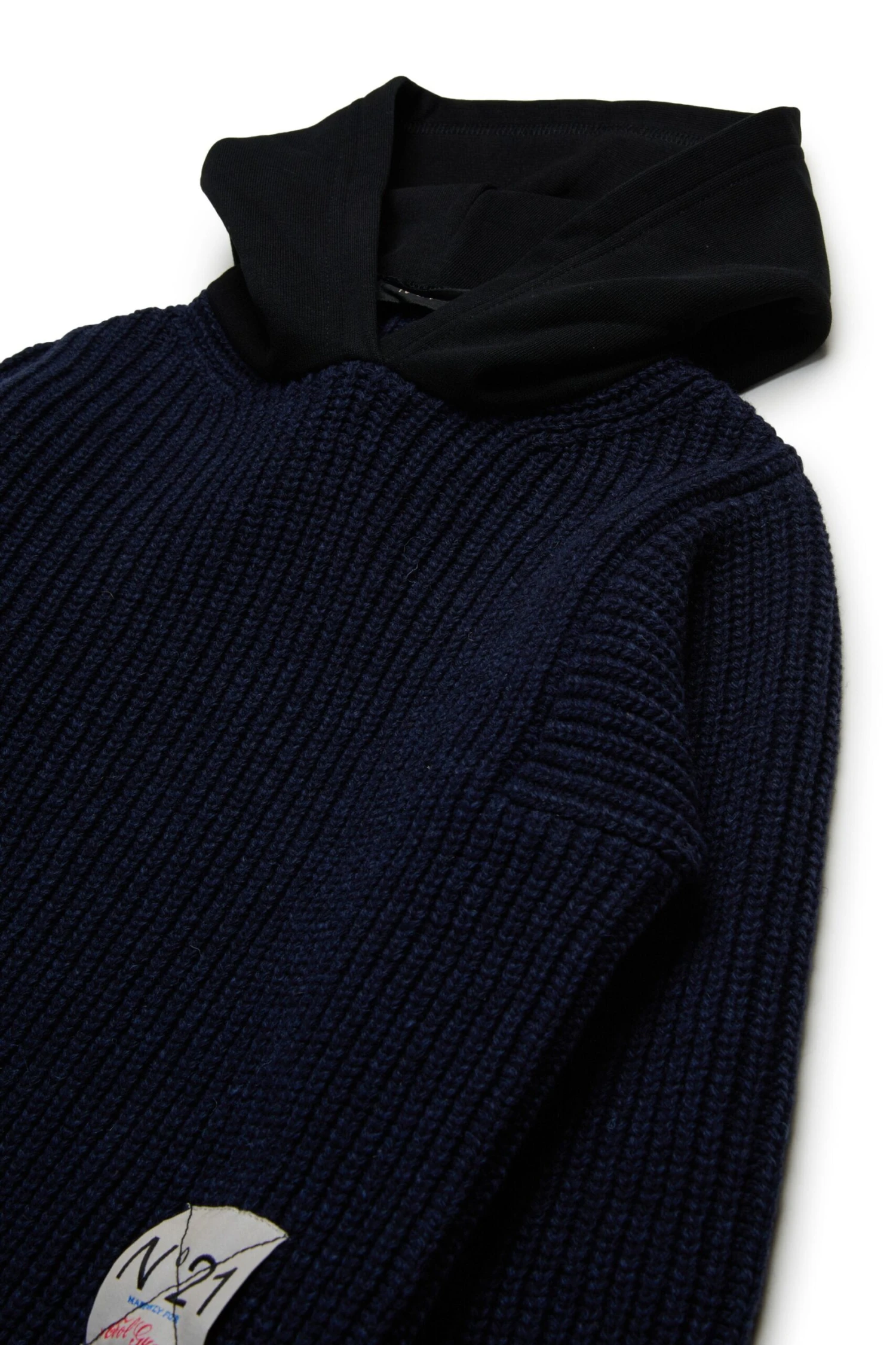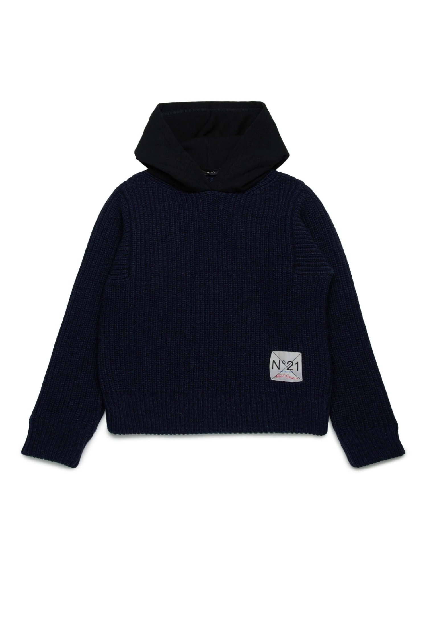 Wool-blend sweater with contrasting color hooded sweatshirt. The rib construction of the body combines with the sporty attitude of the hood, creating a balance between comfort and casual style.