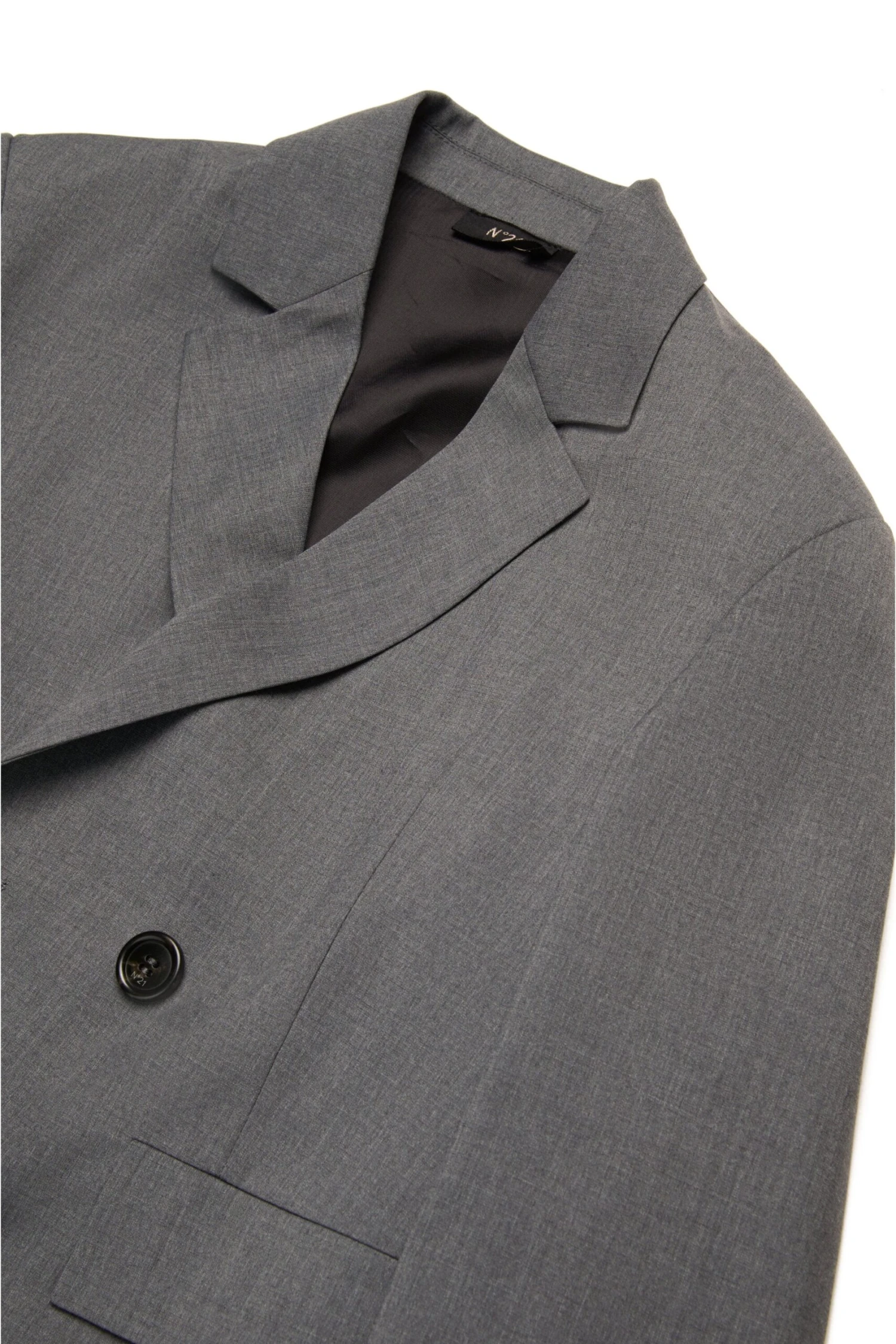 Oversize formal blazer jacket. Made of cool wool with poplin details on the sleeves. Label N°21 on the sleeves. Double-breasted front button closure. Pocket decoration on the front. Viscose inner lining. A perfect garment for ceremonies and special occasions.