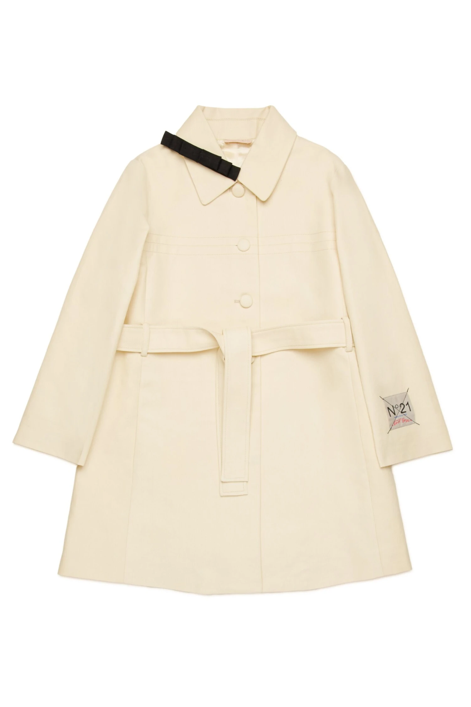 Long-sleeved trench jacket. Made of 100% cotton. Label N°21 on the sleeves. Removable bow on collar. Covered button closure on front. Waist belt with belt loops. Welt pockets on the front. Inner viscose lining.