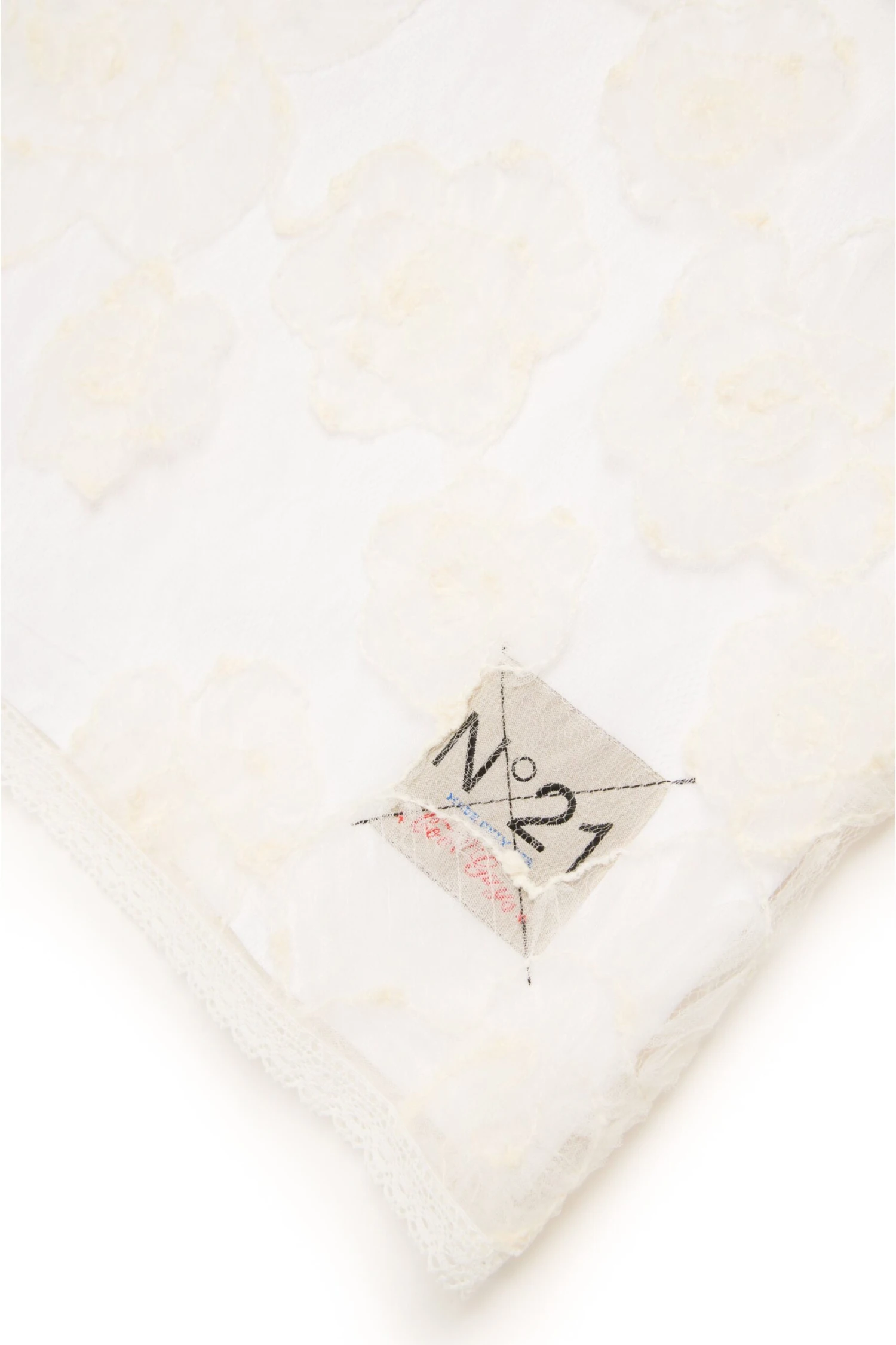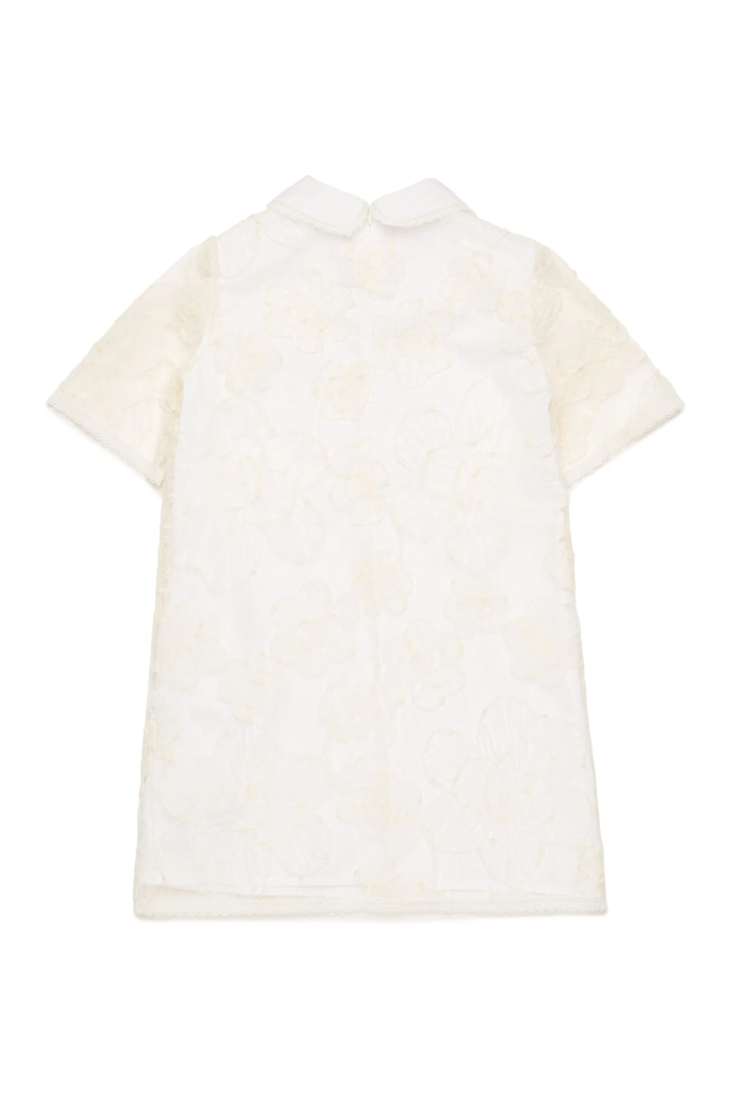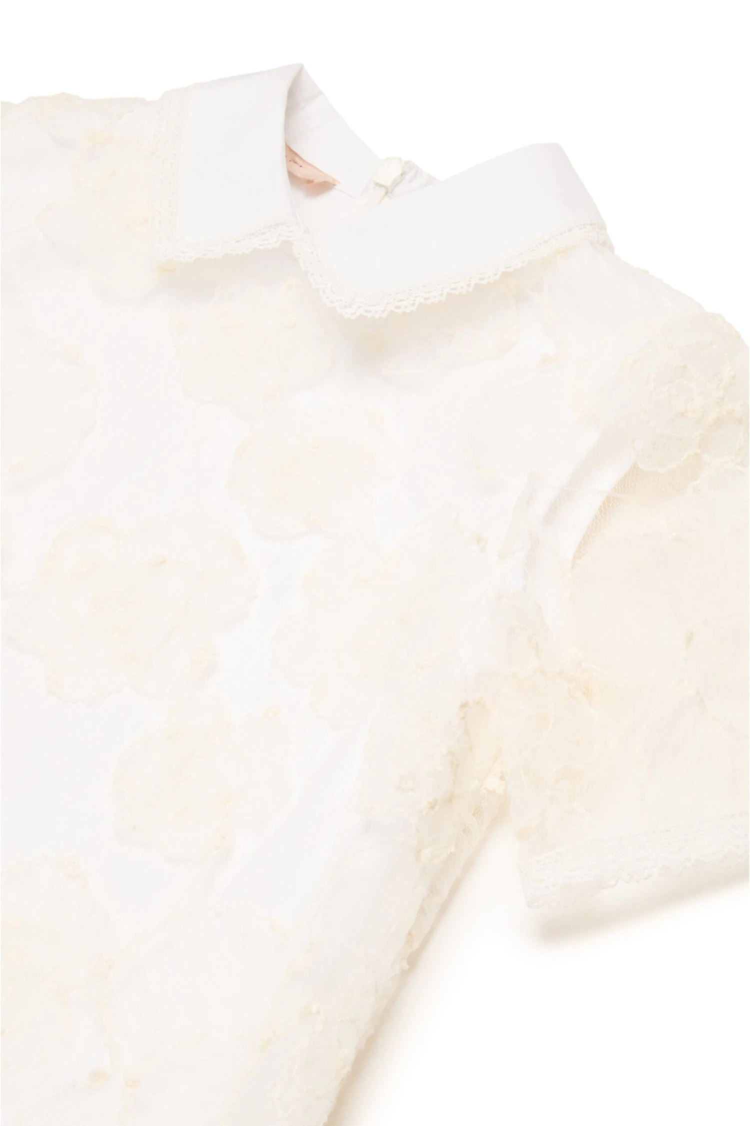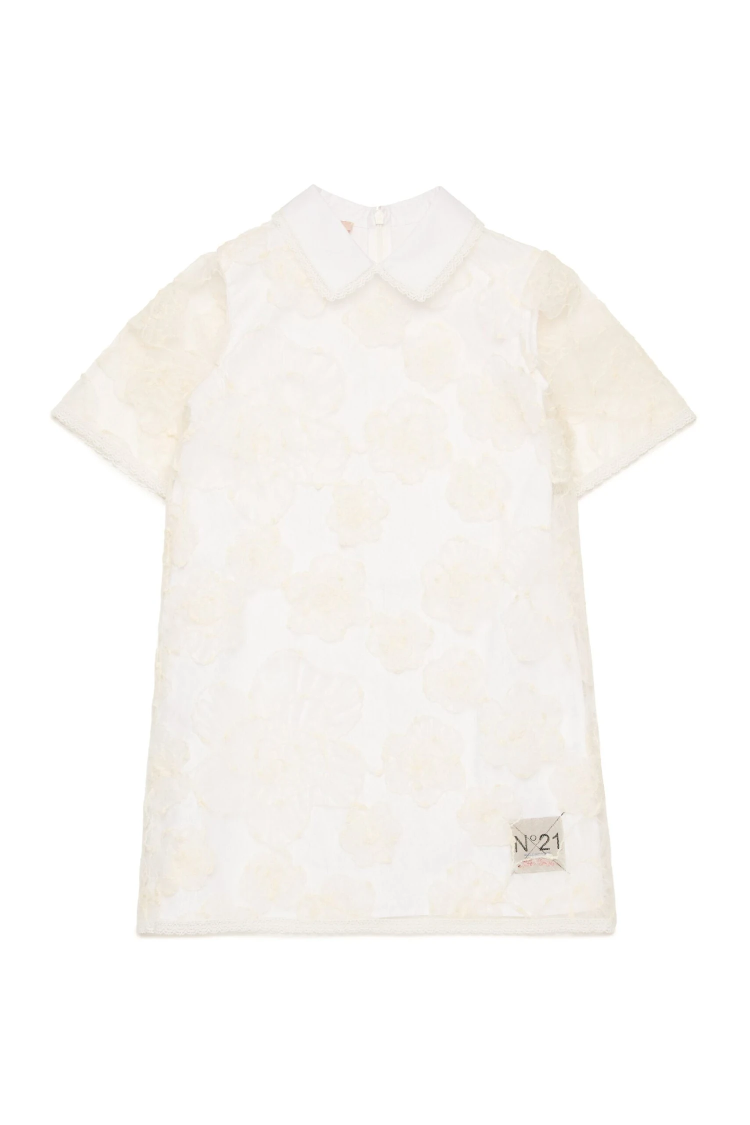 Dress with short-sleeved collar. Multilayer construction. Outer layer in floral-embroidered organza. Poplin inner lining with Label N°21 applied on the front. Lace hems. Back zip closure. A perfect garment for ceremonies and special occasions.