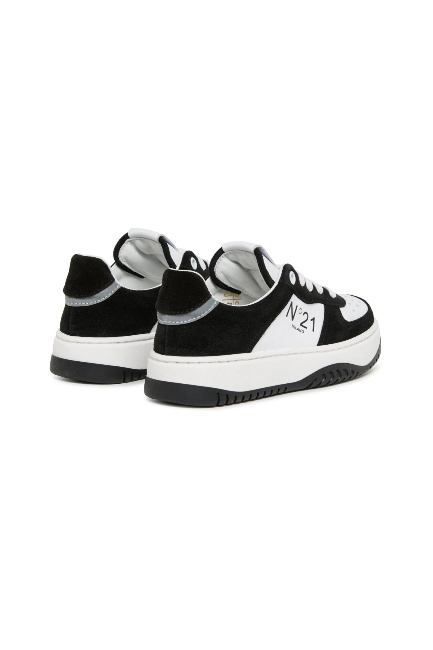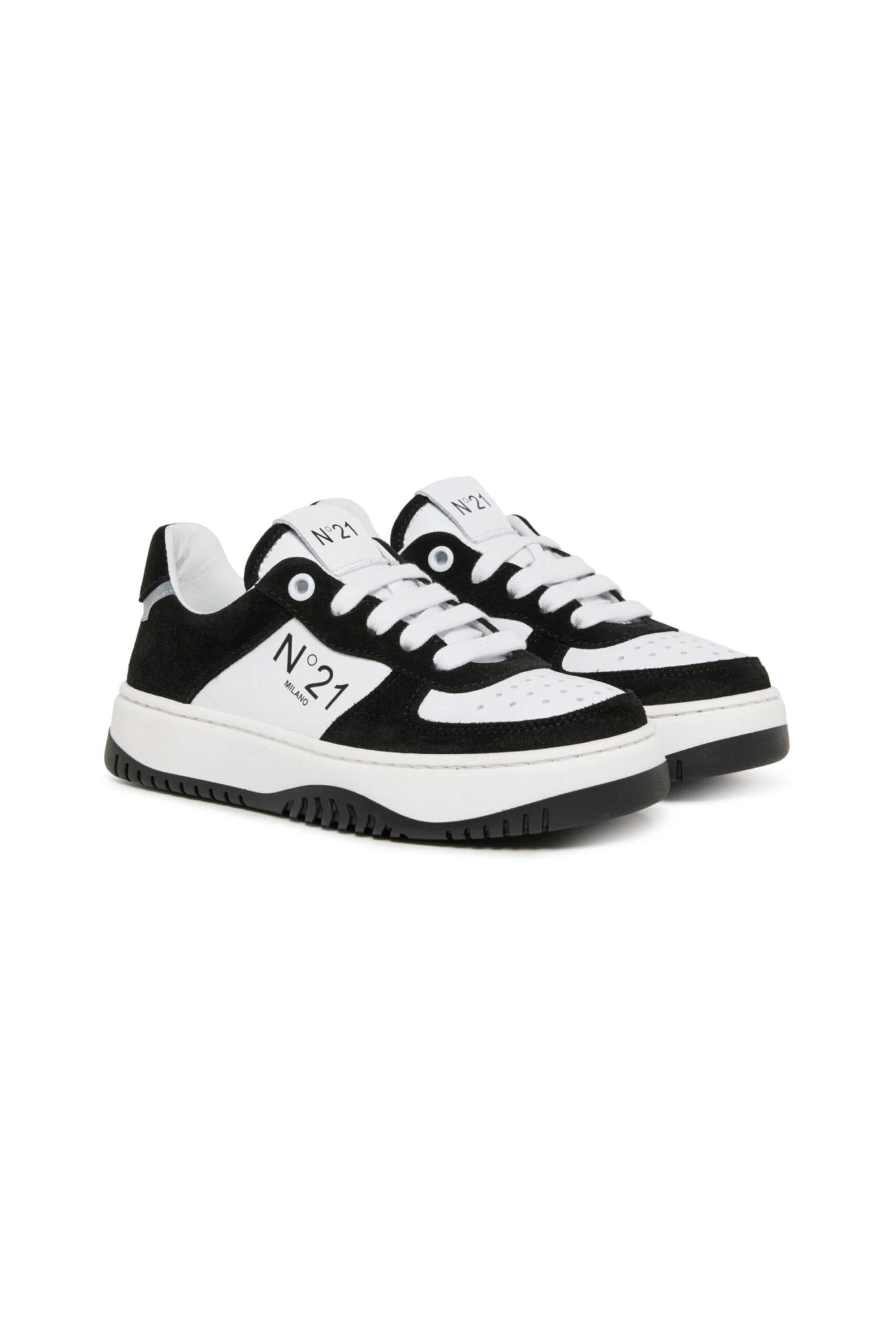 Low lace-up two-tone trainers with N°21 Milano logo branded on the side. Calf leather upper and inner lining. Thermoplastic rubber sole. Made in Italy.