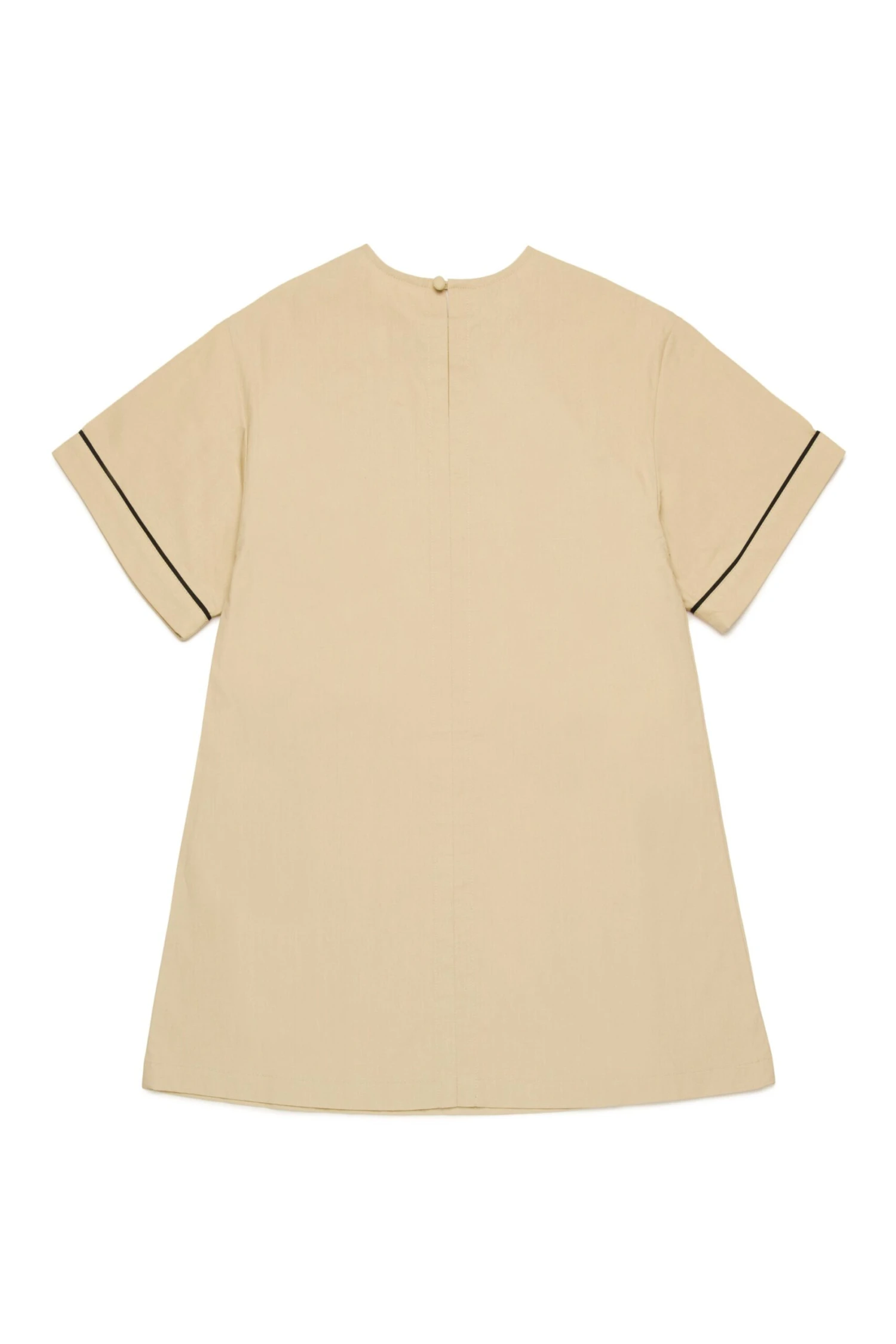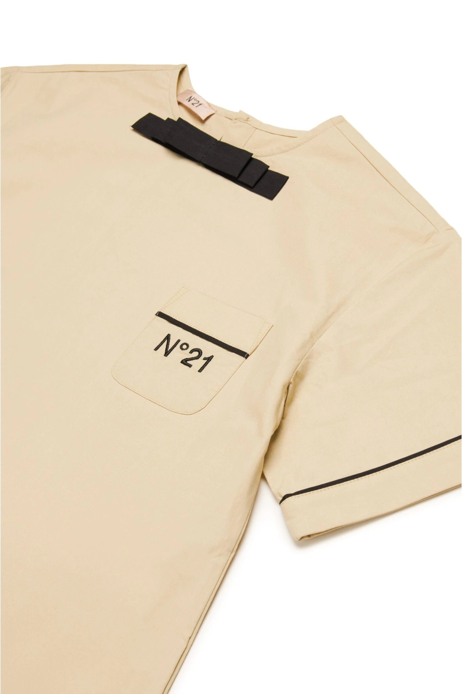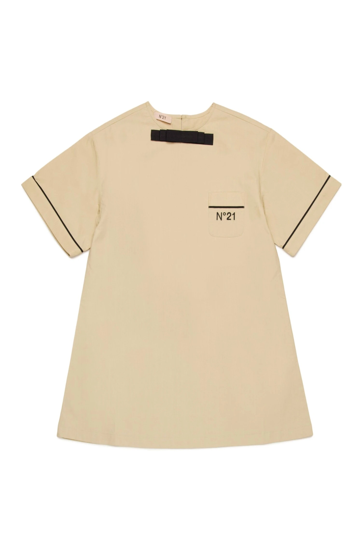 Short-sleeved poplin dress. Removable bow at neck. Pocket with branded N°21 logo on the front on the heart side. Contrasting color piping on armhole. Drop closure on the back. Made of 100% cotton.