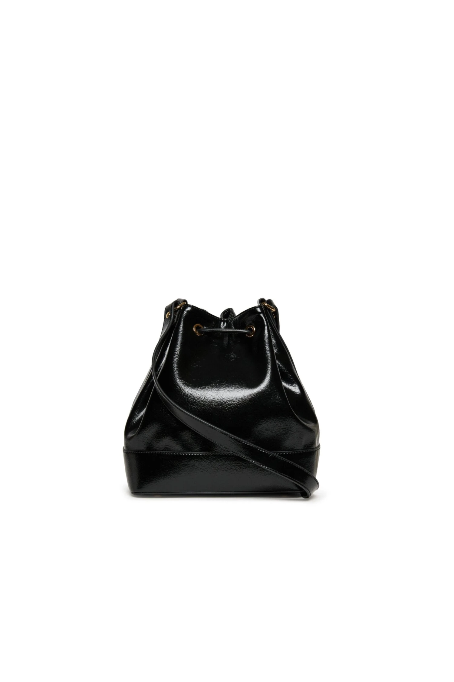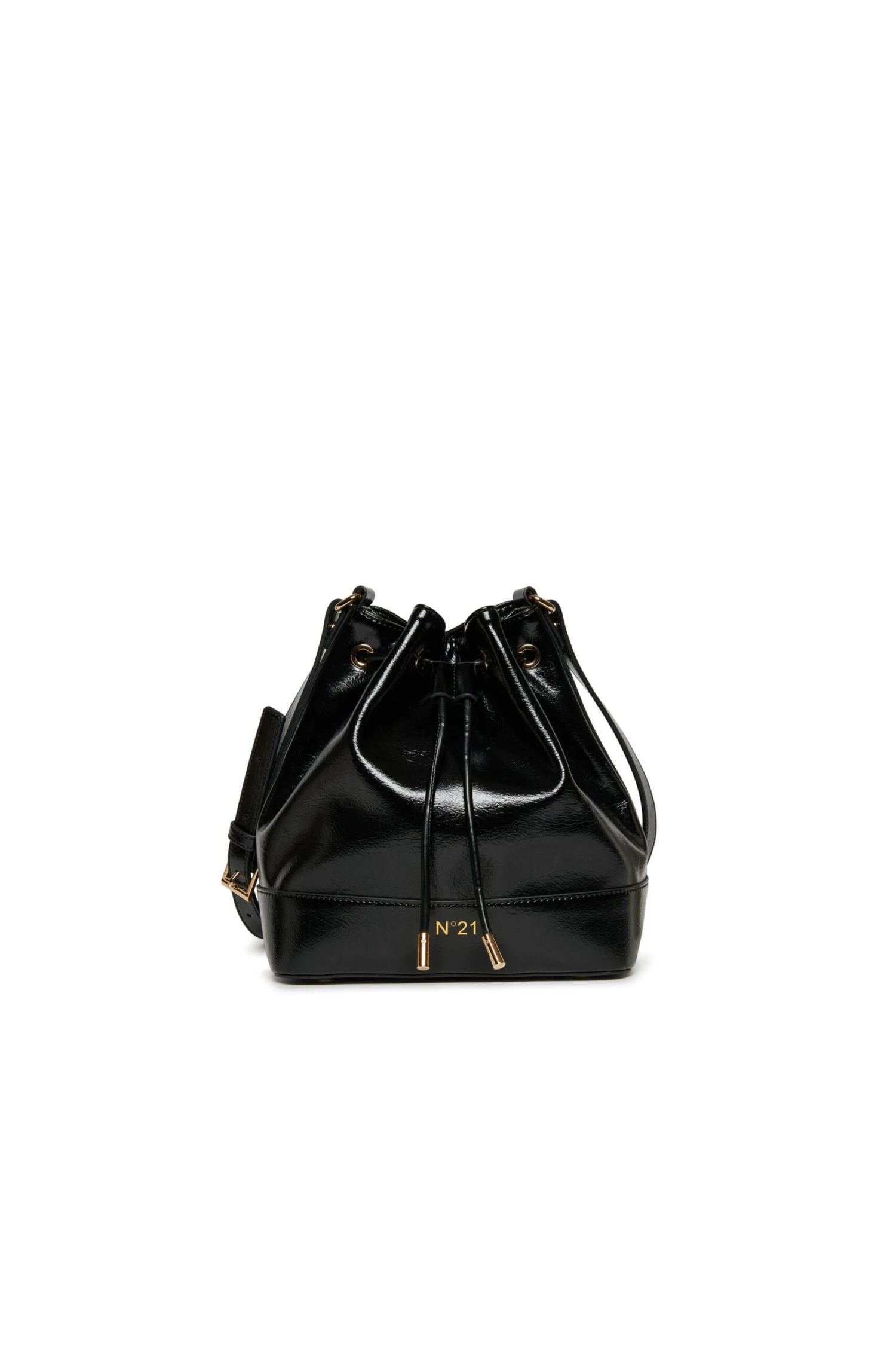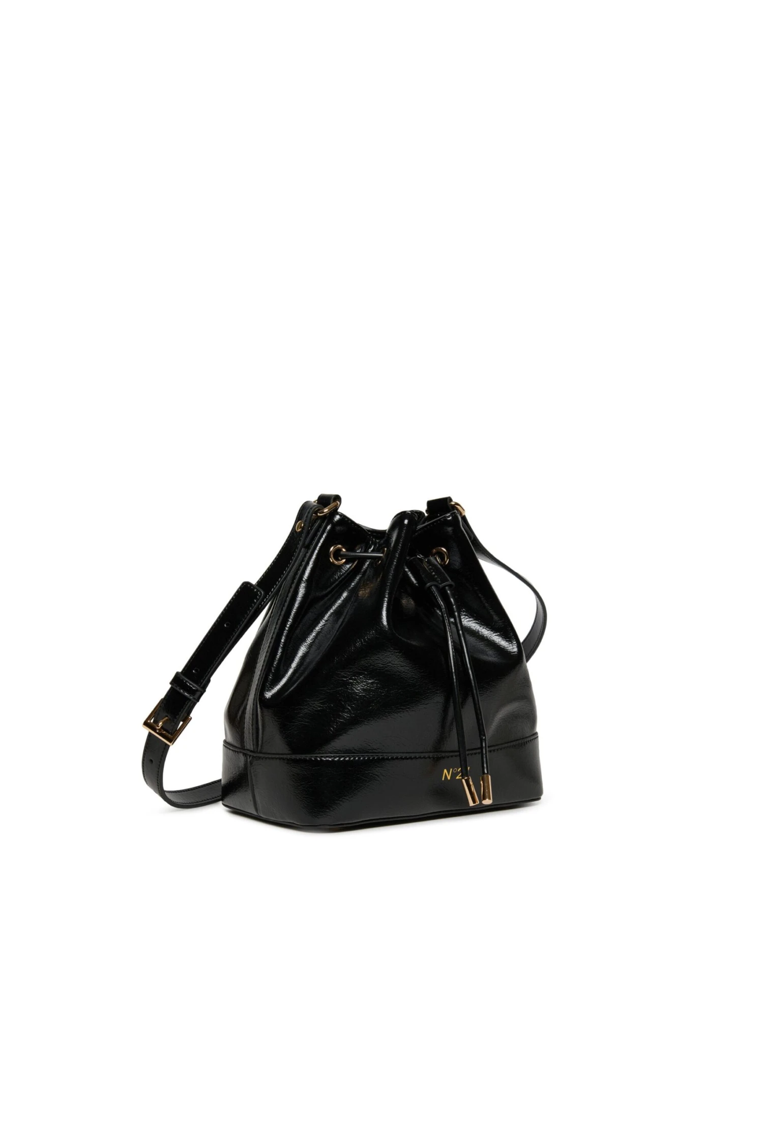 Shiny effect bag with bucket bag shape. Drawstring closure. Golden details. N°21 Institutional logo on one side. Feet on the bottom. Wearable cross bodysuit. Adjustable and removable shoulder strap. Inner canvas lining. Measurements: 23 cm high, 21 cm wide, 14 cm deep. Handle drop: 46 cm.