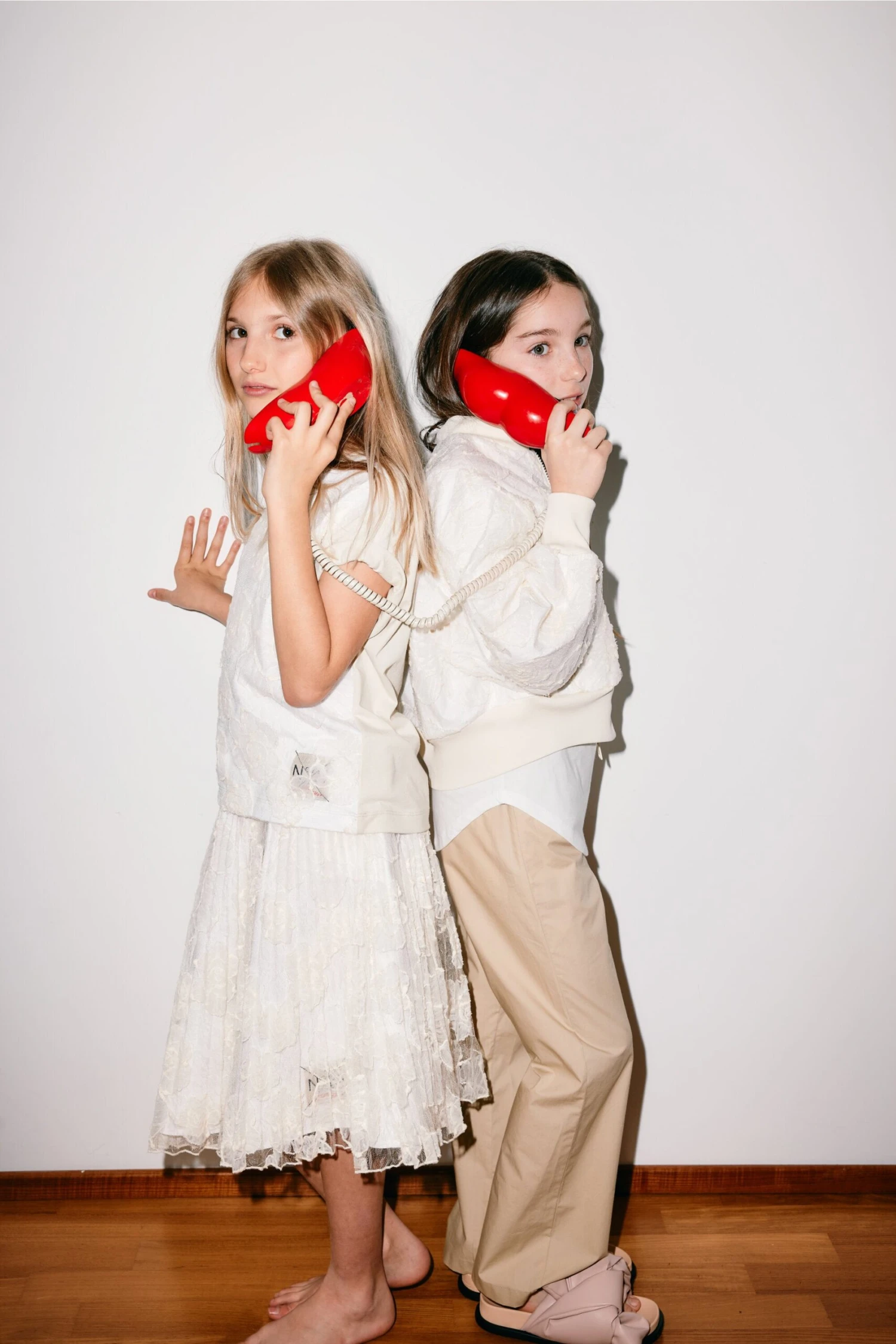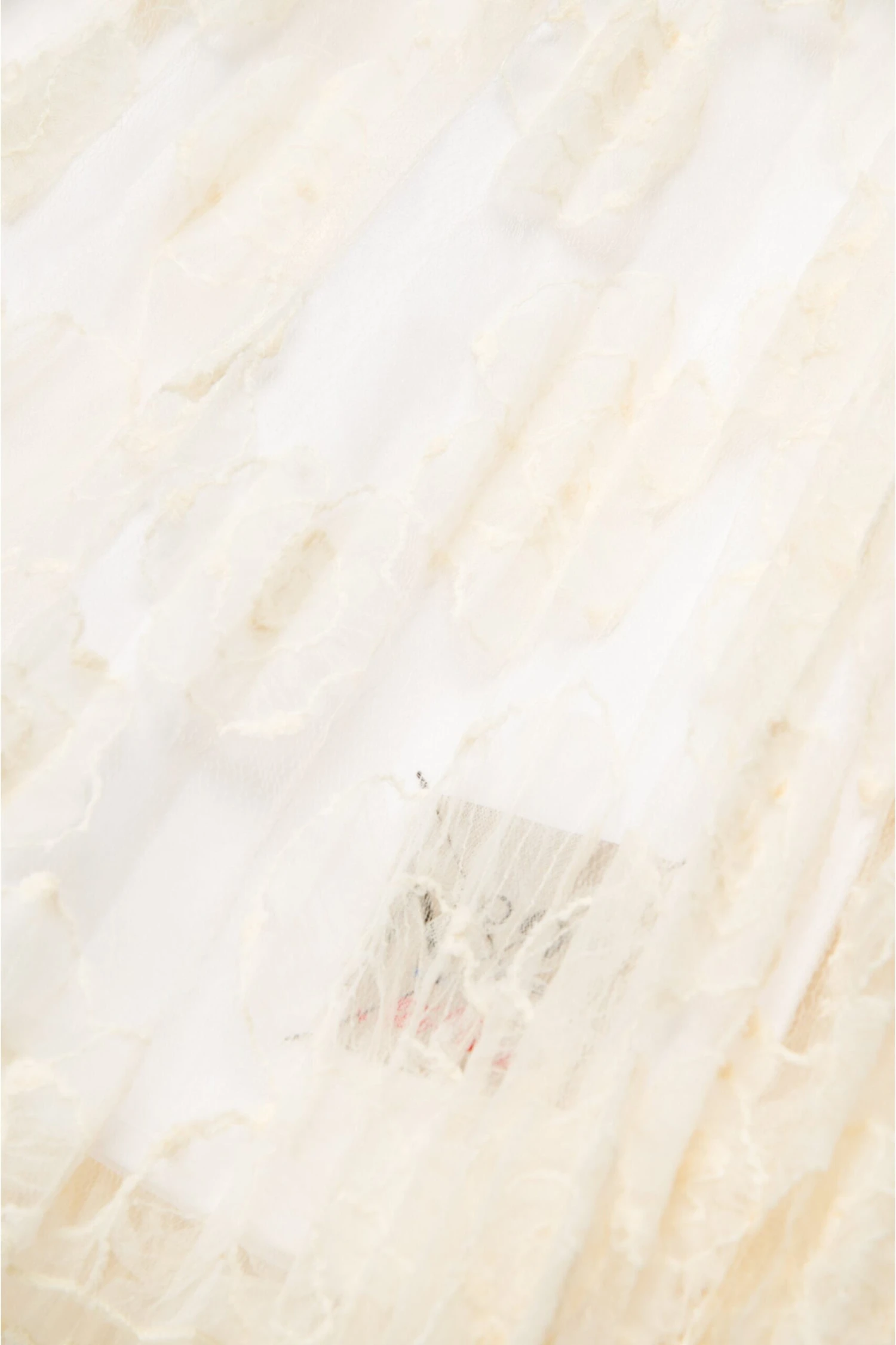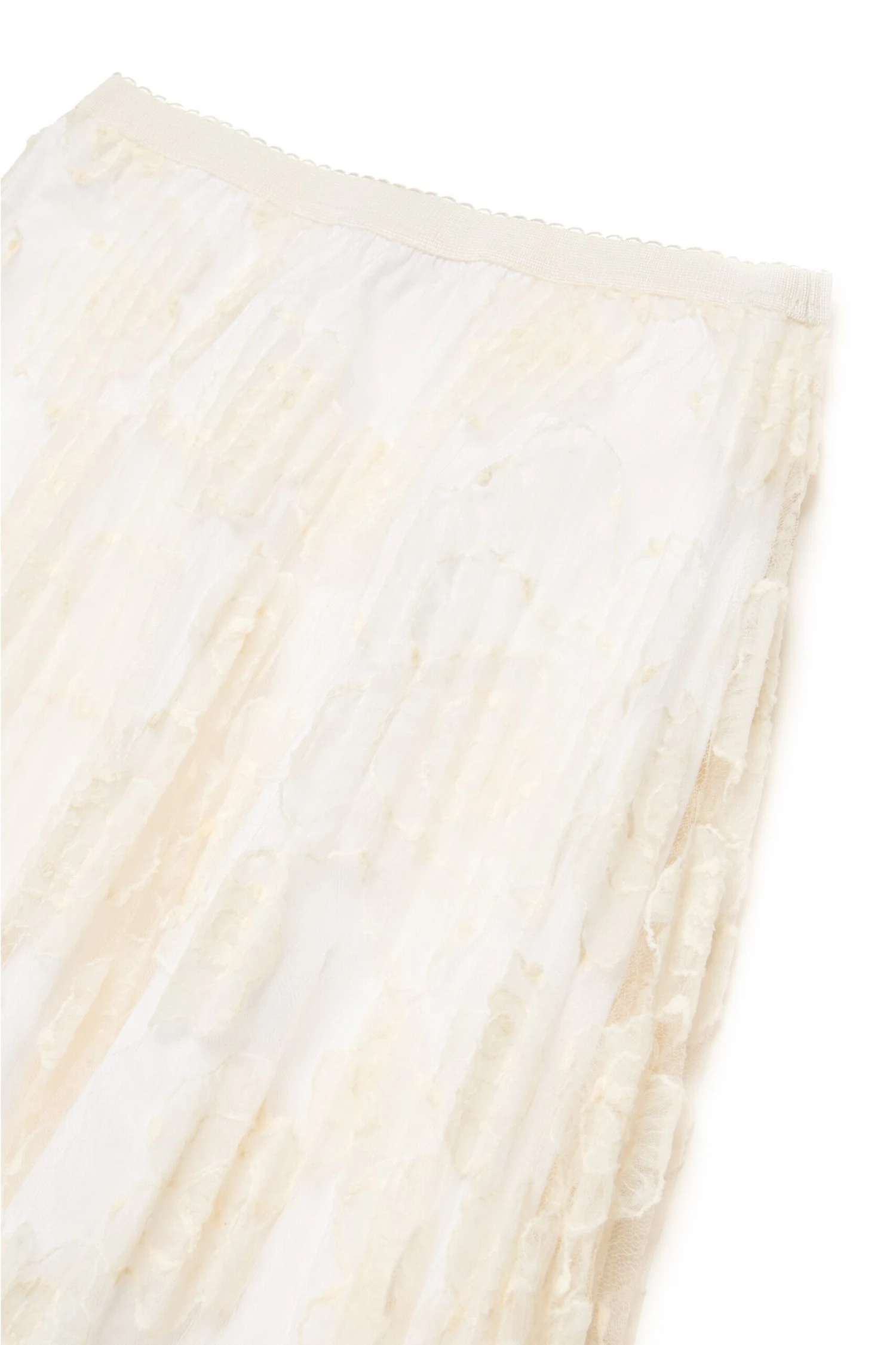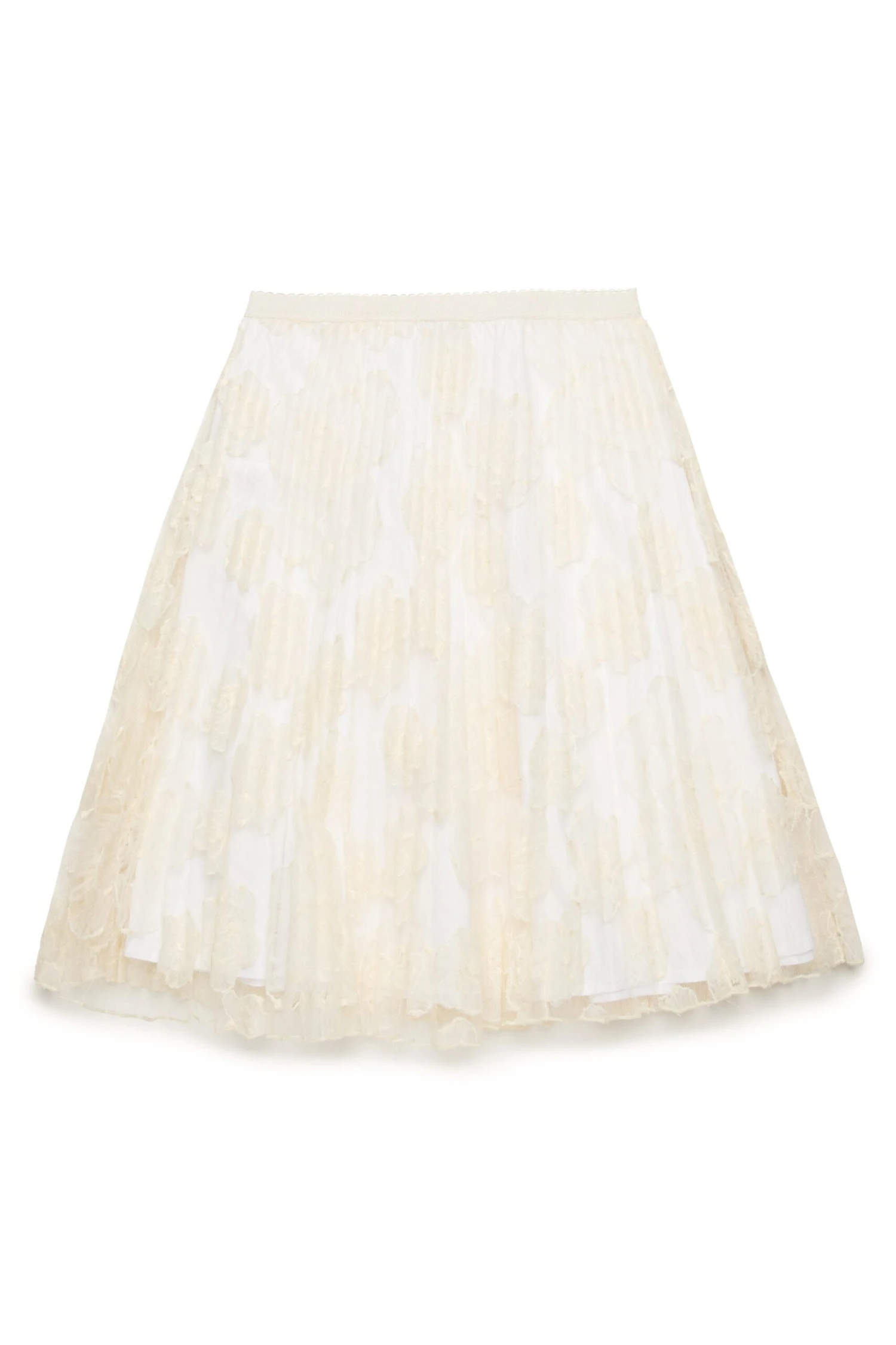 Soleil pleated midi skirt. Elasticated waist with lace hem. Multilayer construction. Outer layer in floral-embroidered organza. Poplin inner lining with Label N°21 applied on the front. A perfect garment for ceremonies and special occasions.