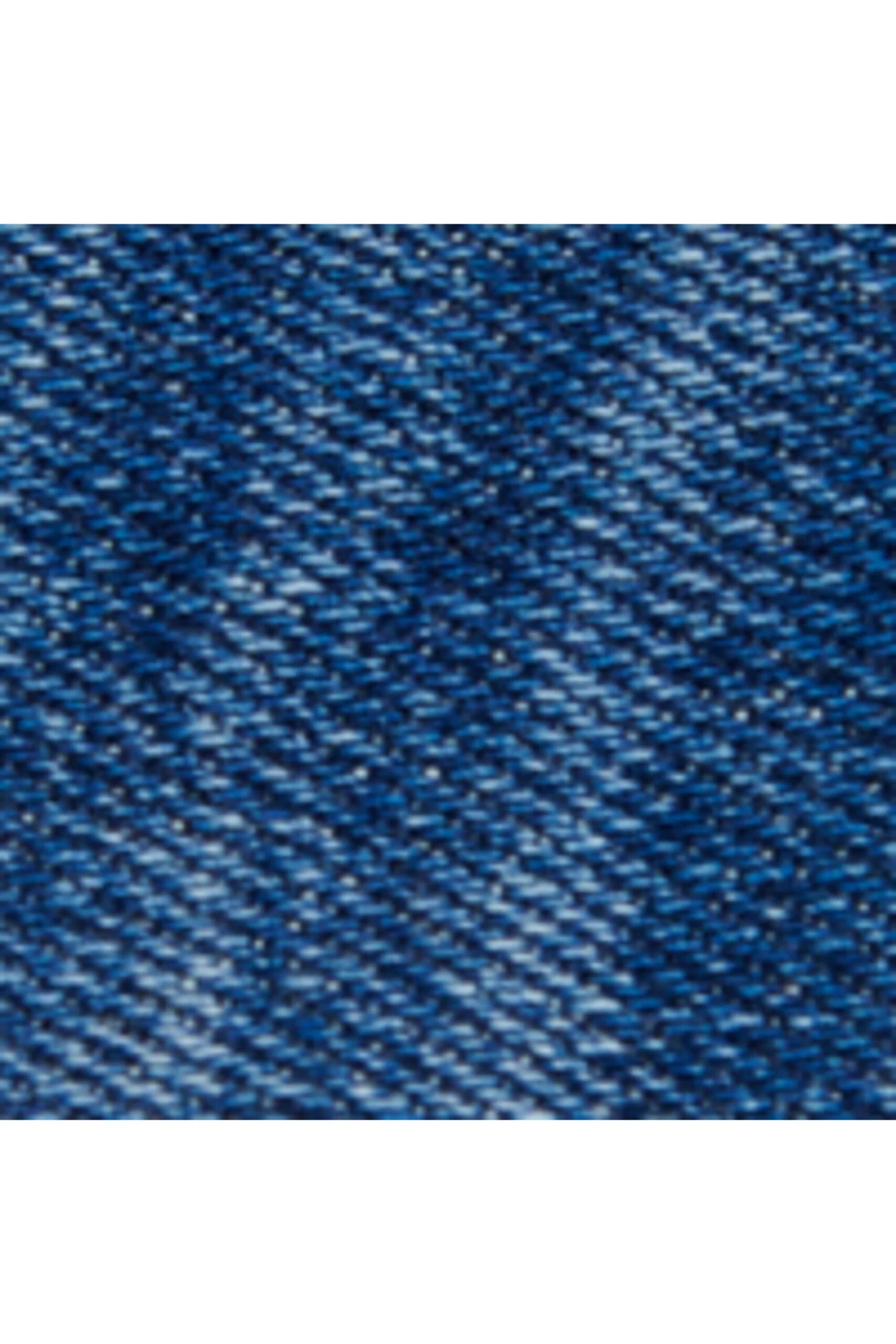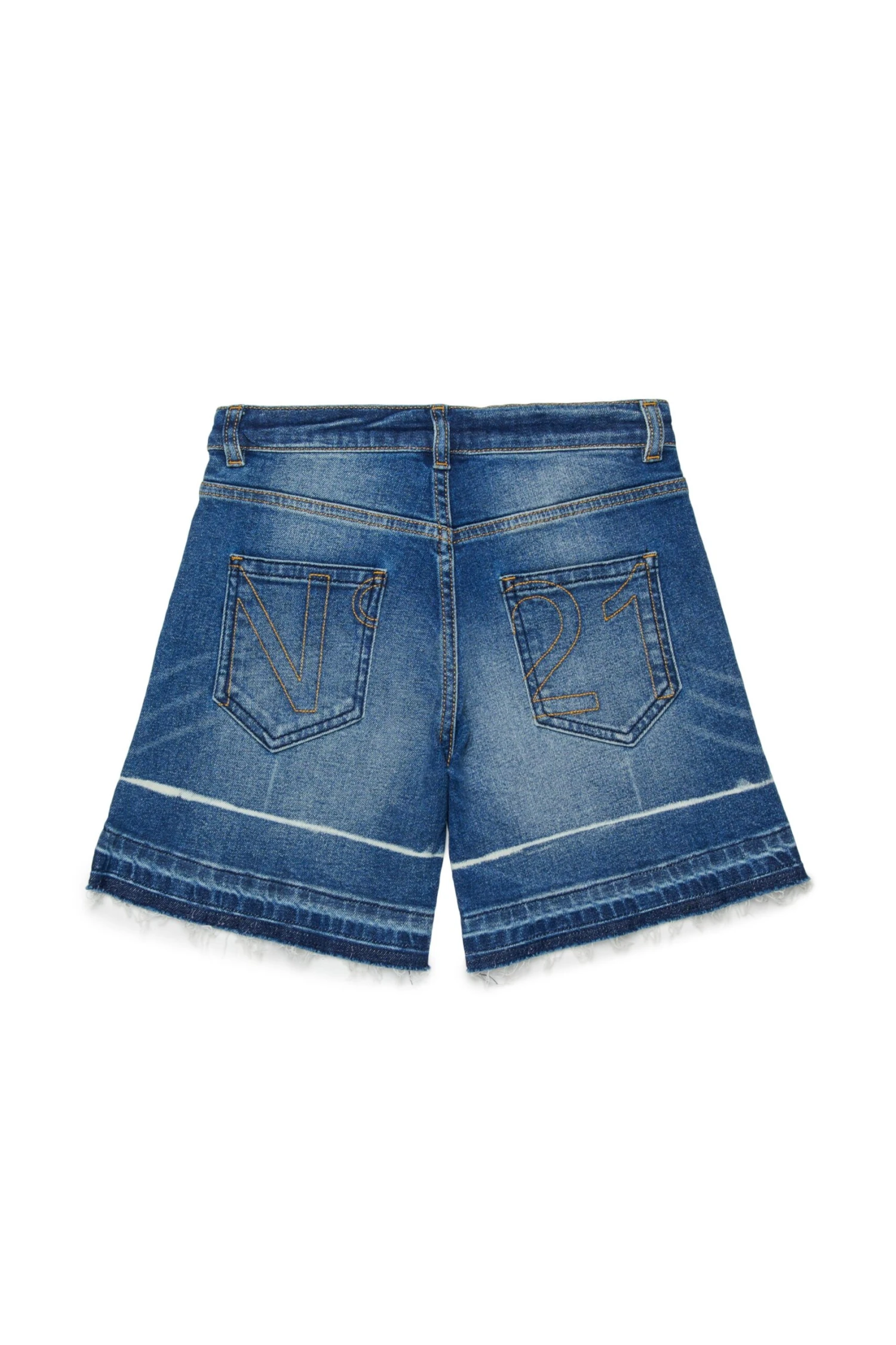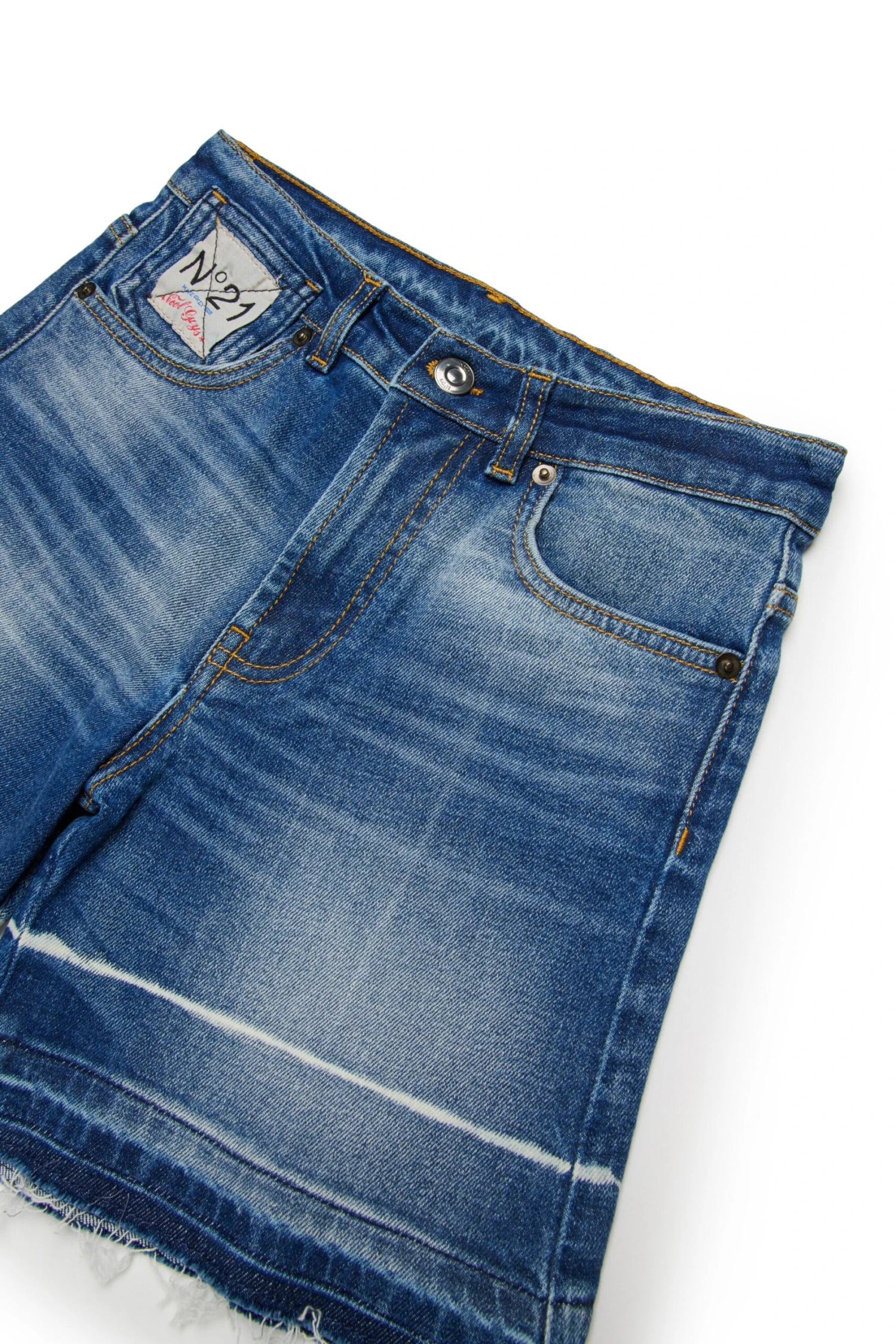 Short pants made of mid-blue worn-effect denim with stripes. color contrast stitching. Raw cut hem at the bottom. Label N°21 on the inside of one of the front pockets.