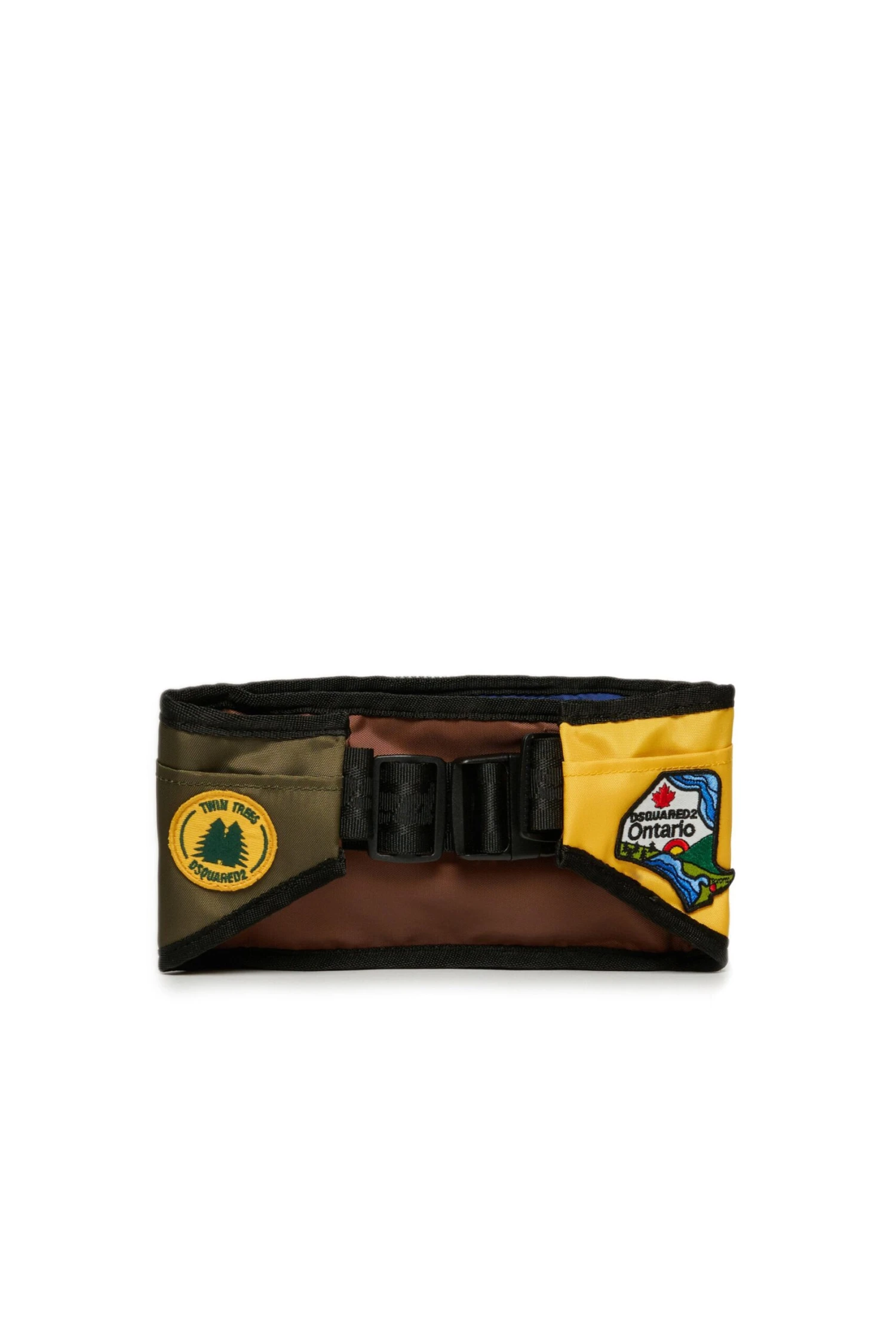 Fanny pack with colorblock details. Personalised with various patches, including ‘Invicta Dsquared2’ lettering applied to the front. Equipped with main compartment and pockets with velcro closure.