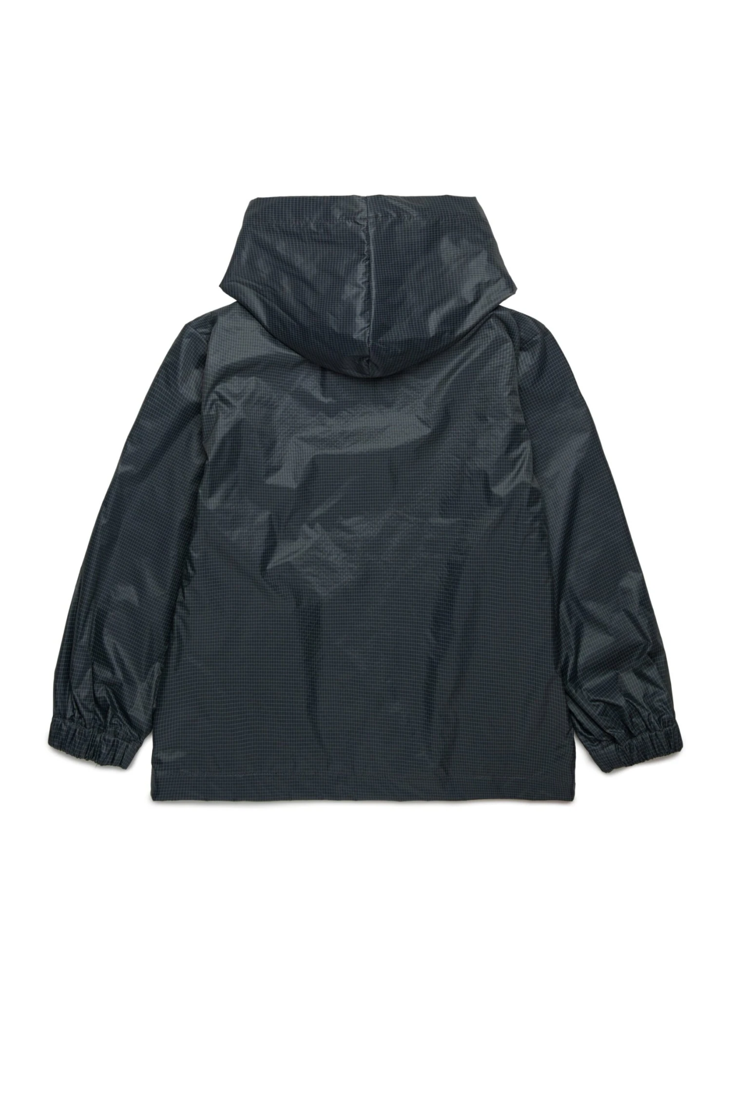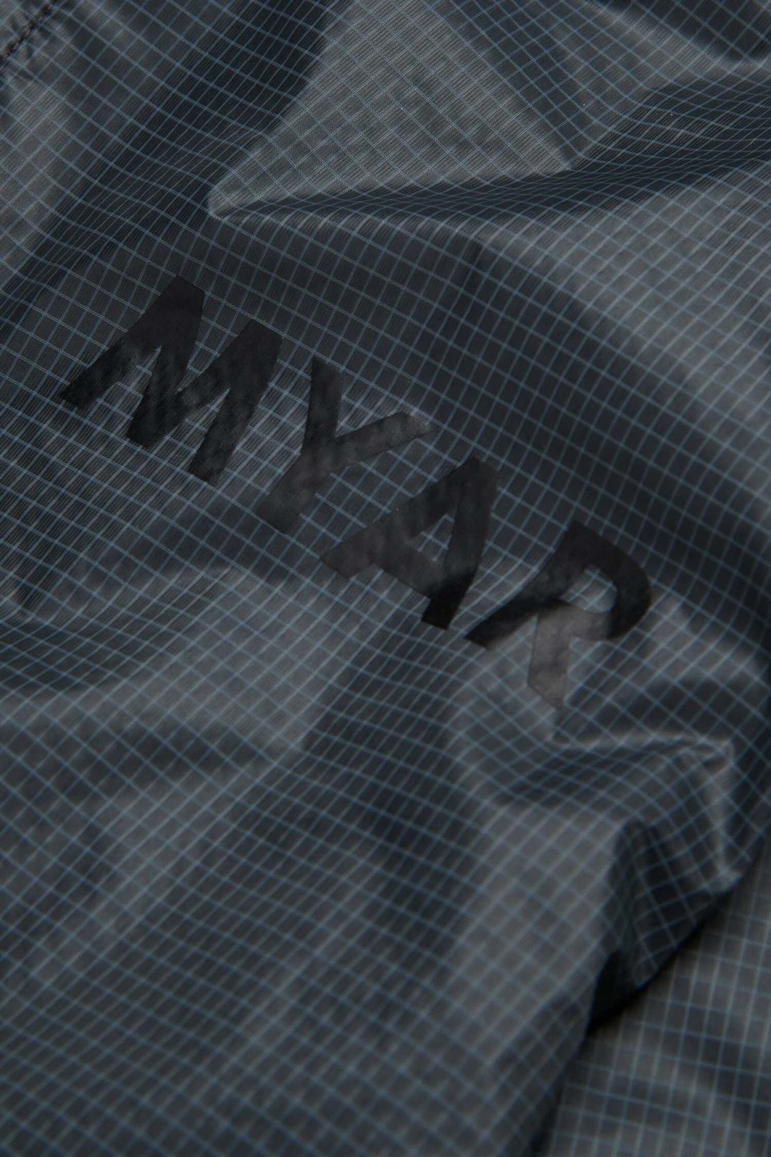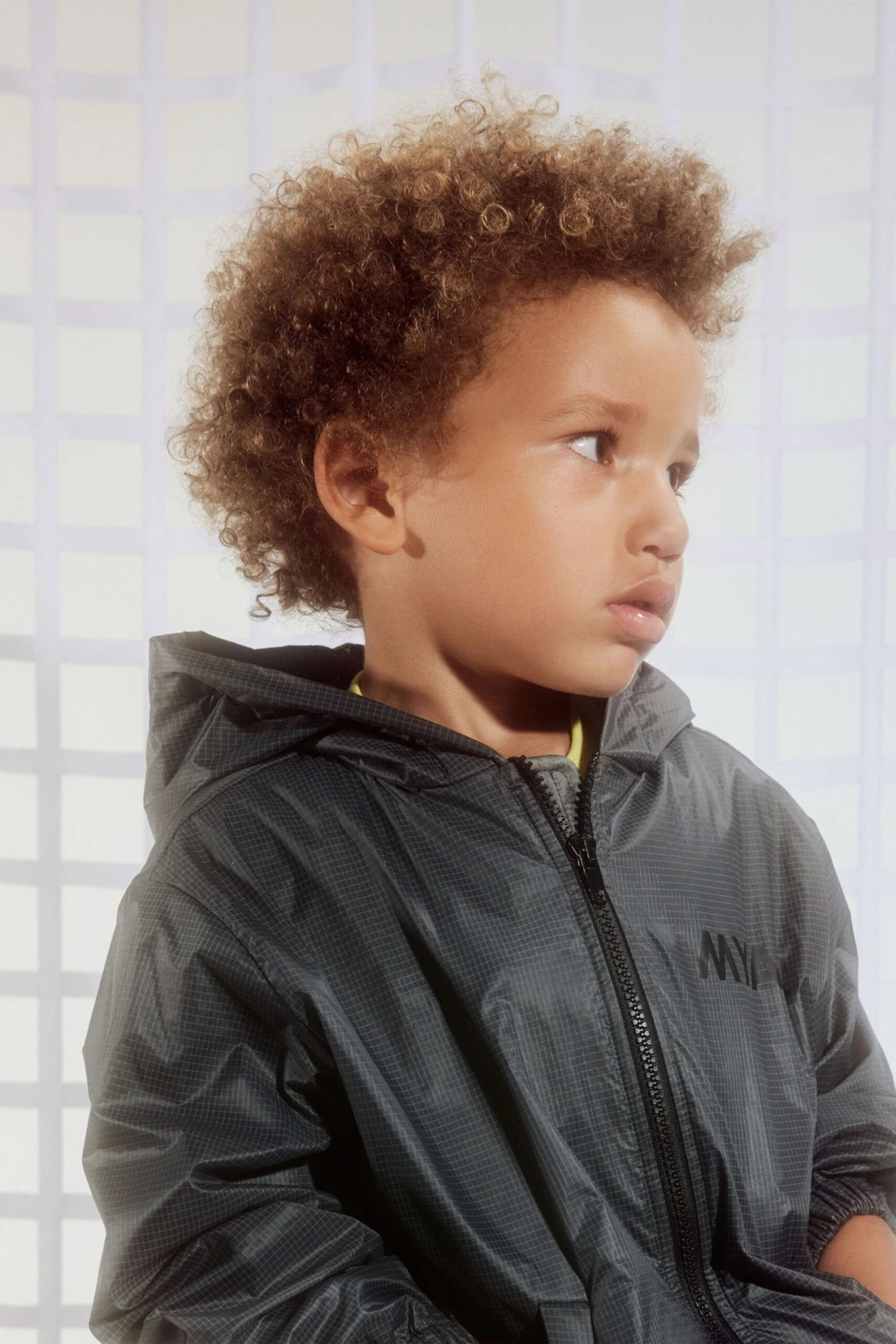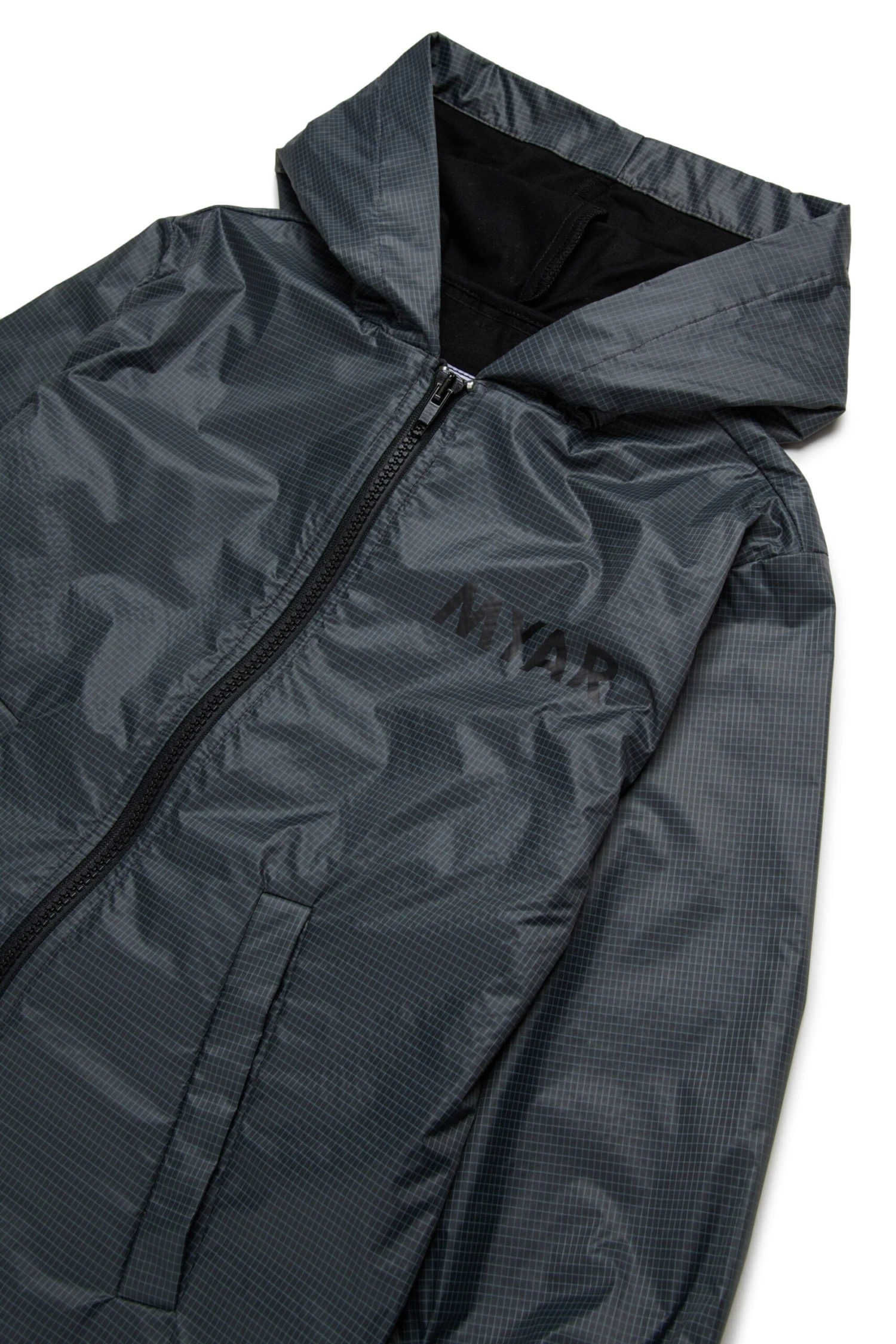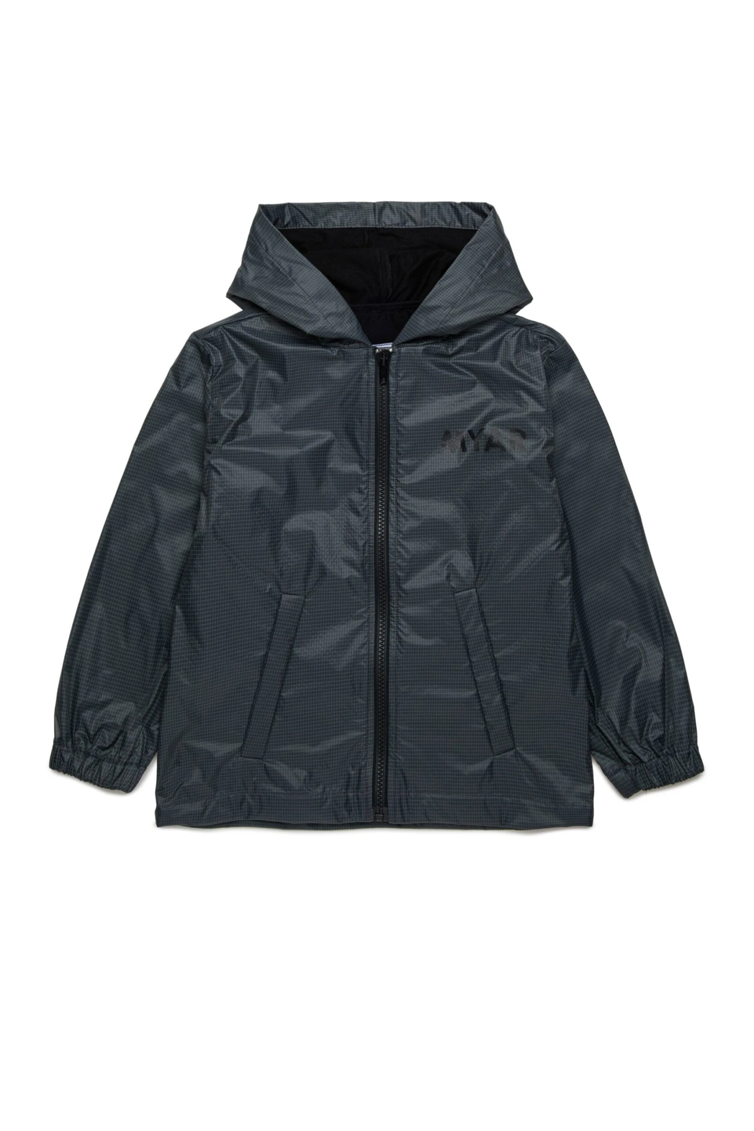 Wind breaker jacket with hood, made of transparent ripstop fabric coupled with cotton jersey lining, both coming from deadstock. Die-cast zip closure and welt pockets on the front. mYAR logo applied with transfer on the front side of the heart.